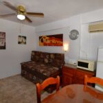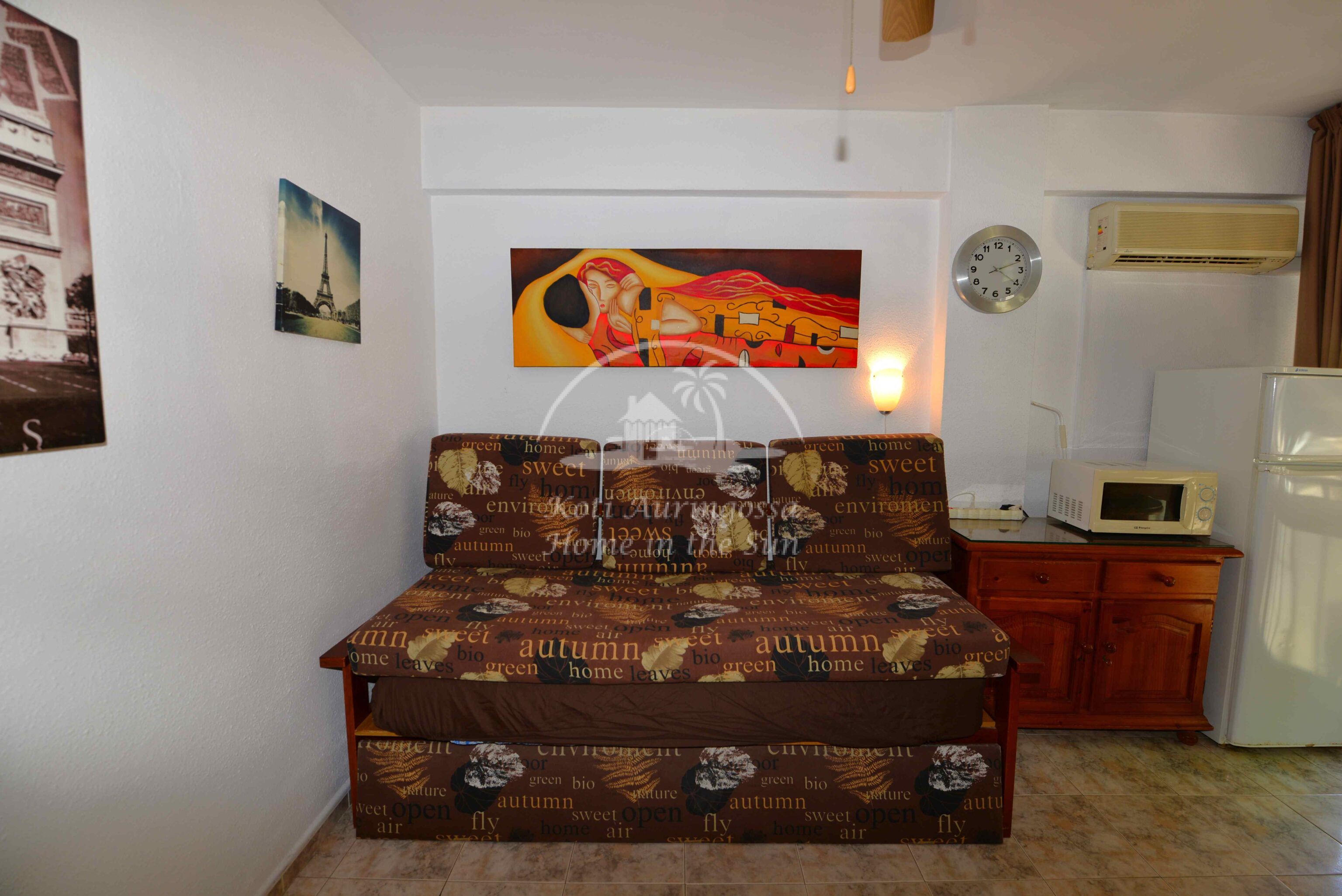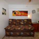 Valoisa olohuone ja ruokailutila. Olohuoneessa on vuodesohva. Avokeittiö. 1 makuuhuone.