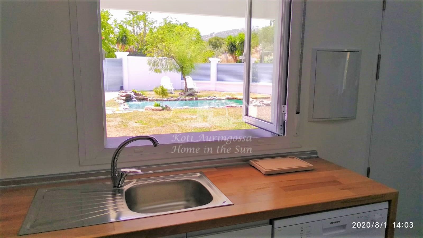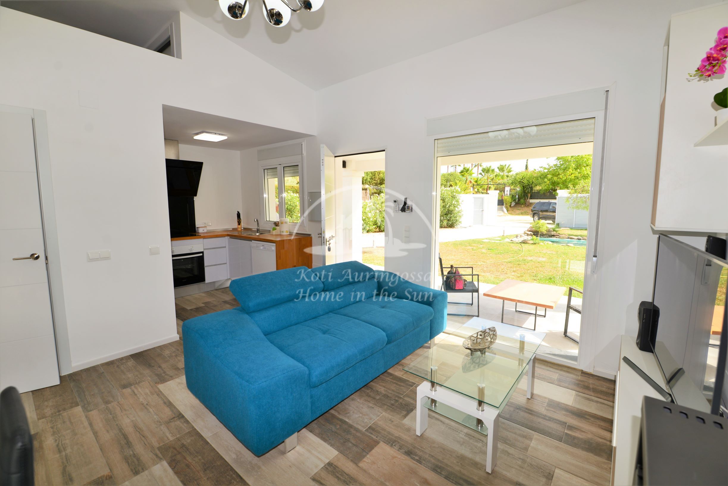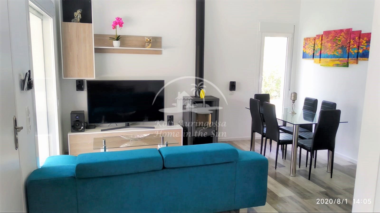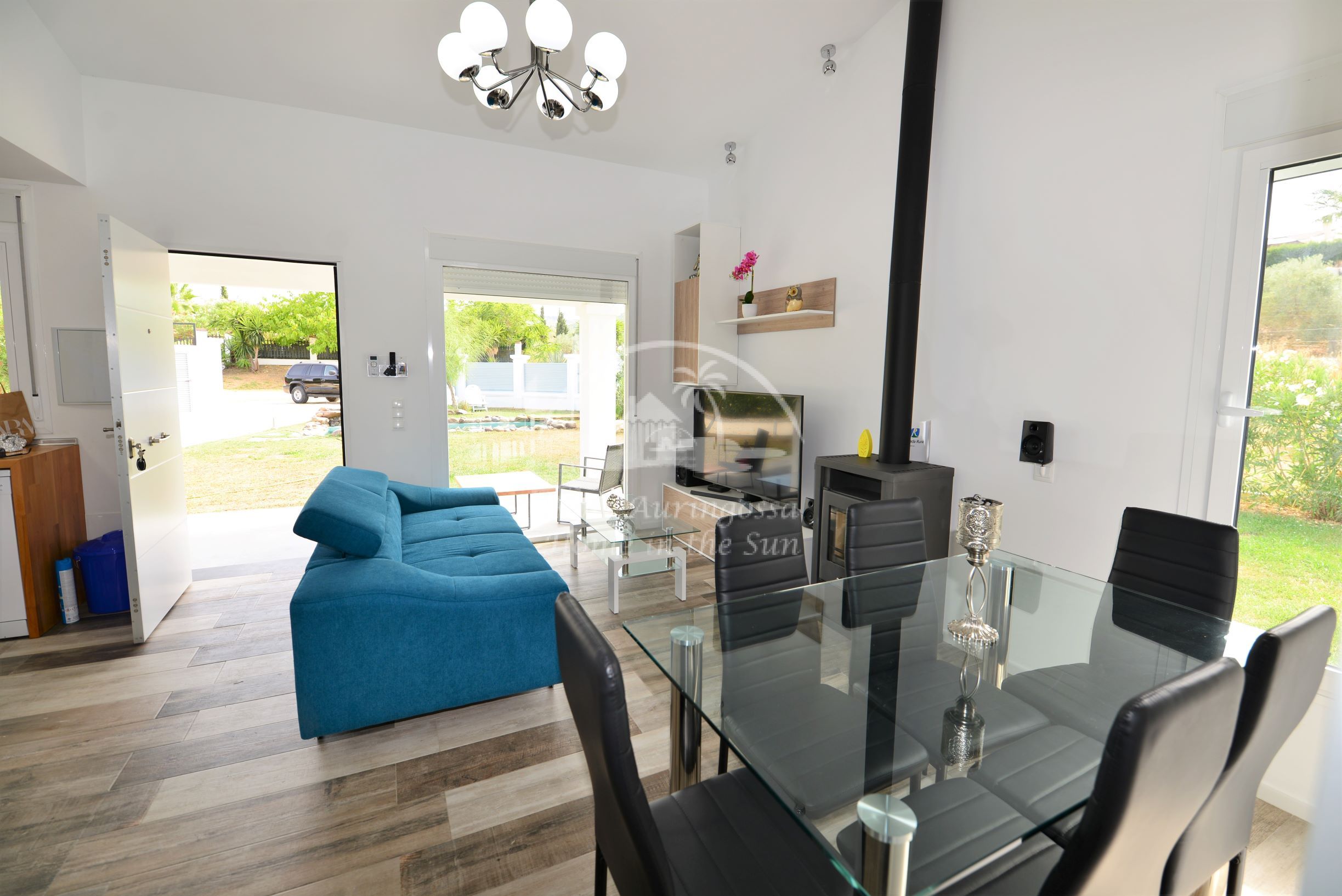 Talo sijaitsee rauhallisessa maalaismiljöössä, keskellä suurta vehreää tonttia, joka on kokonaan aidattu. Valoisa olohuone ja ruokailutila takalla. Moderni keittiö, jossa astianpesukone ja hyvä integroitu uuni.