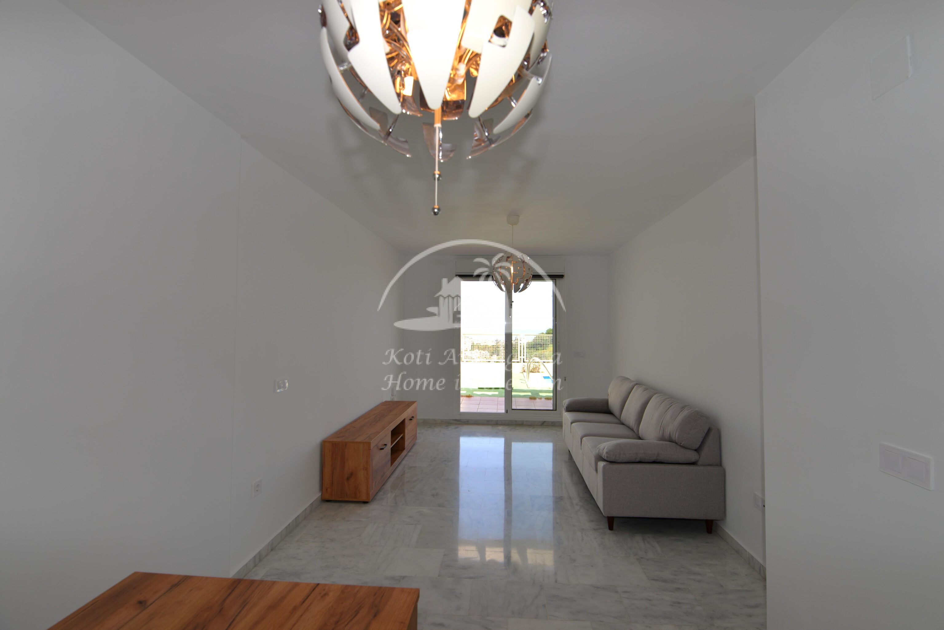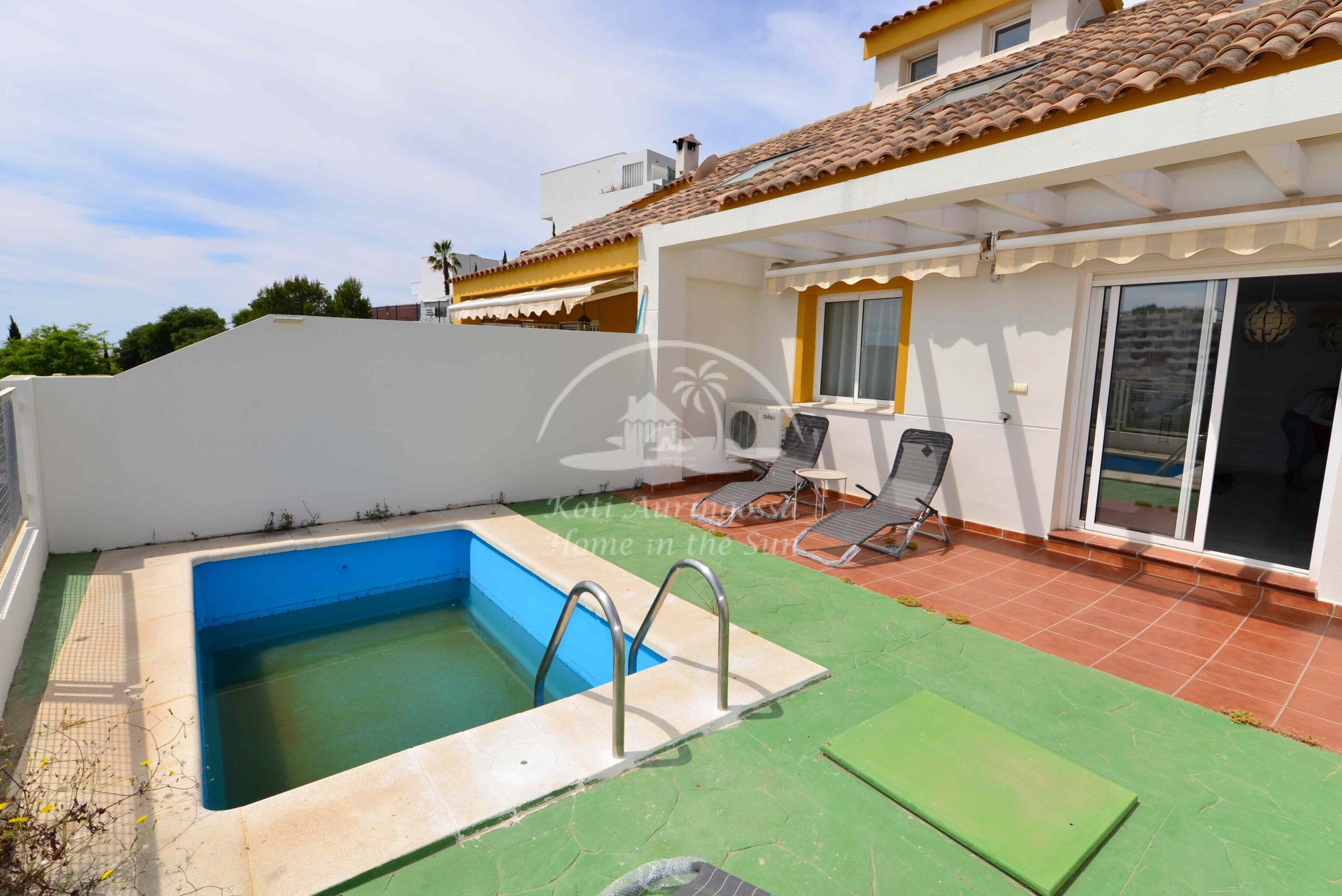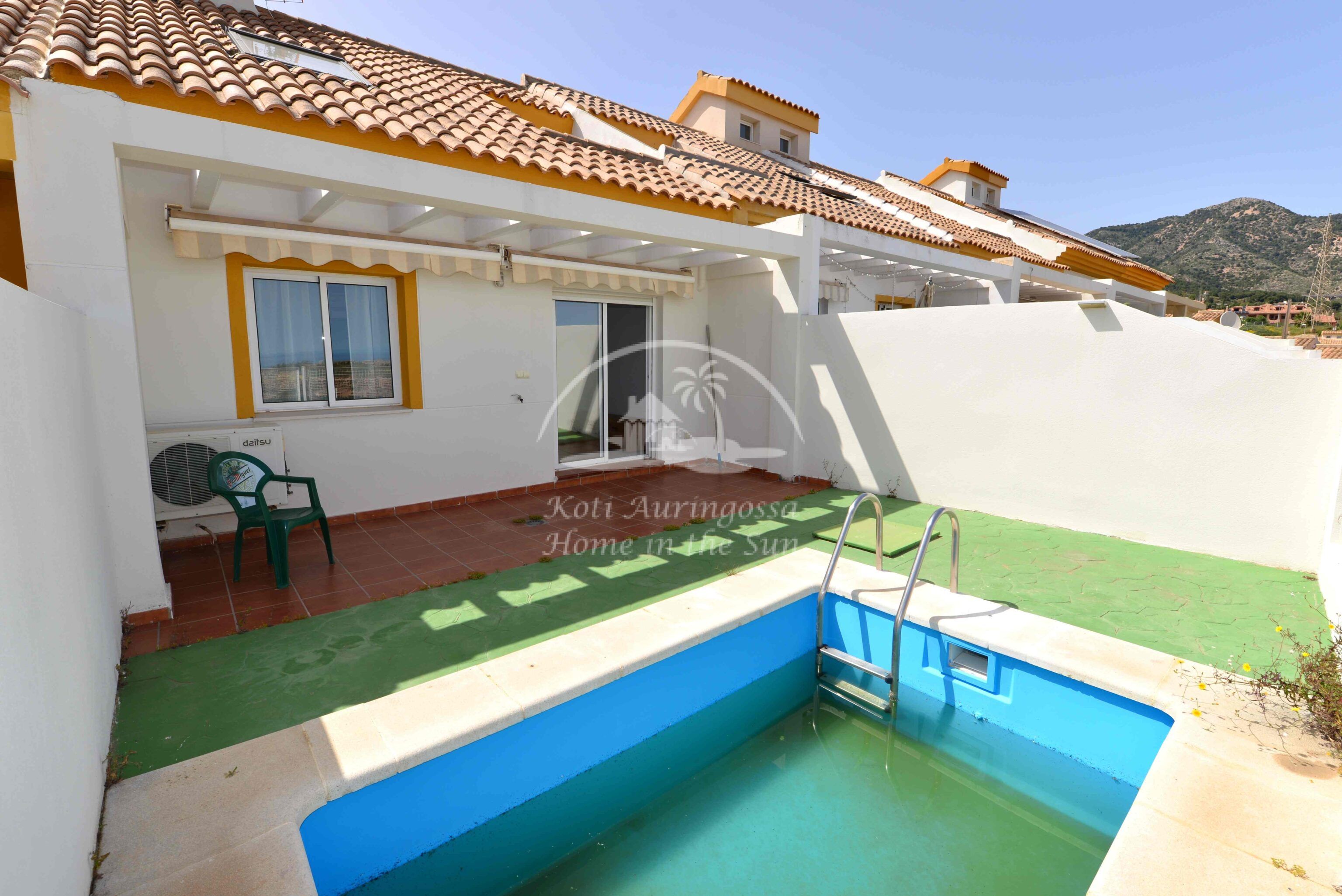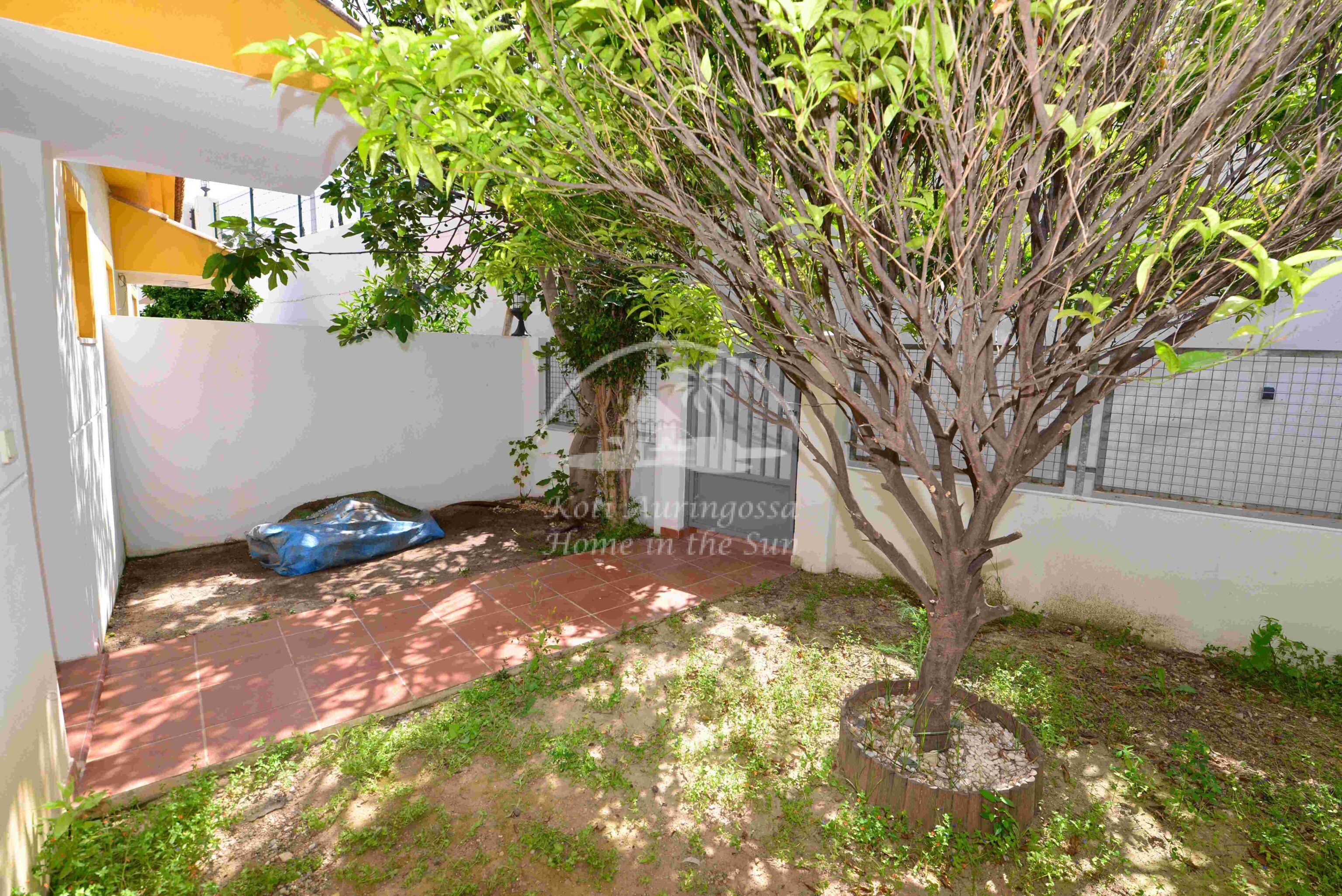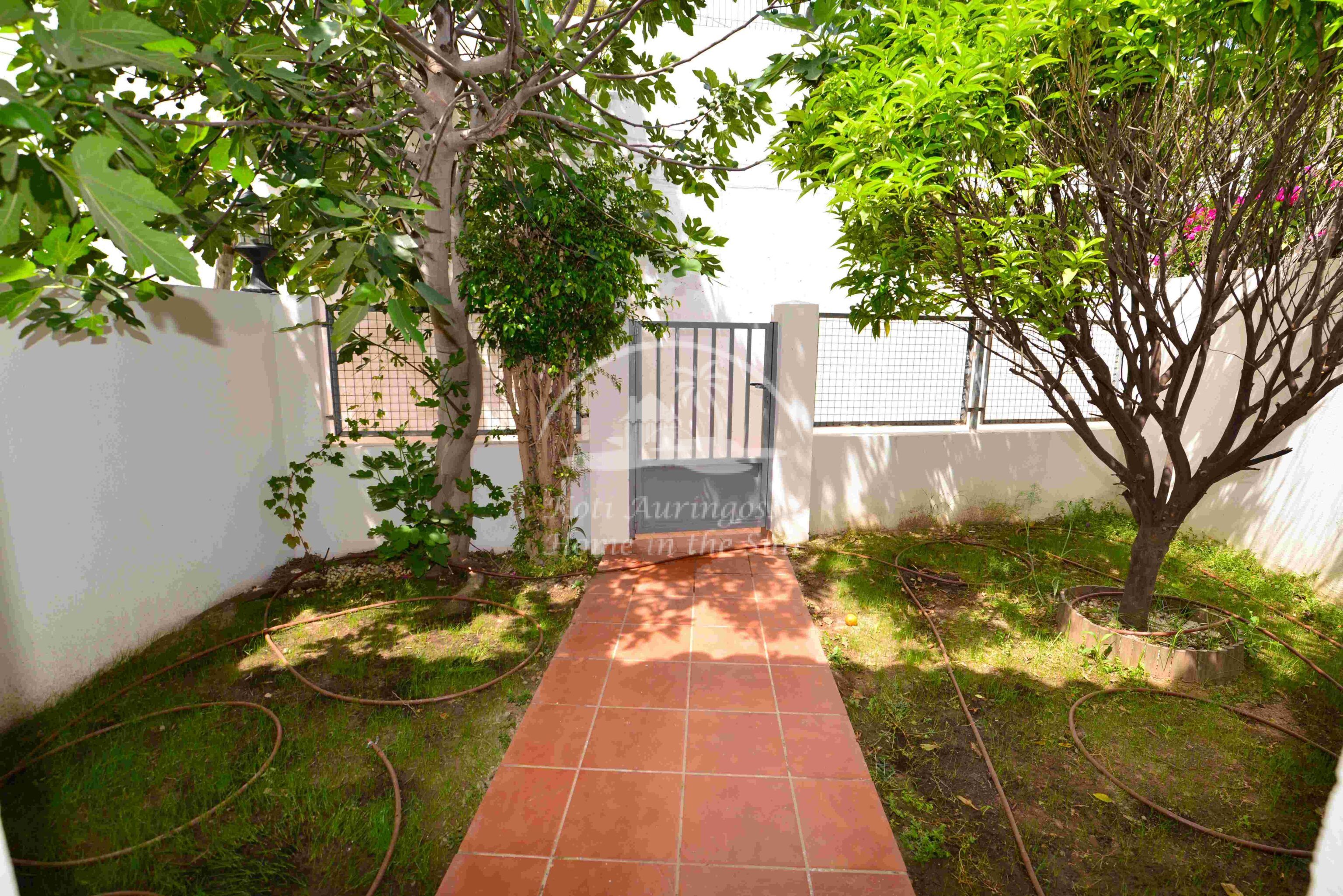 Tämä kolme kerroksinen valoisa paritalo, on osittain kalustettu. Omistaja kalustaa sen vuokralaisen toiveitten ja tarpeen mukaan. Sisään tulon yhteydessä on kiva pikku puutarha, jossa mandariini ja viikuna puut. Keskikerroksessa on avara valoisa olohuone ja ruokailutila. Olohuoneesta on käynti aurinkoiselle etelään päin olevalle terassille. Terassilla on kiva pieni allas. Erillinen tilava keittiö.