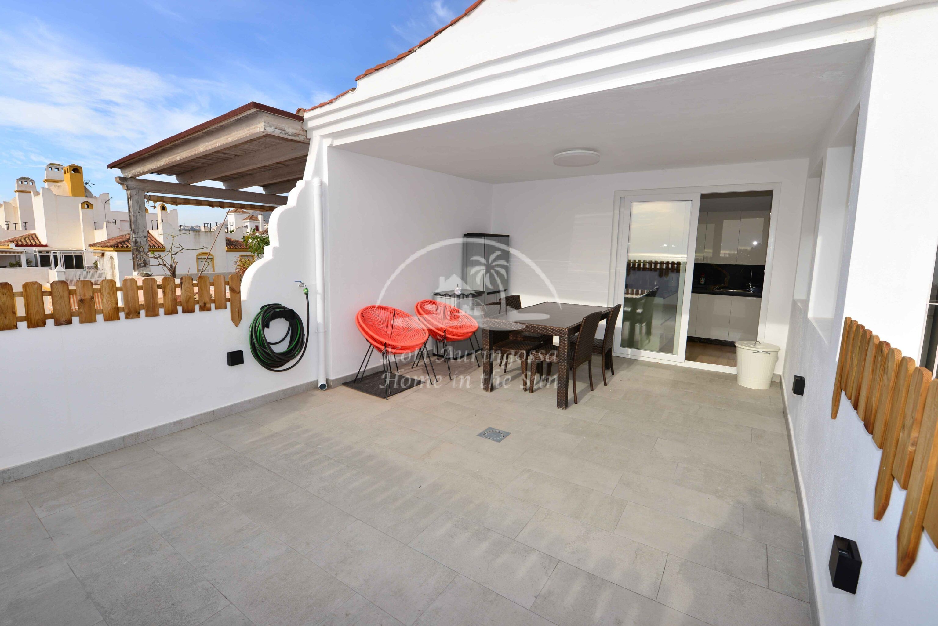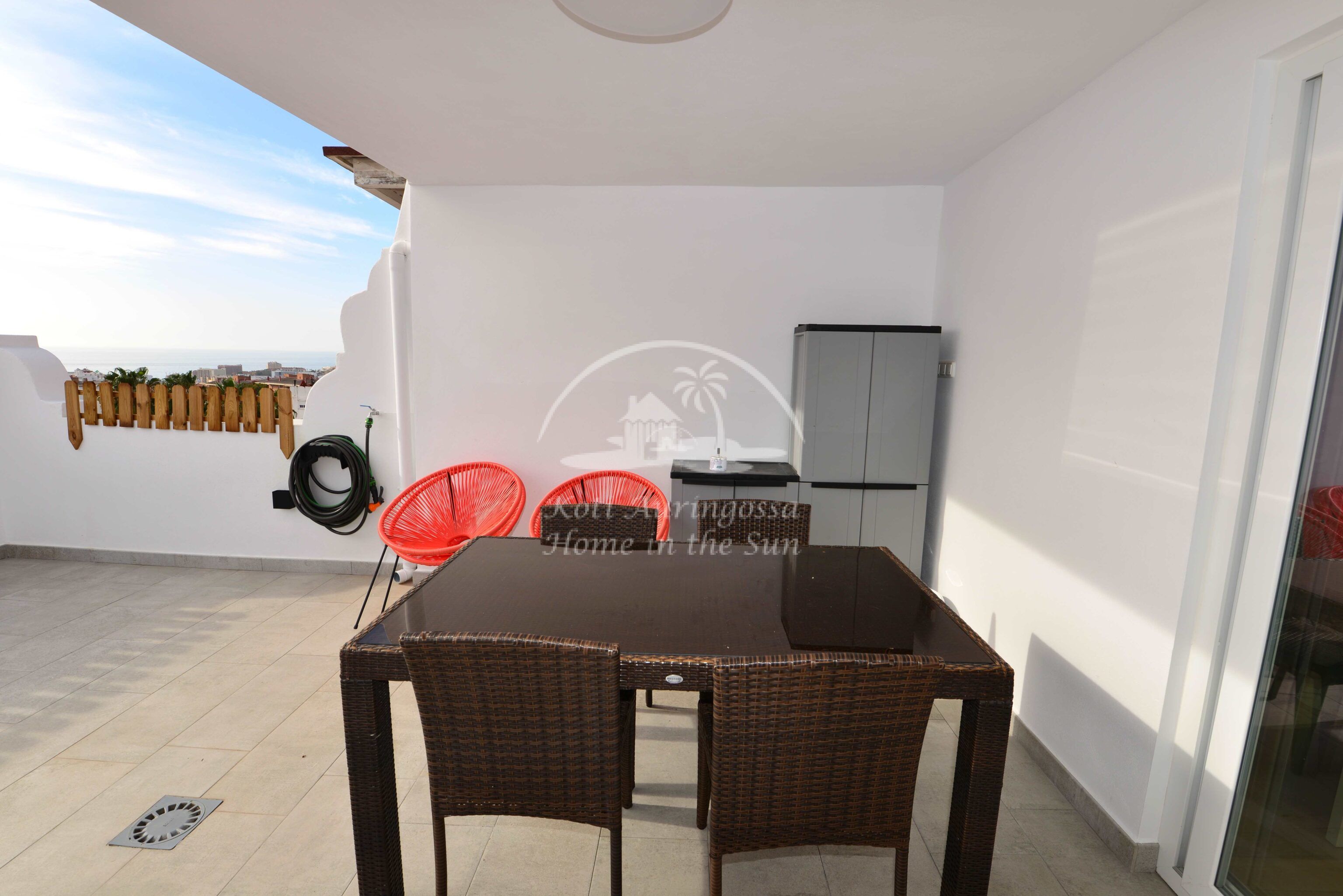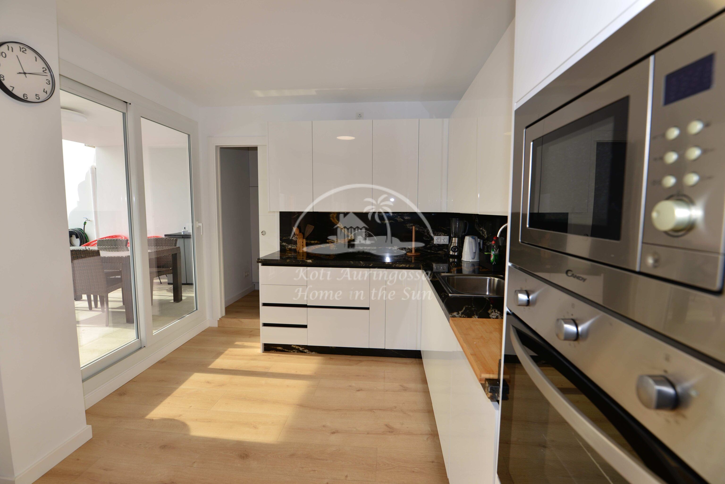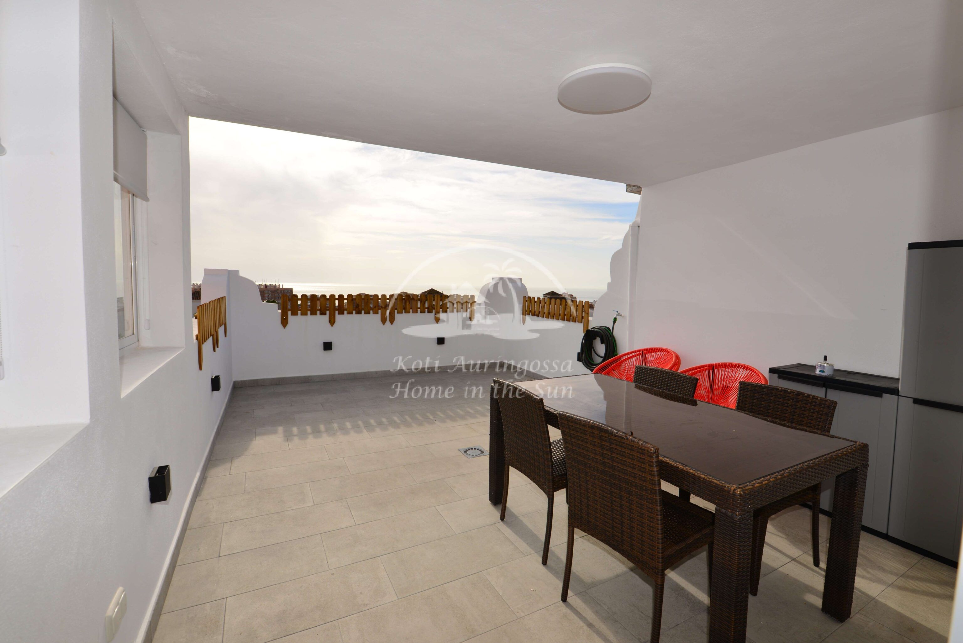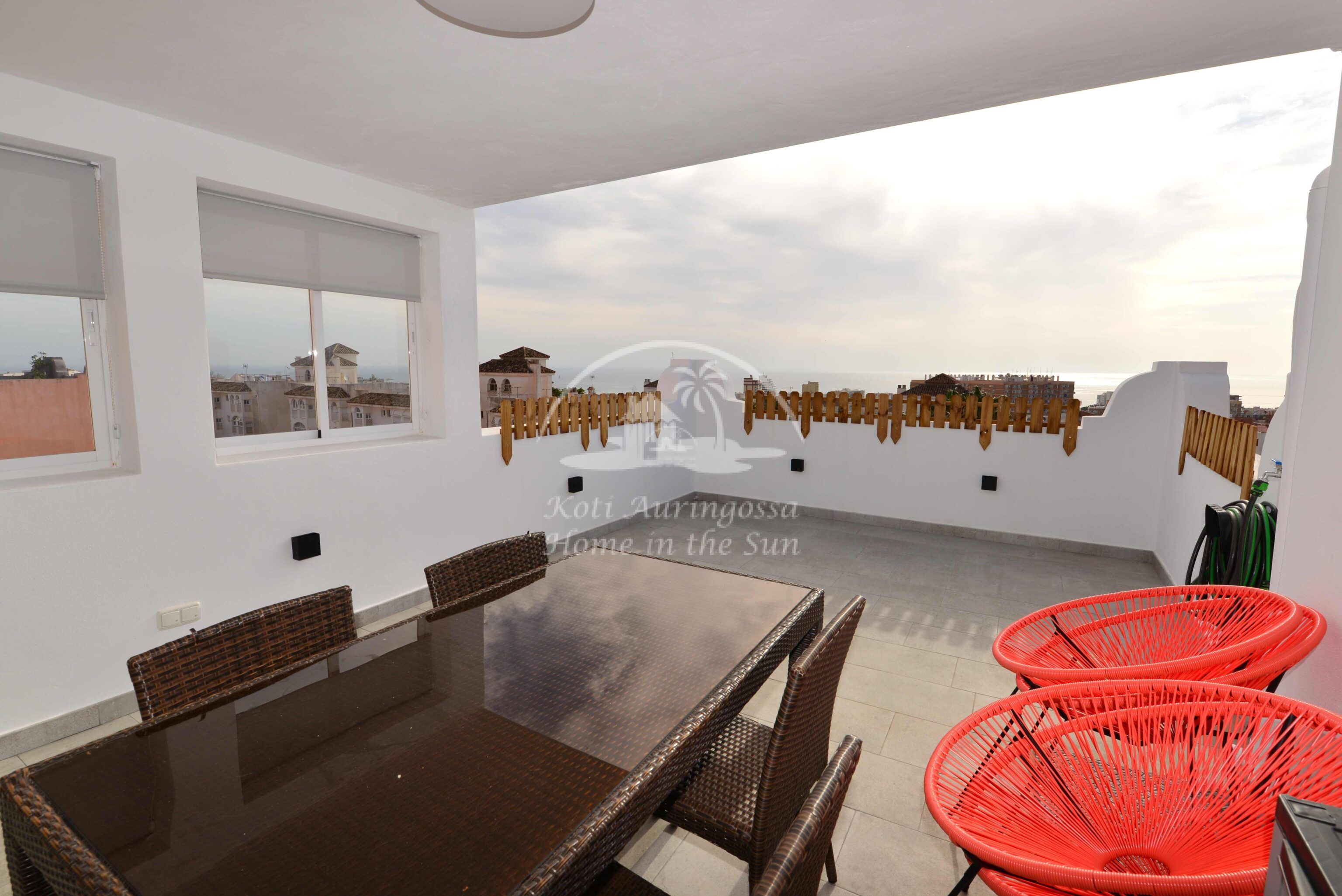 olevalle aurinkoiselle terassille, josta hienot avarat näkymät merelle asti. 3 makuuhuonetta.