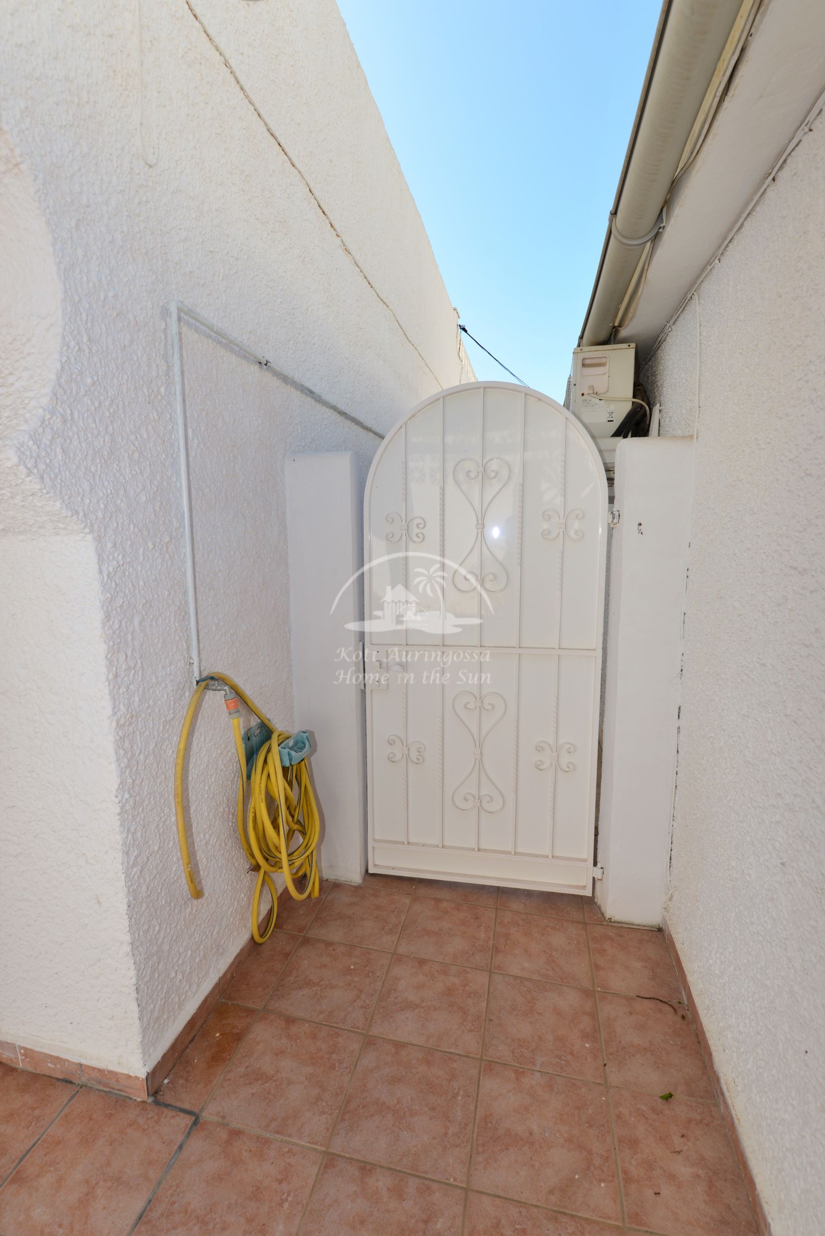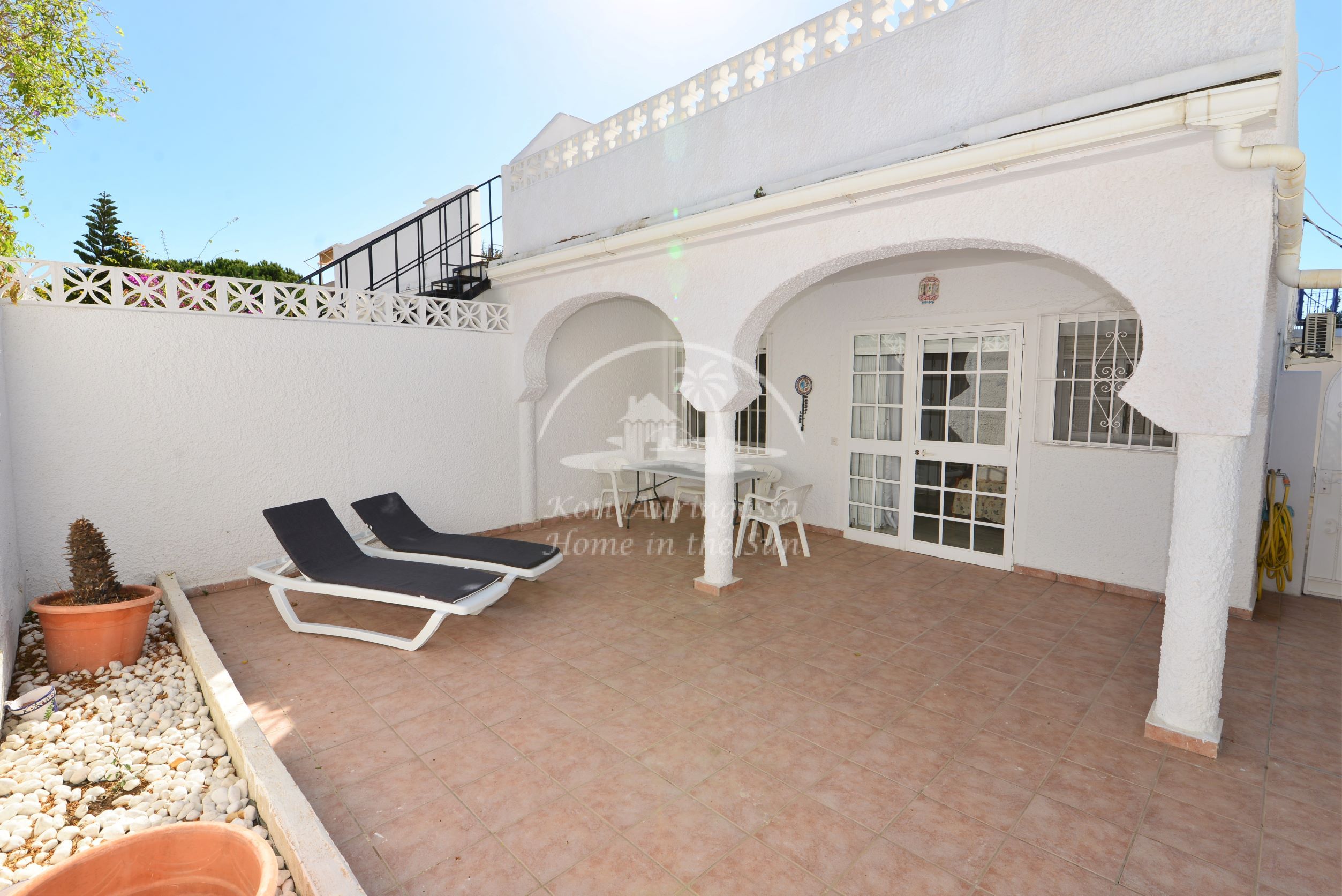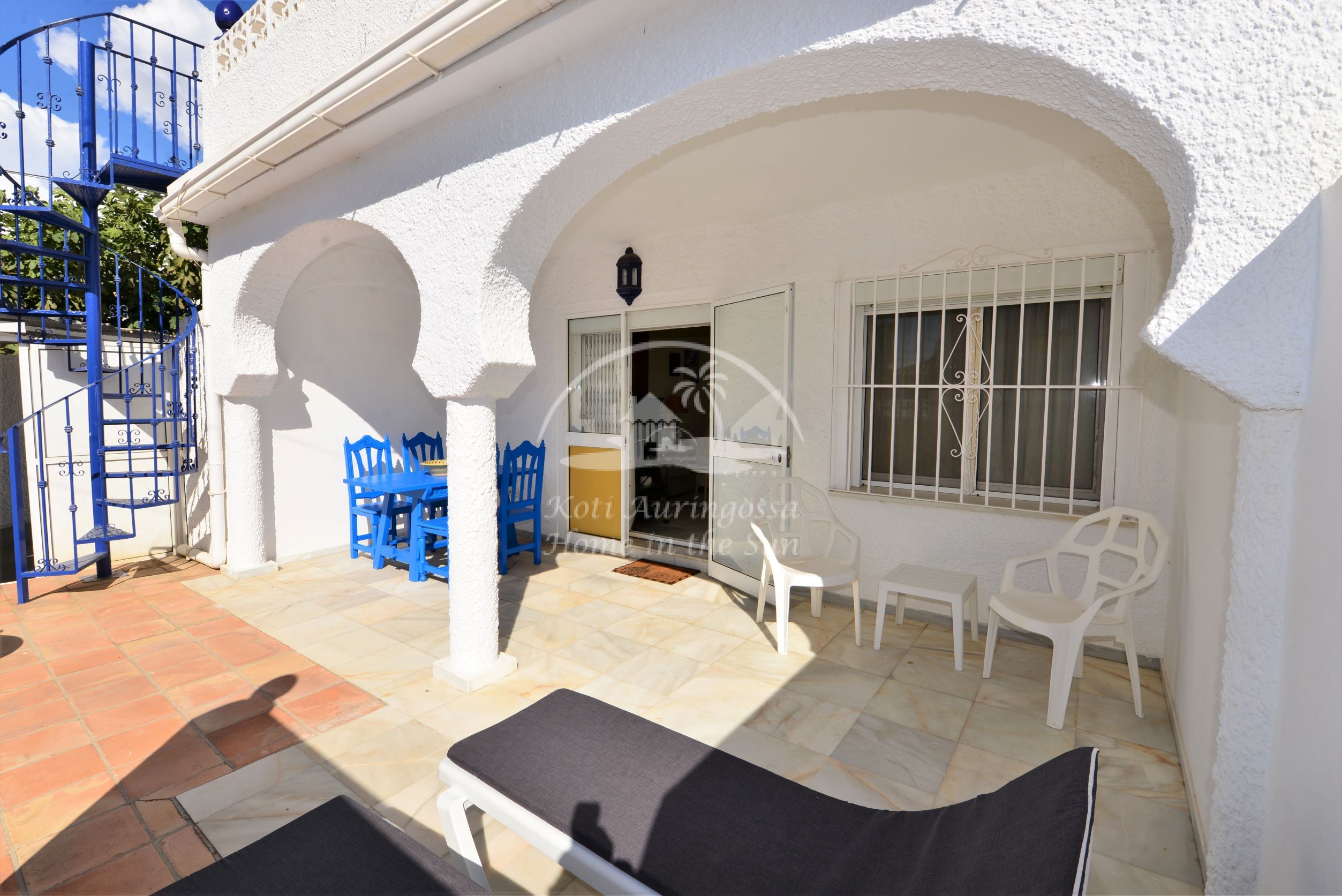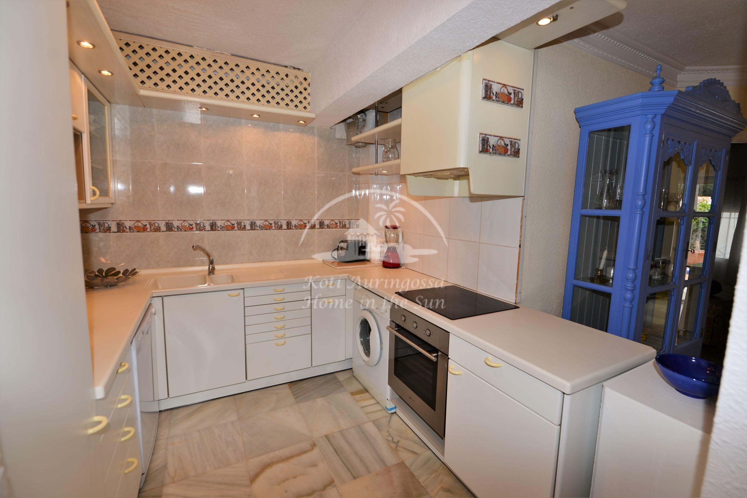 Valoisa olohuone ja ruokailutila. Olohuoneesta on käynti etelään päin olevalle osittain katetulle terassille. Moderni amerikkalainen keittiö jossa on myös astianpesukone ja uusi kiertoilma uuni. 2 makuuhuonetta. 2 kylpyhuonetta. Päämakuuhuoneesta on käynti pohjoiseen päin olevalle reilun kokoiselle suojaisalle sisäpatiolle.
