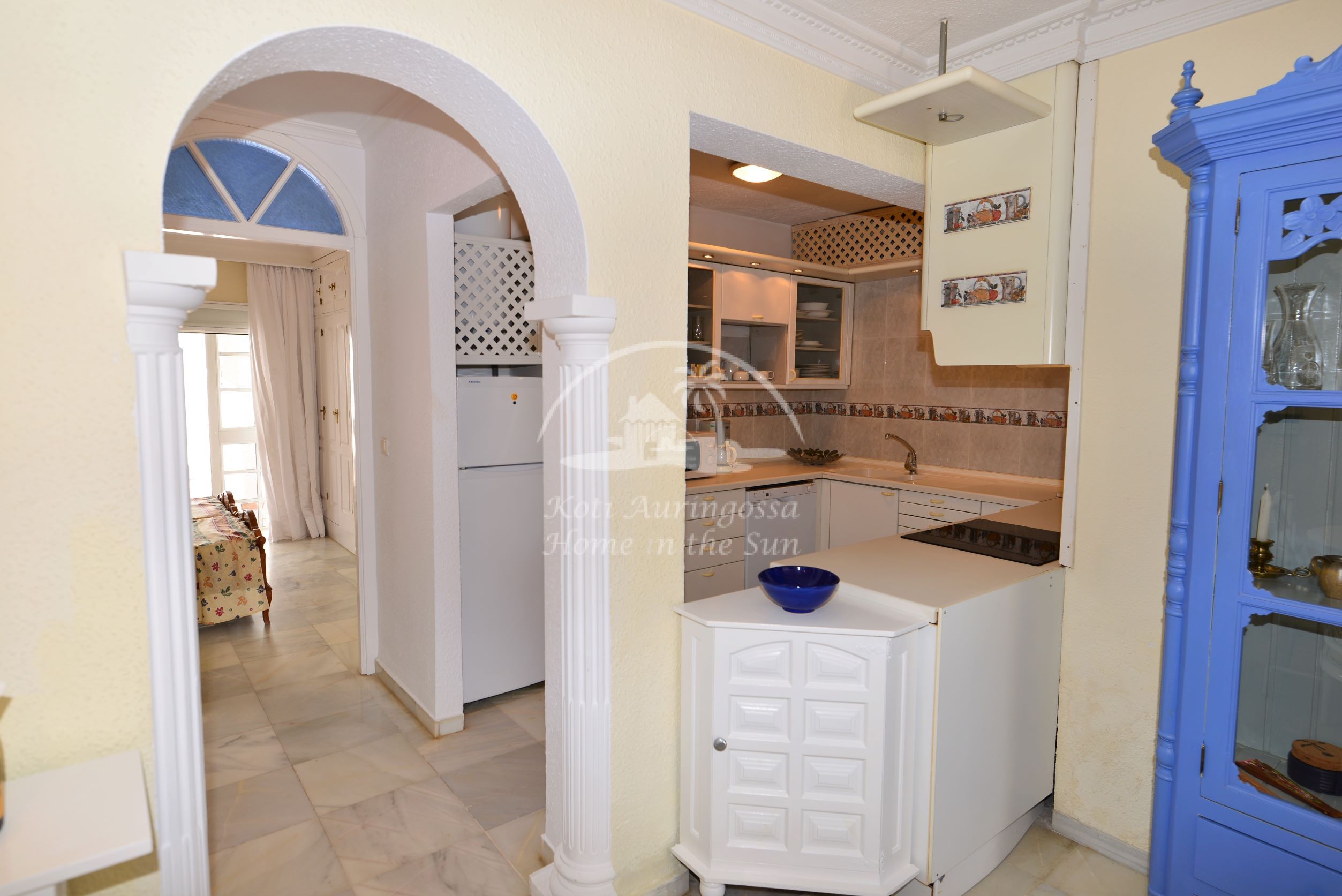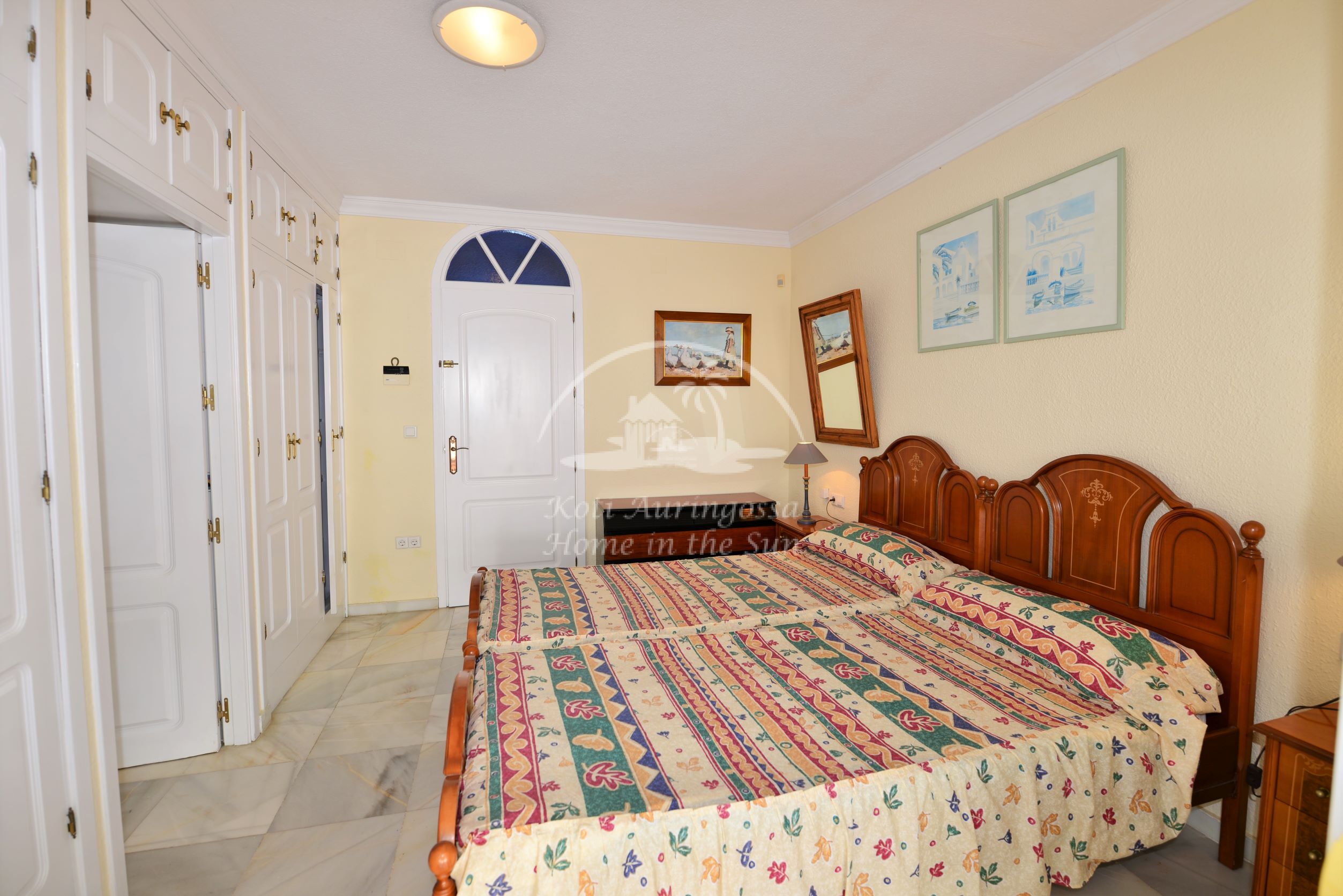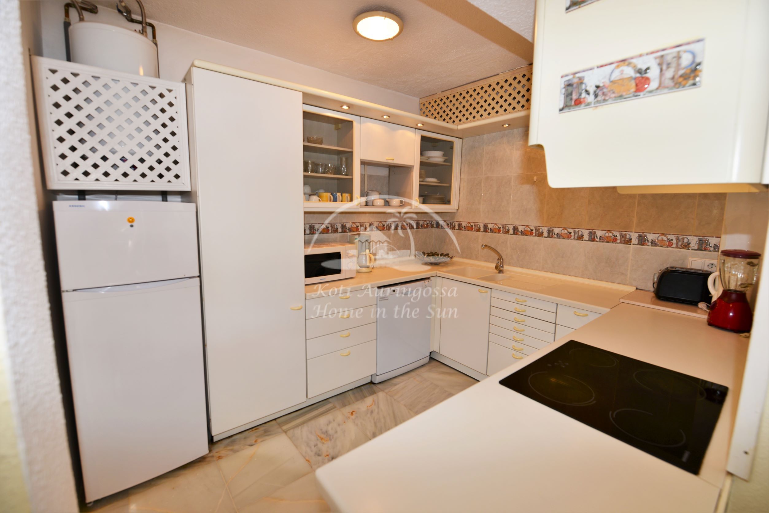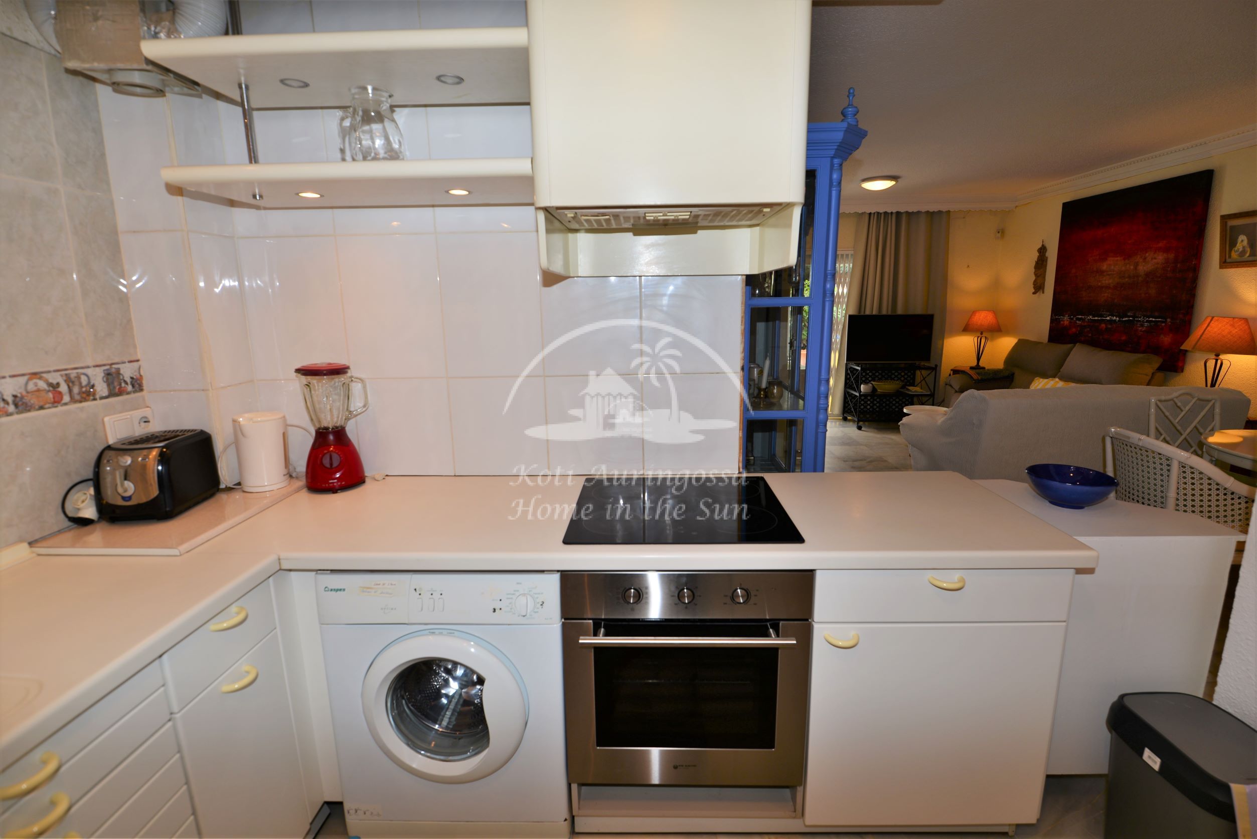 Valoisa olohuone ja ruokailutila. Olohuoneesta on käynti etelään päin olevalle osittain katetulle terassille. Moderni amerikkalainen keittiö jossa on myös astianpesukone ja uusi kiertoilma uuni. 2 makuuhuonetta. 2 kylpyhuonetta. Päämakuuhuoneesta on käynti pohjoiseen päin olevalle reilun kokoiselle suojaisalle sisäpatiolle.