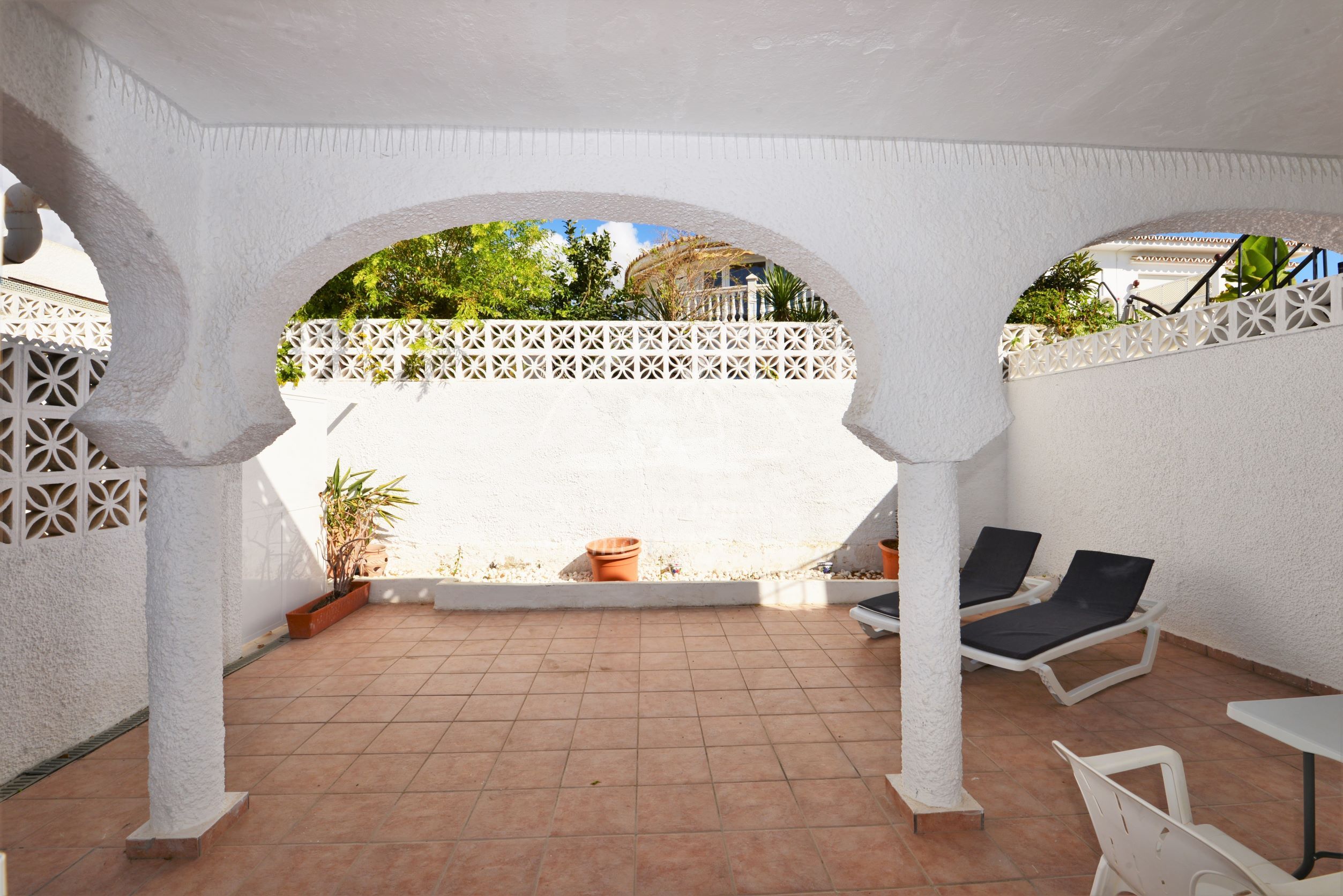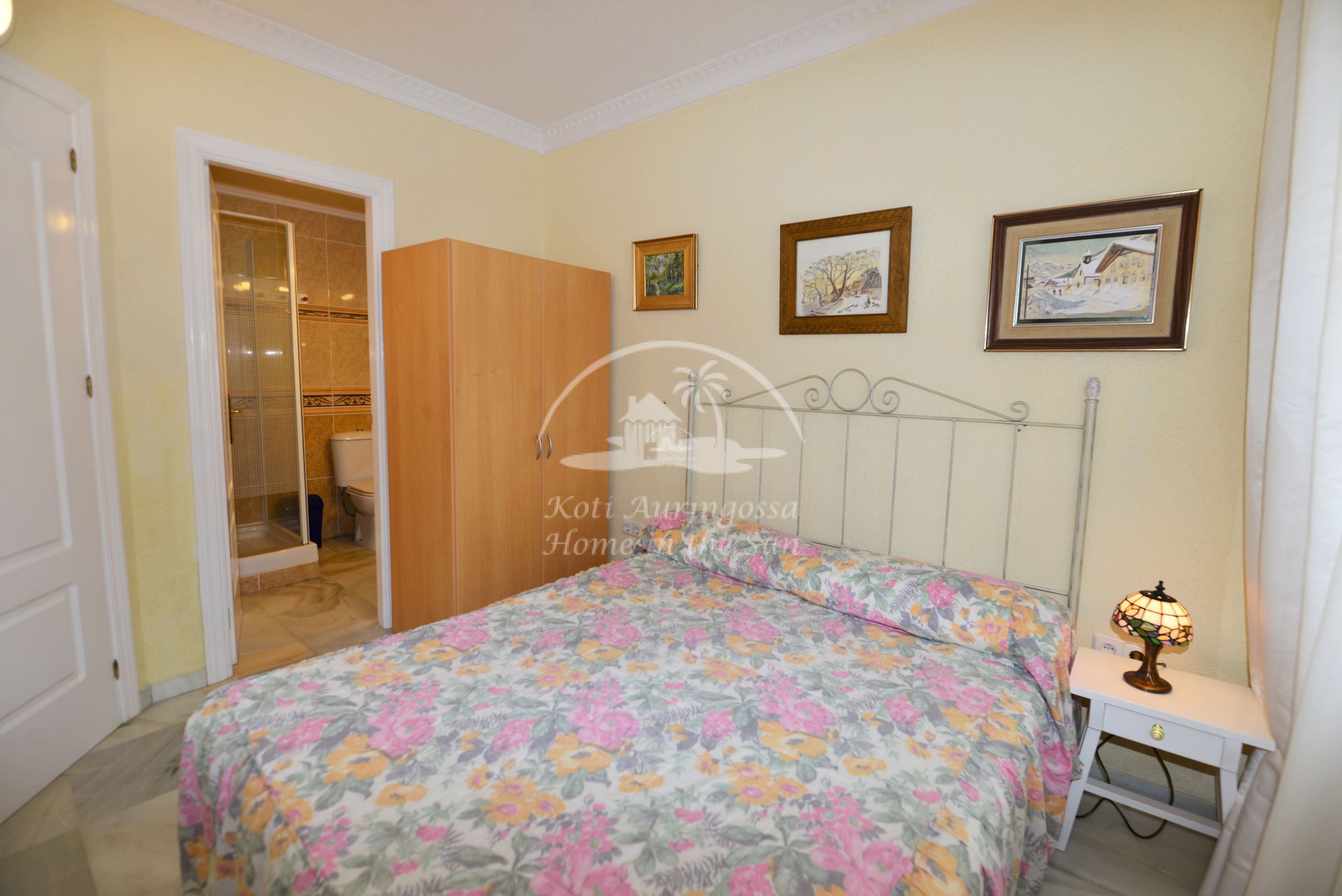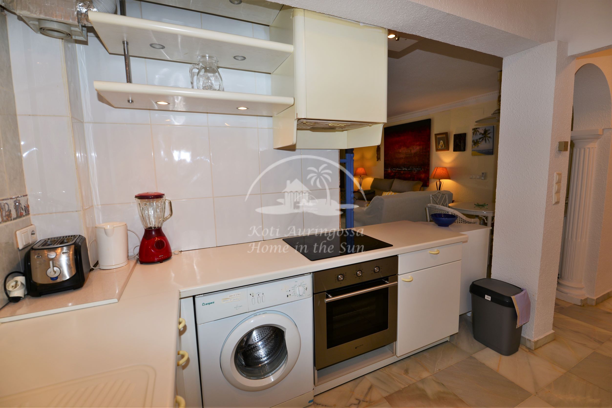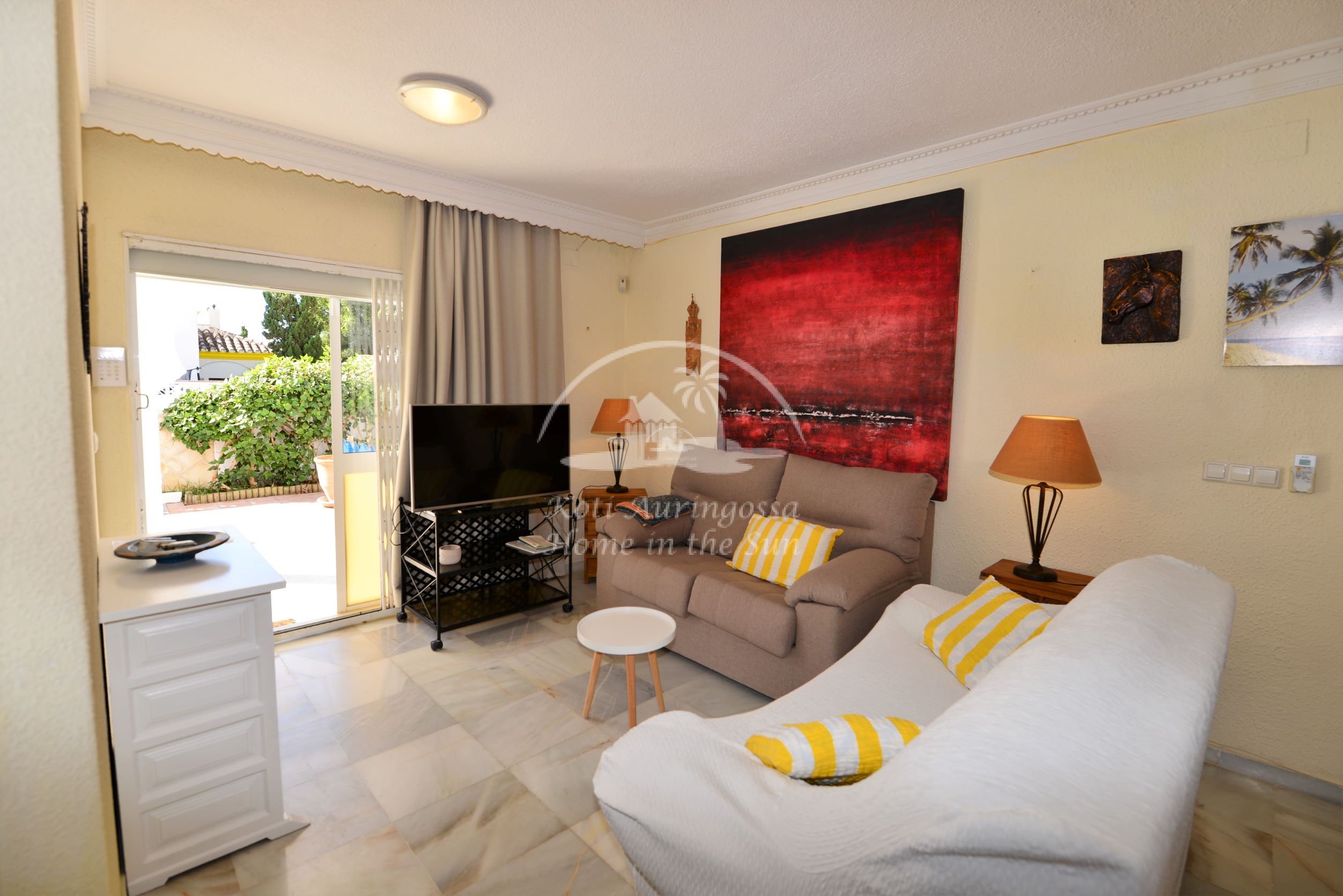 Valoisa olohuone ja ruokailutila. Olohuoneesta on käynti etelään päin olevalle osittain katetulle terassille. Moderni amerikkalainen keittiö jossa on myös astianpesukone ja uusi kiertoilma uuni. 2 makuuhuonetta. 2 kylpyhuonetta. Päämakuuhuoneesta on käynti pohjoiseen päin olevalle reilun kokoiselle suojaisalle sisäpatiolle.