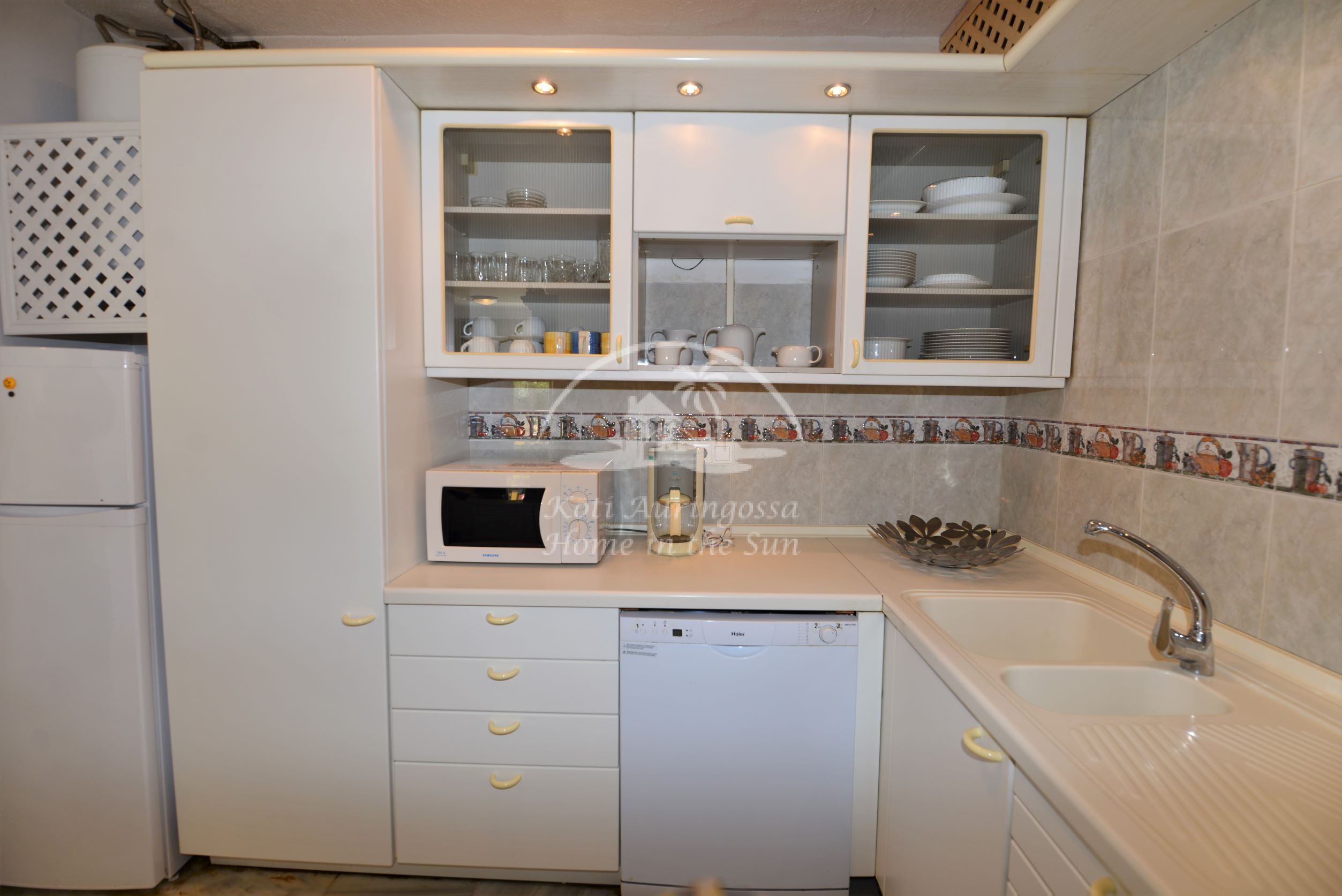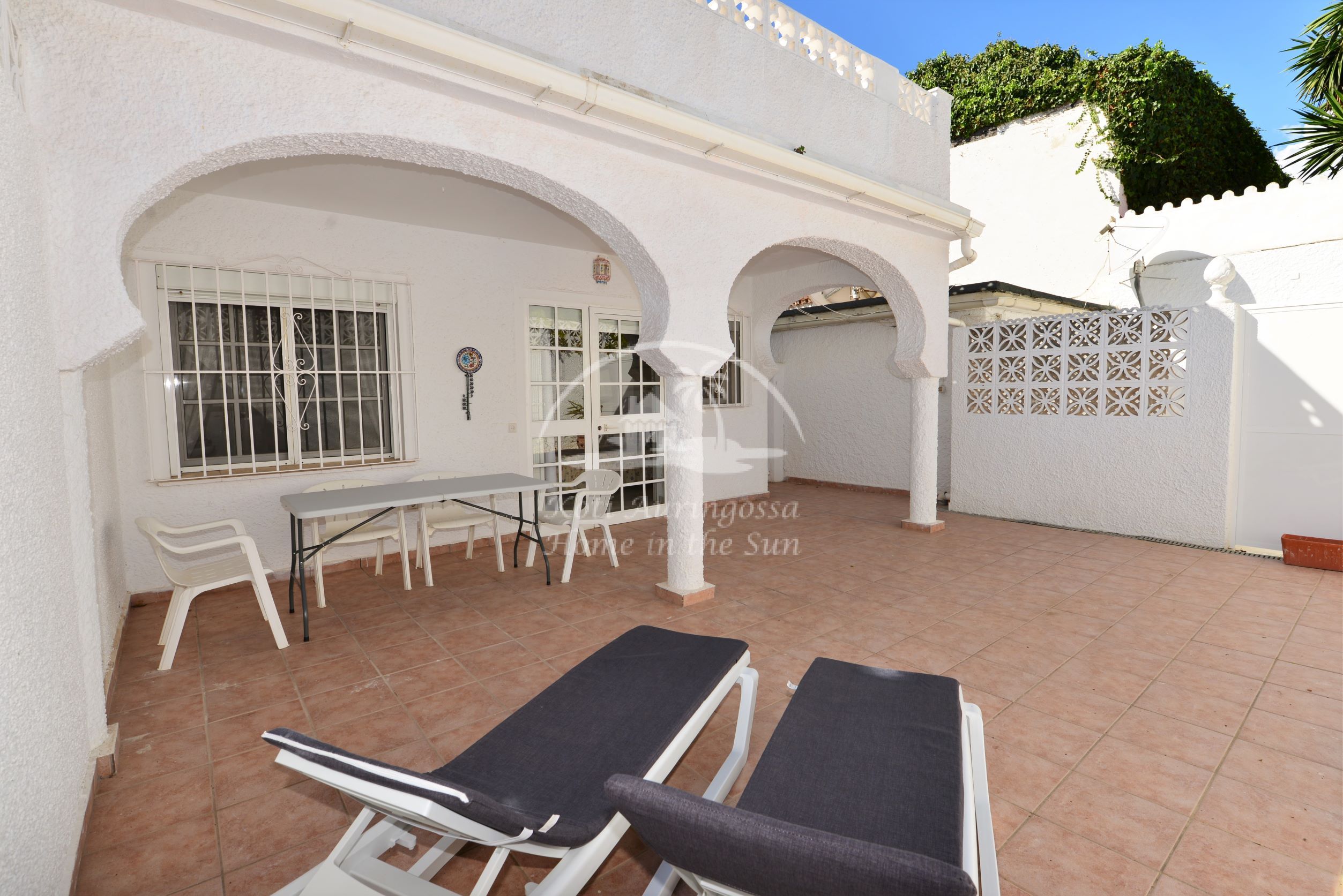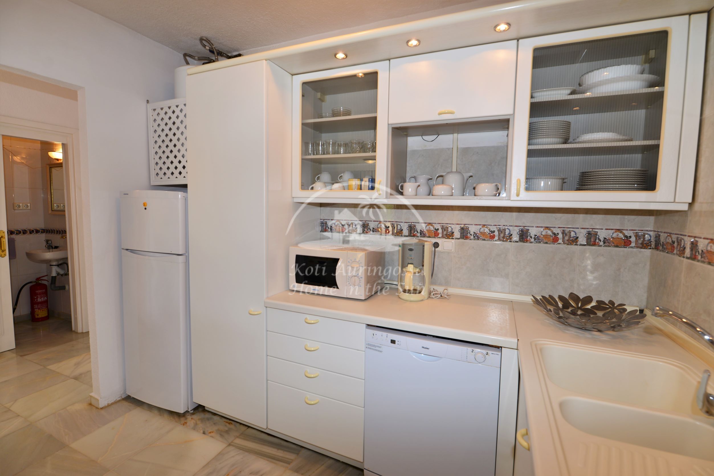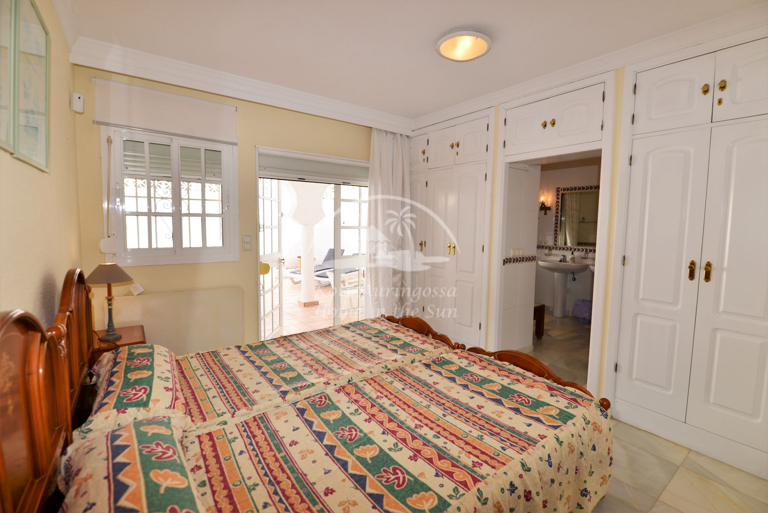 Valoisa olohuone ja ruokailutila. Olohuoneesta on käynti etelään päin olevalle osittain katetulle terassille. Moderni amerikkalainen keittiö jossa on myös astianpesukone ja uusi kiertoilma uuni. 2 makuuhuonetta. 2 kylpyhuonetta. Päämakuuhuoneesta on käynti pohjoiseen päin olevalle reilun kokoiselle suojaisalle sisäpatiolle.