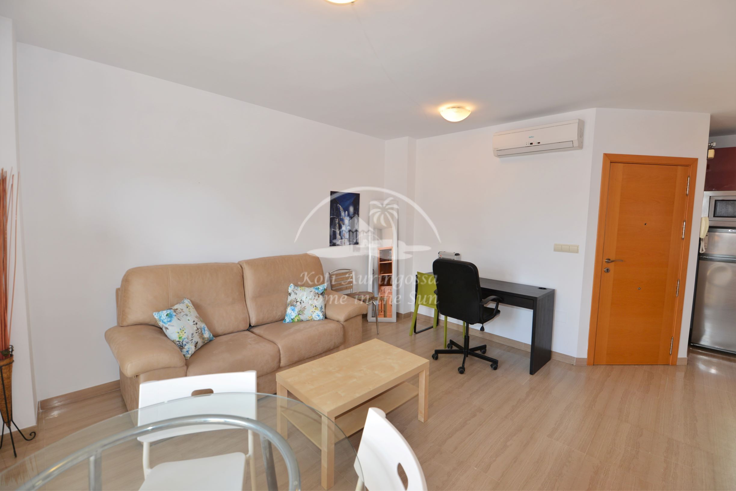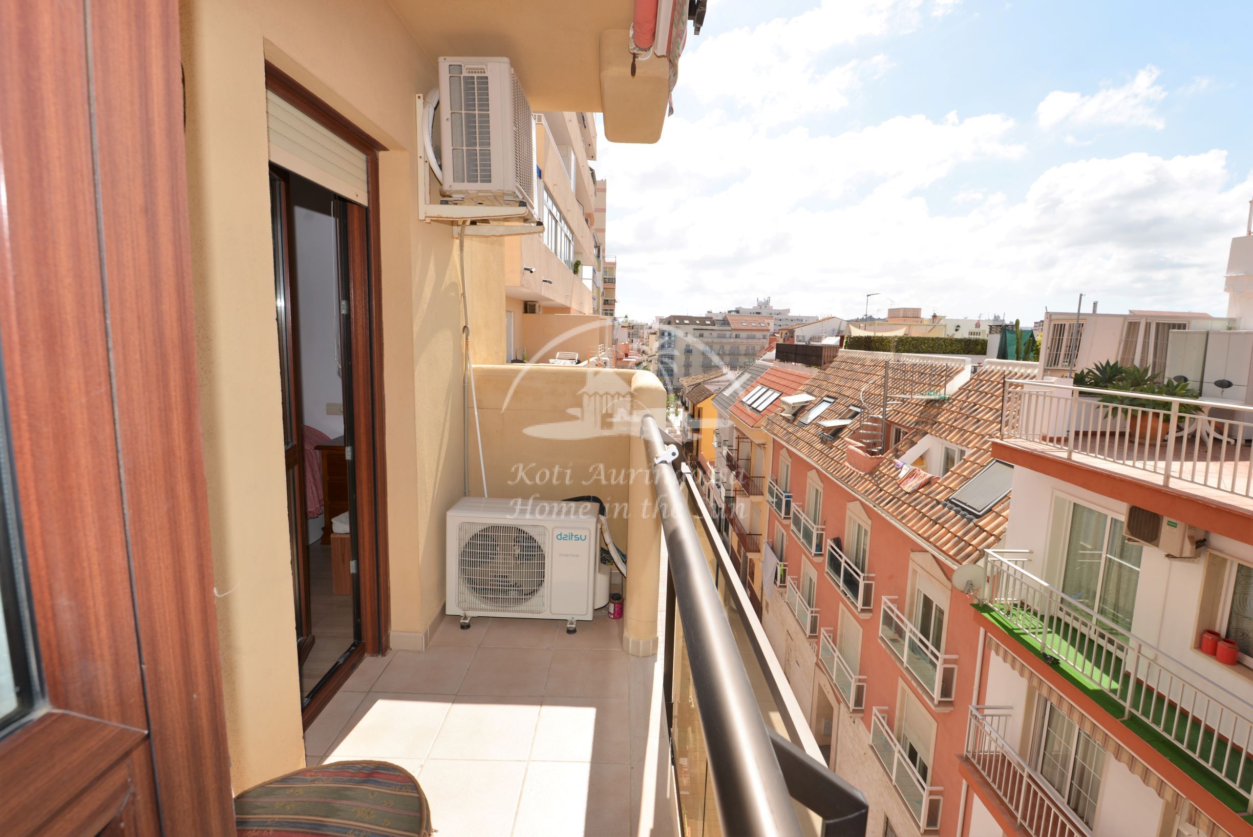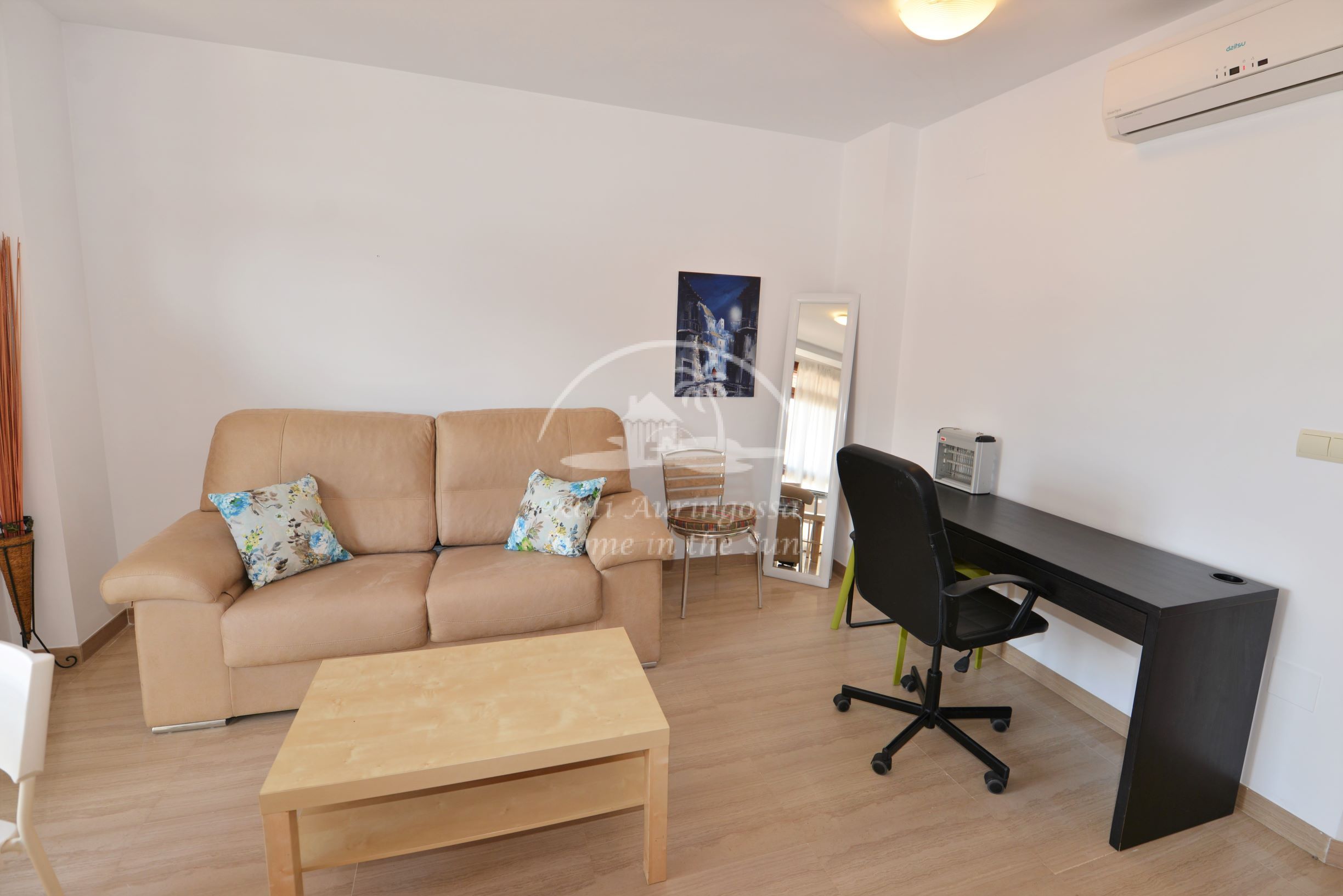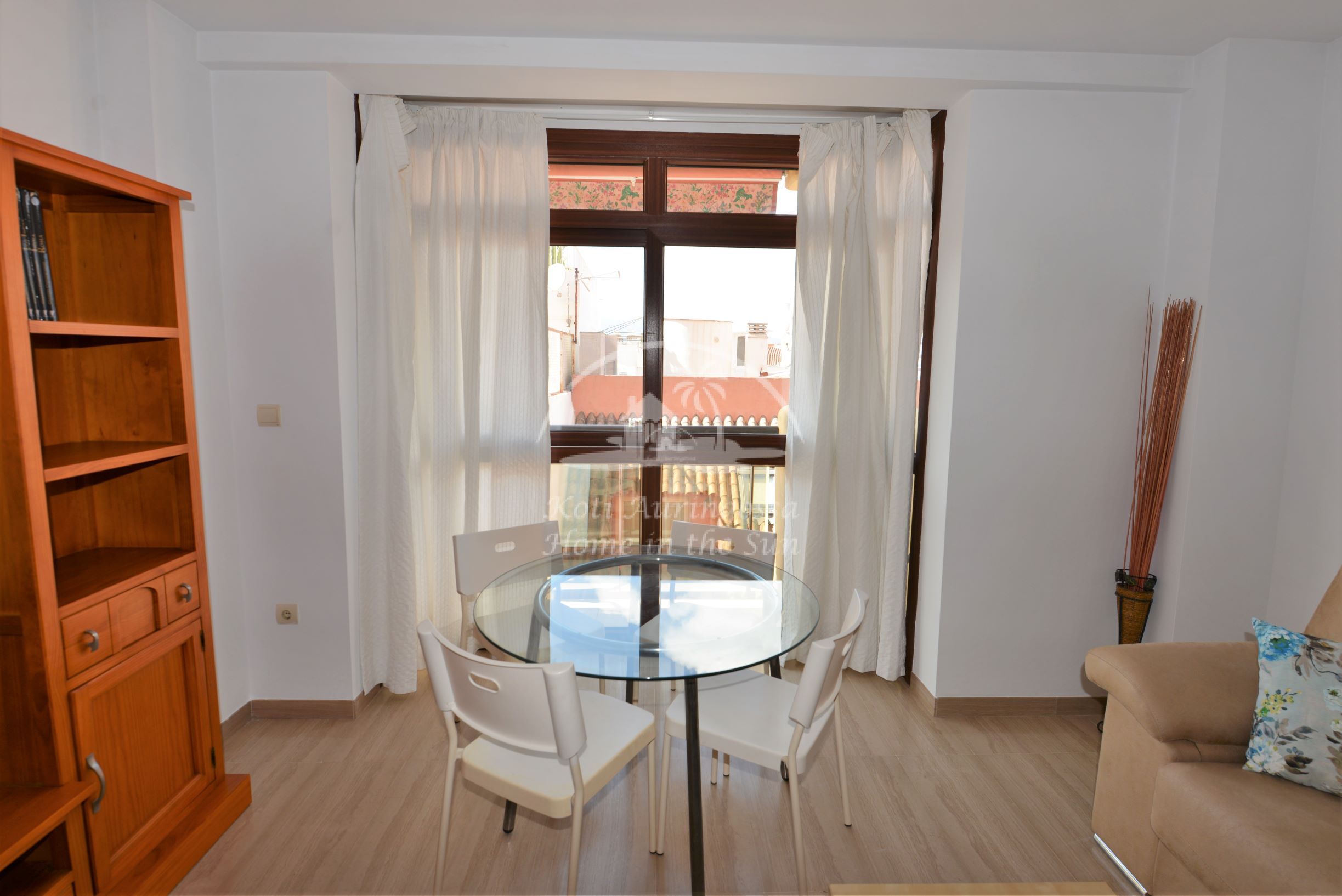 Asunto on kevyesti kalustettu ja sisustettu. Siinä on valoisa olohuone ja ruokailutila. Hyvin varustettu moderni keittiö, jossa on myös astianpesukone. 1 makuuhuone. 1 kylpyhuone kylpyammeella. Olohuoneesta on käynti pohjoiseen päin olevalle ilta-aurinkoiselle terassille. Terassilta avautuu näkymät kaupungin ylle ja Mijasin vuorille. Olohuoneessa ja makuuhuoneessa on ilmastointi-lämpöpumput. Keskeinen sijainti, joten kaikki keskustan palvelut on varsin lähellä eikä merenrantaankaan ole kuin noin 50 metriä matkaa. Osoite: Calle Castillo 13. Edif. Solymar 4 krs. Fuengirola.
