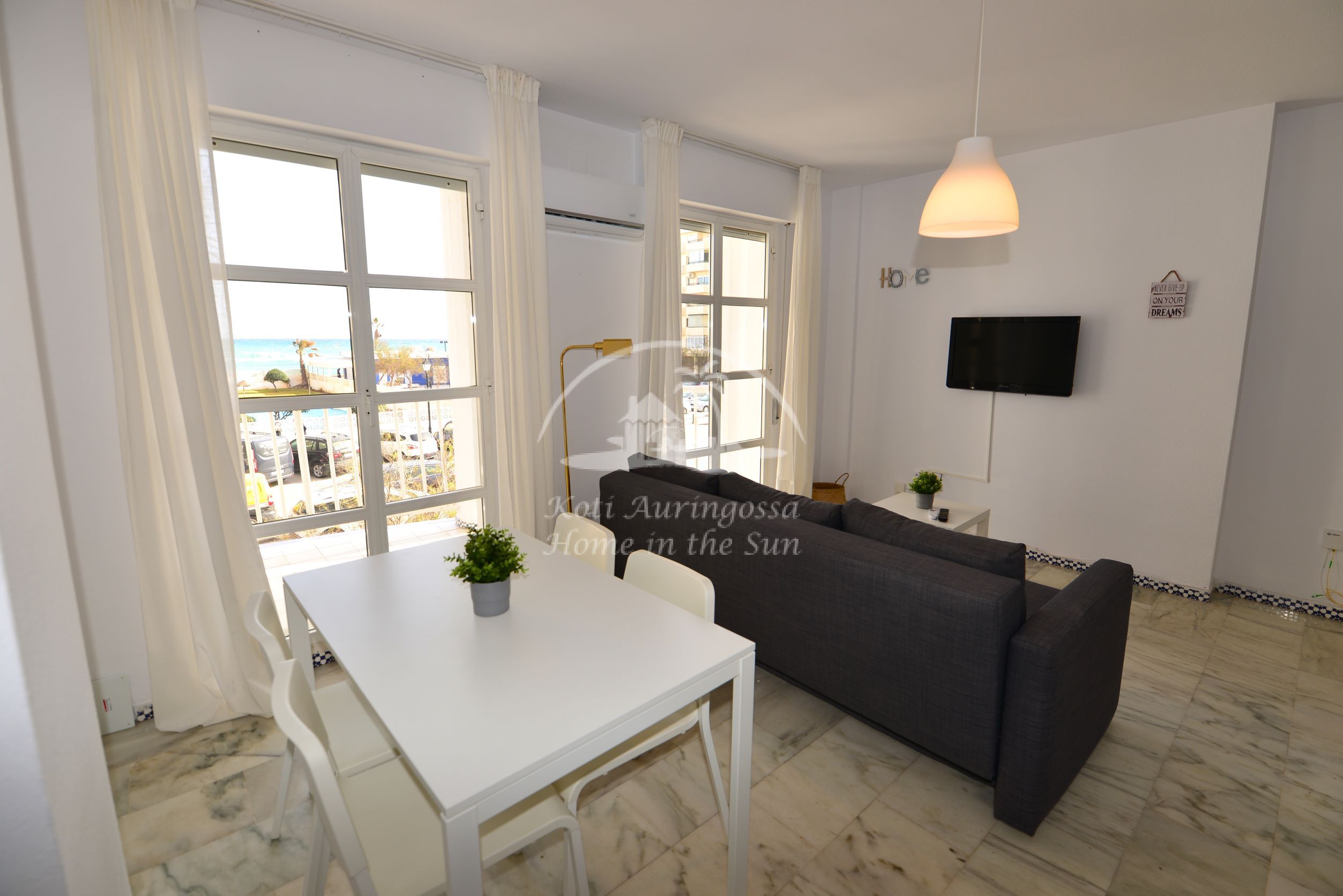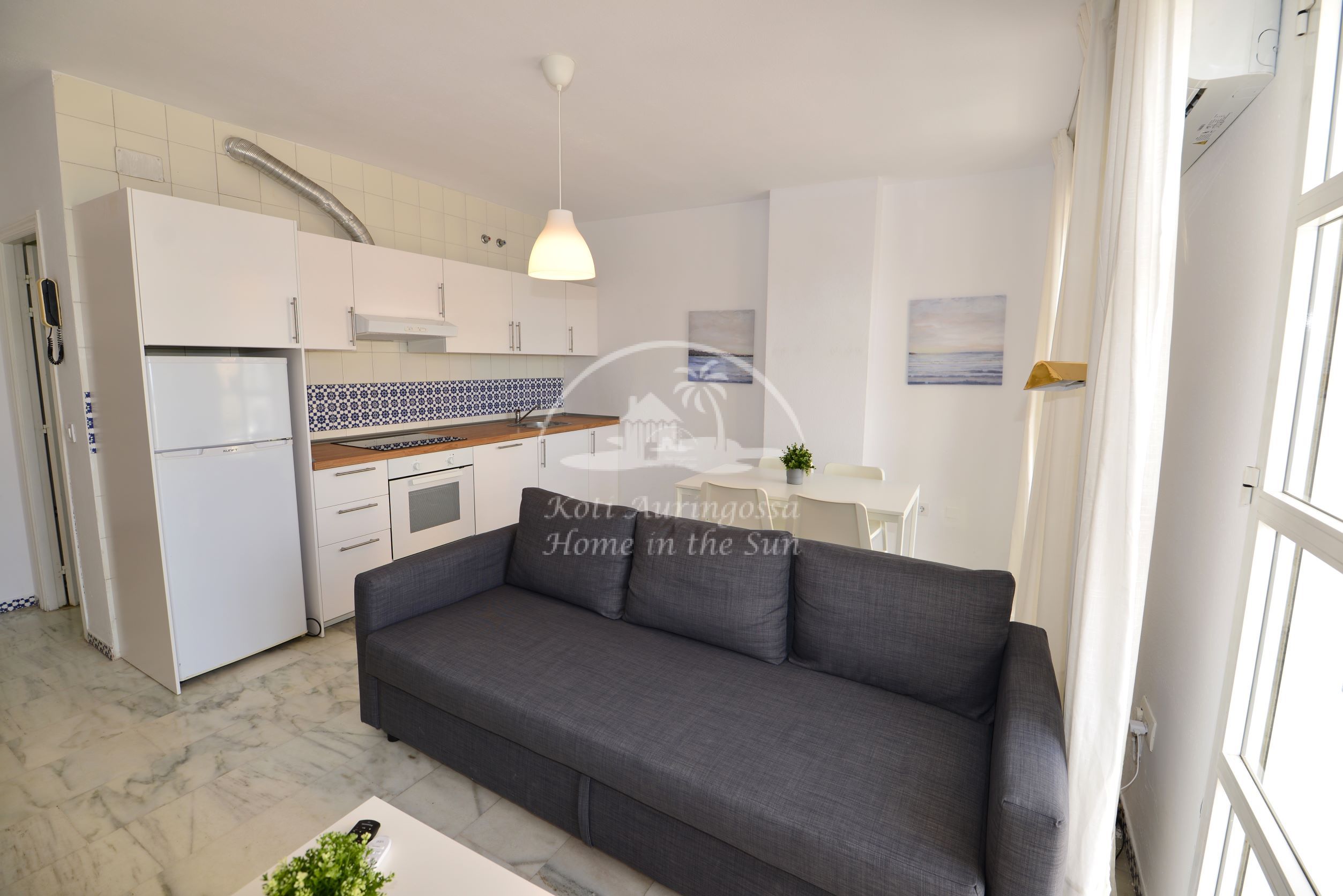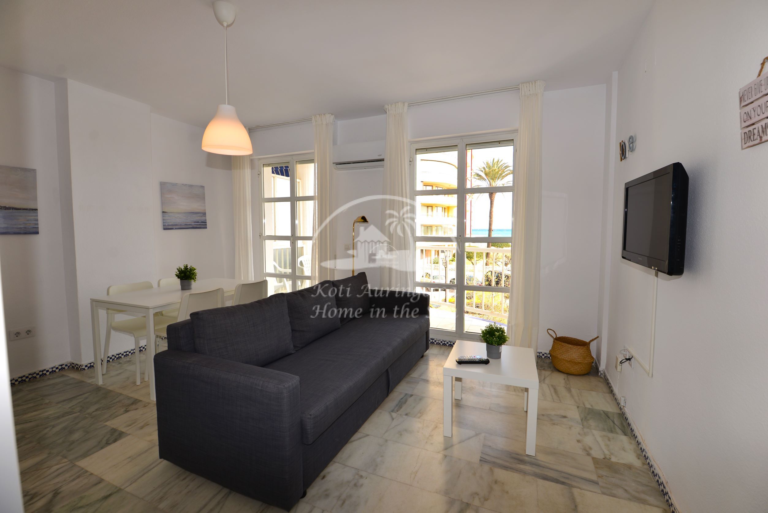 Asunto on viihtyisästi kalustettu ja sisustettu. Valoisa olohuone ja ruokailutila. Olohuoneesta on käynti aamu aurinkoiselle terassille, josta hienot näkymät merelle. Olohuoneessa on ilmastointi / lämpöpumppu. Uusi moderni avokeittiö jossa on myös astianpesukone.1 makuuhuone. 1 kylpyhuone. Erillinen kodinhoito huone, jossa pesukone. Nopea valokuitu wifi internet yhteys valmiina. Taloyhtiössä on todella kauniit puutarhat ja suuri uima-allas jonka ympärillä runsaasti auringonotto tilaa. Erittäin siisti ja hyvin hoidettu taloyhtiö. kaikki keskustan palvelut lähellä. Merenrantaan 100 metriä.