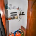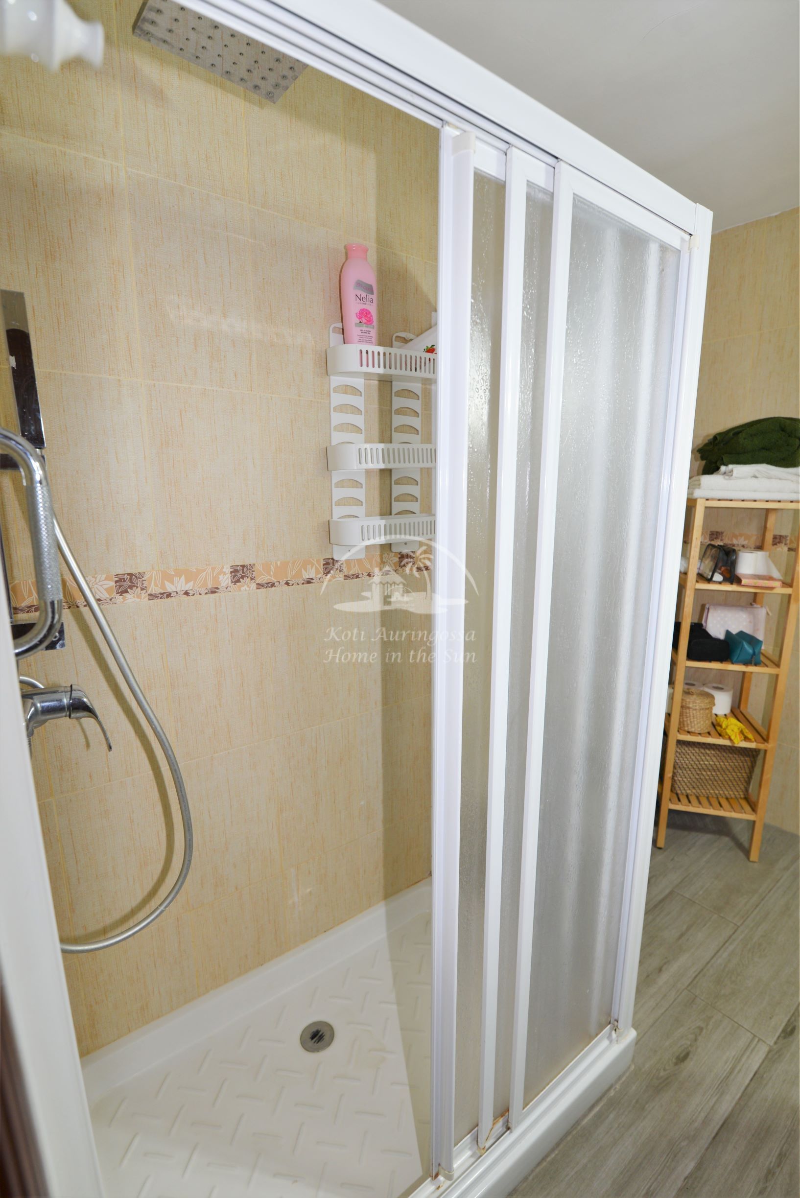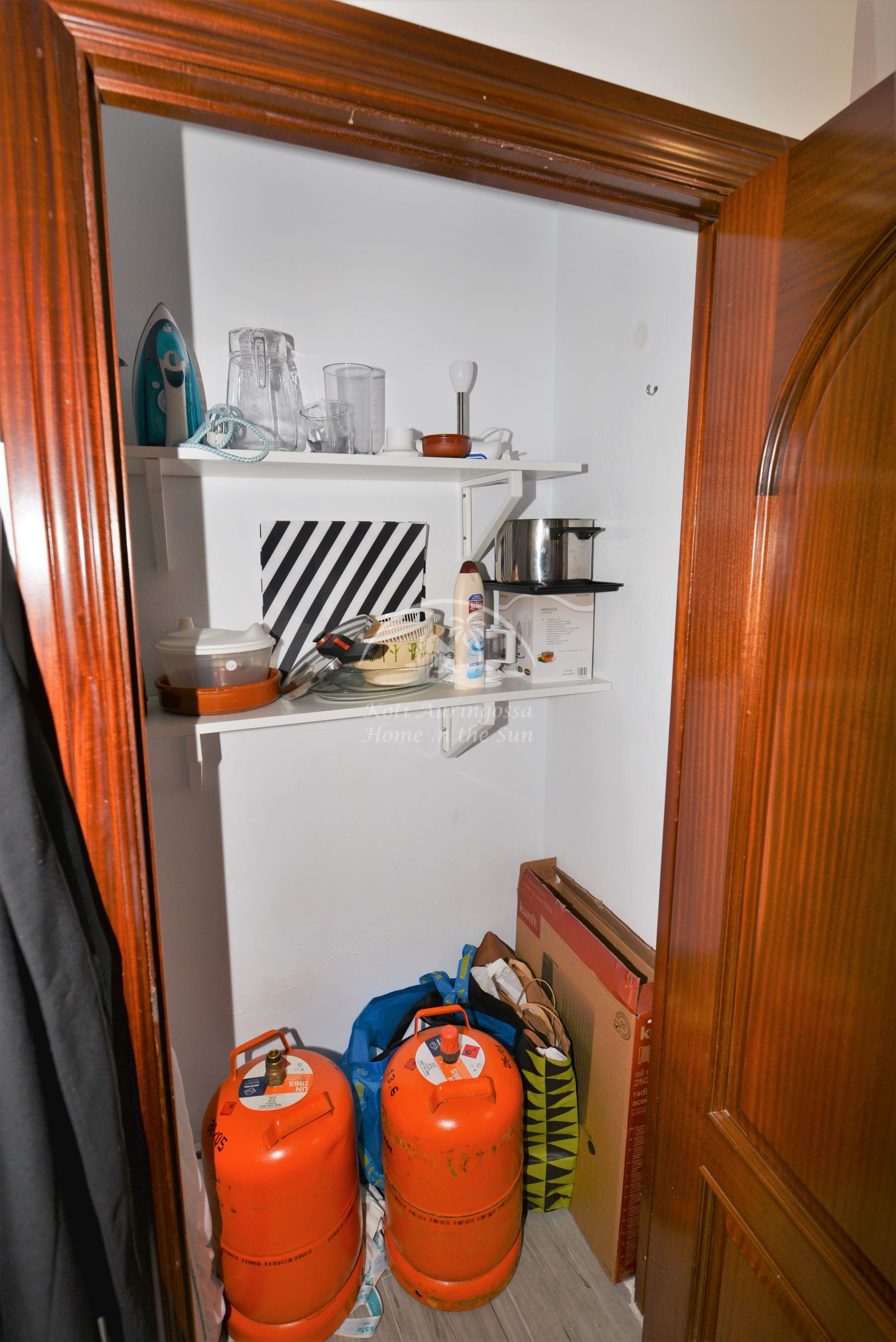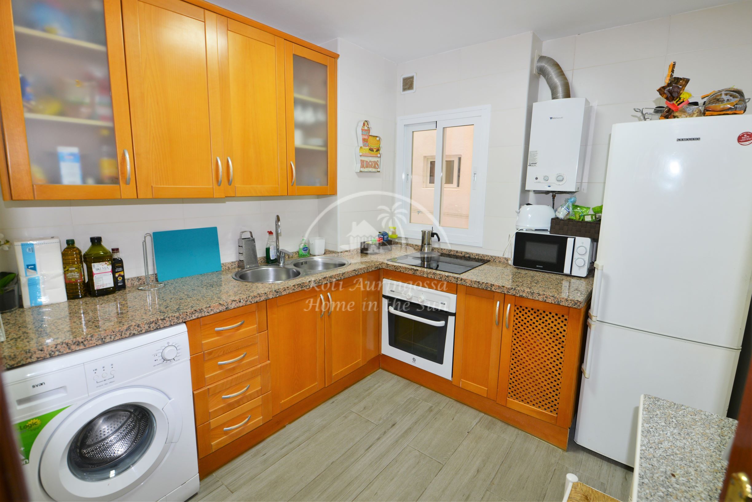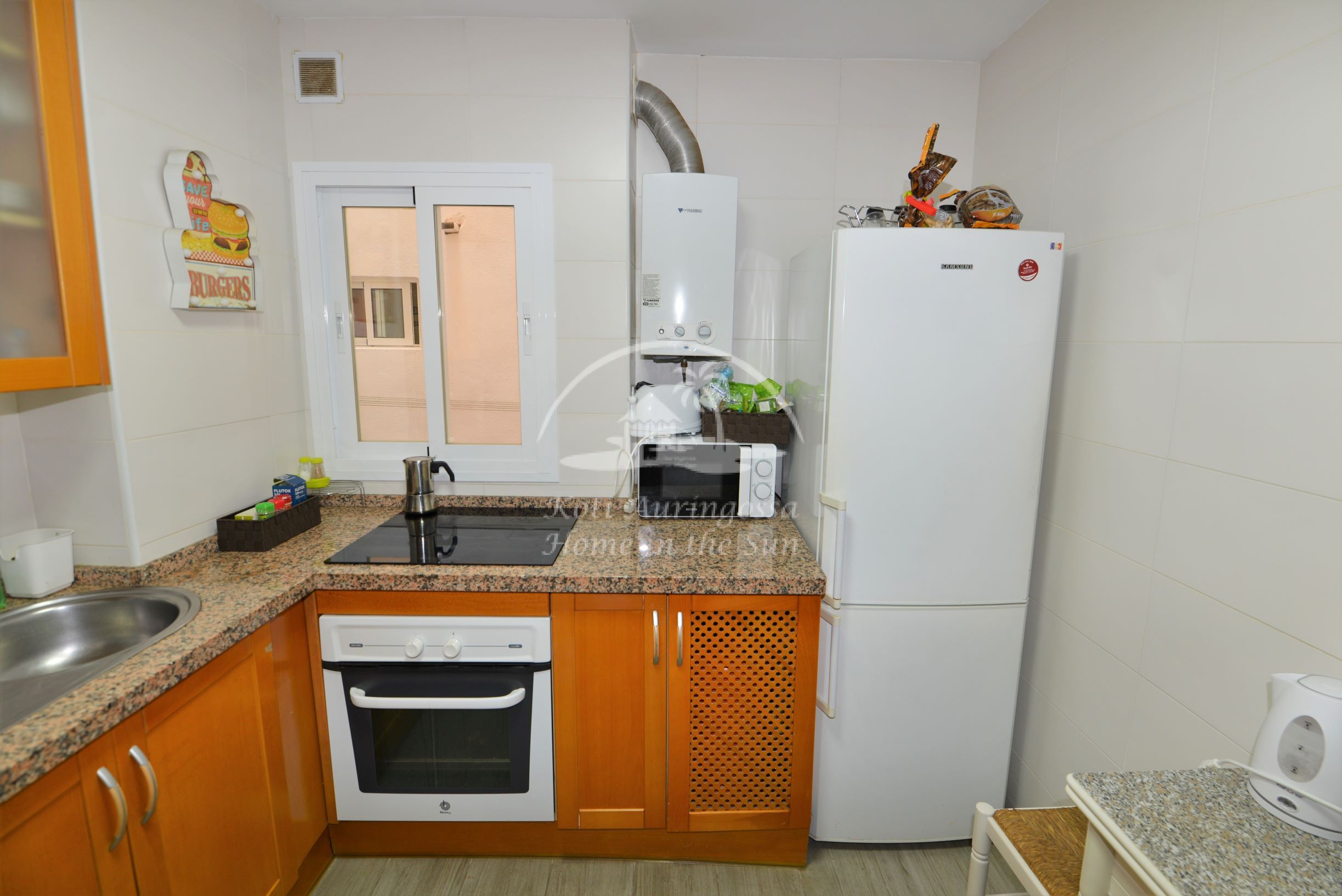Erillinen keittiö jossa kaikki toimii sähköllä, vesi lämpiää kaasulla toimivalla vedenlämmittimellä.