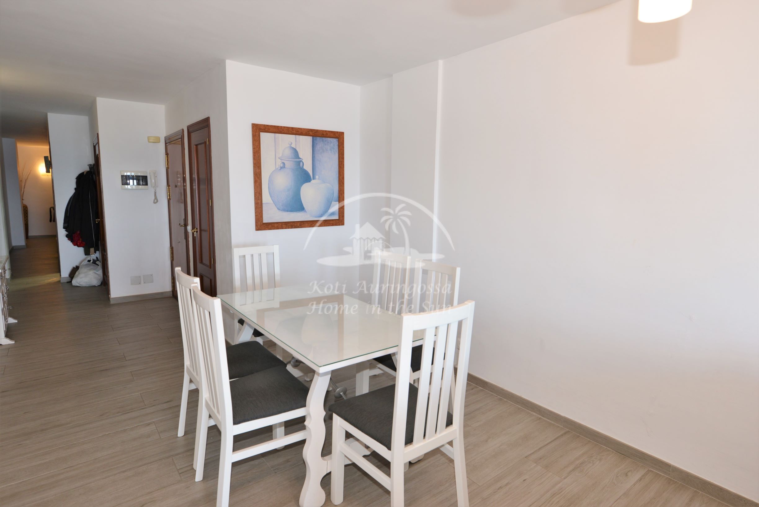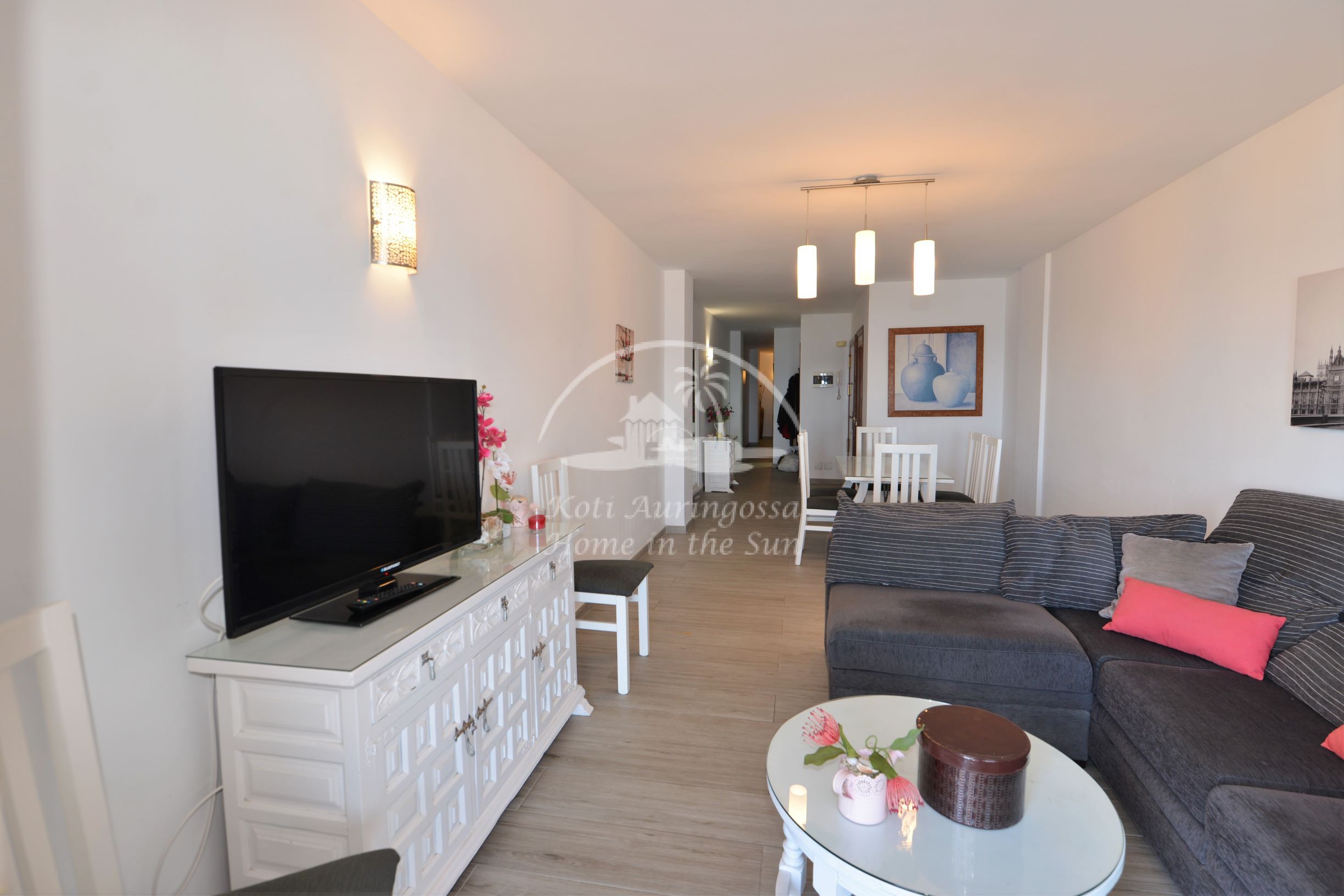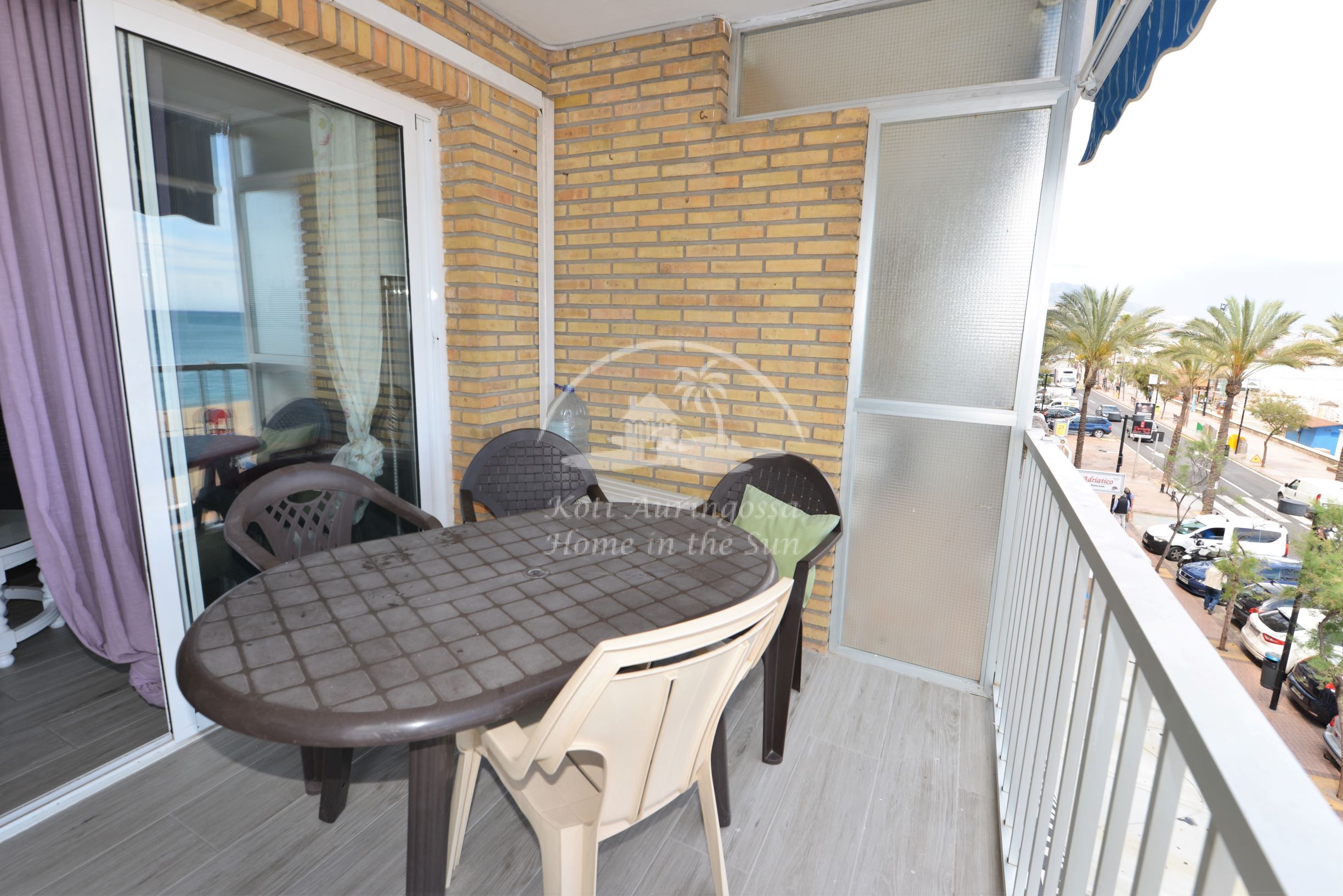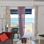 Valoisa olohuone ja ruokailutila, olohuoneesta on käynti etelään päin olevalle aamu aurinkoiselle terassille. Terassilta on upeat näkymät merelle ja rantakadulle.