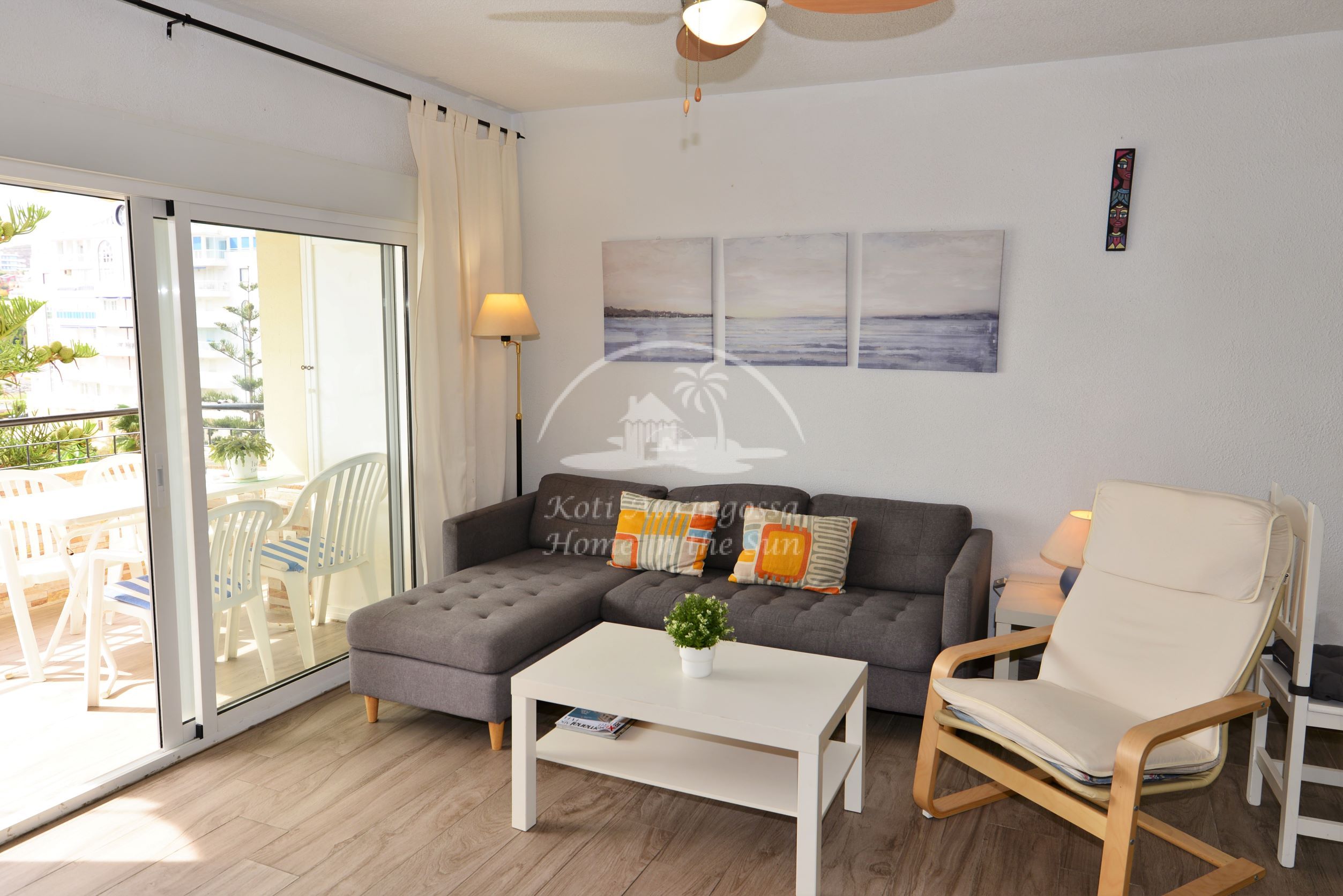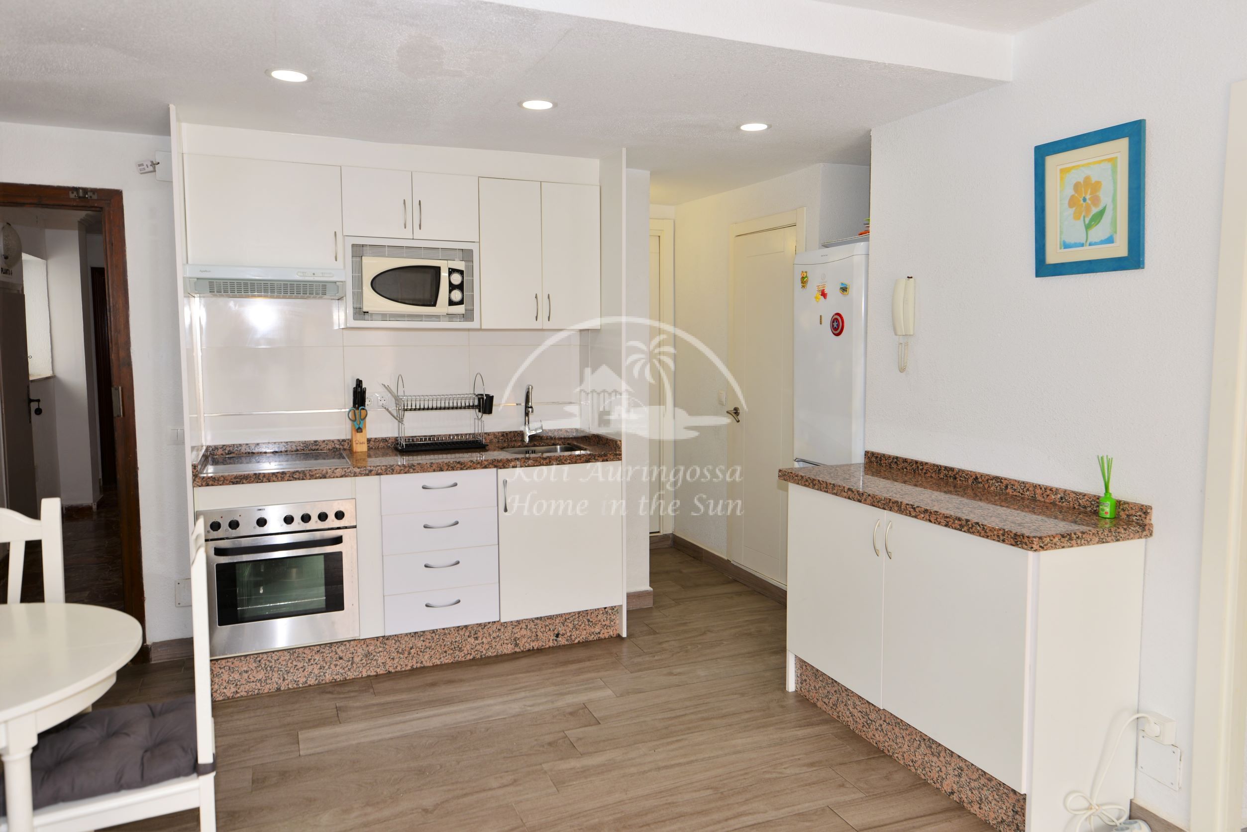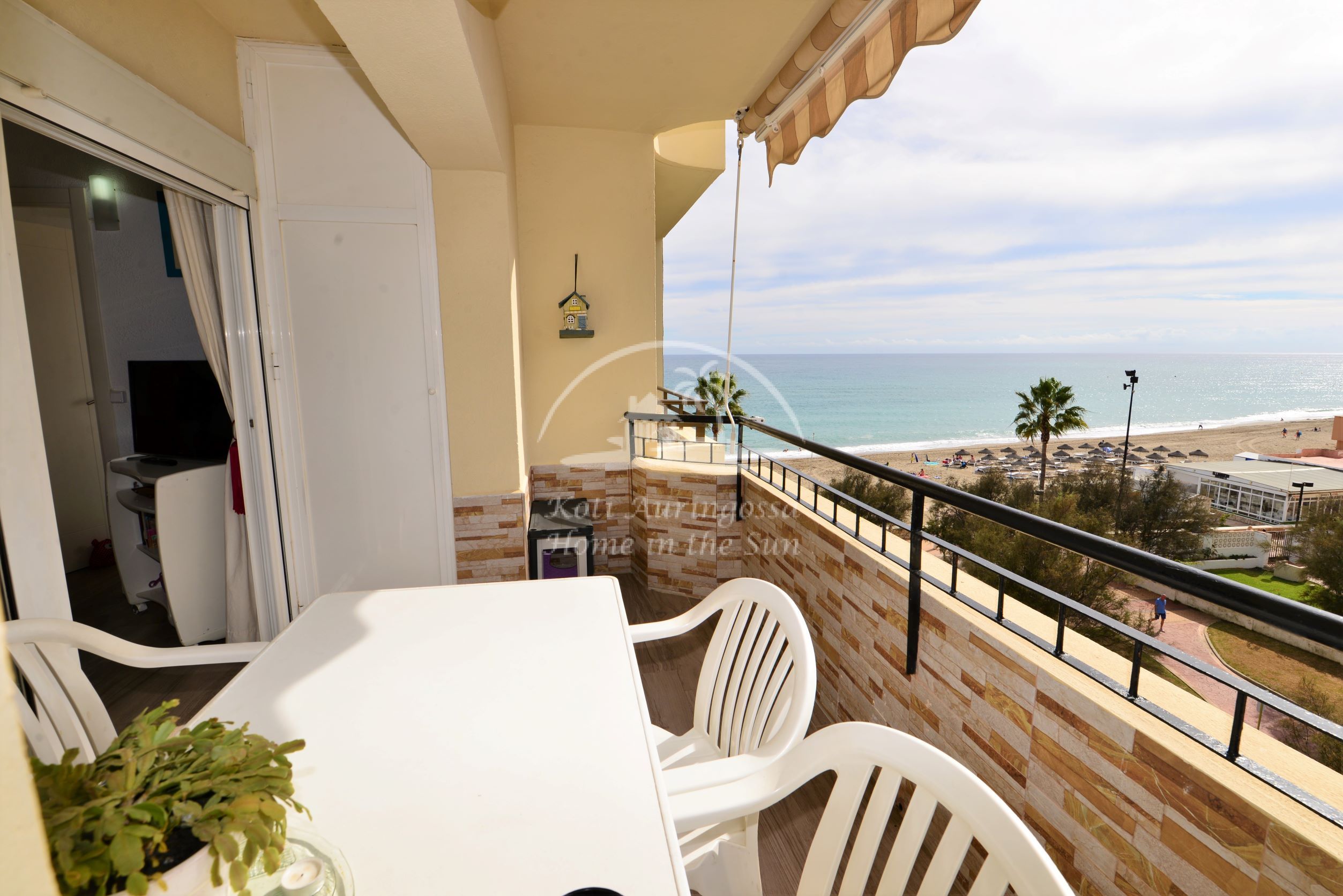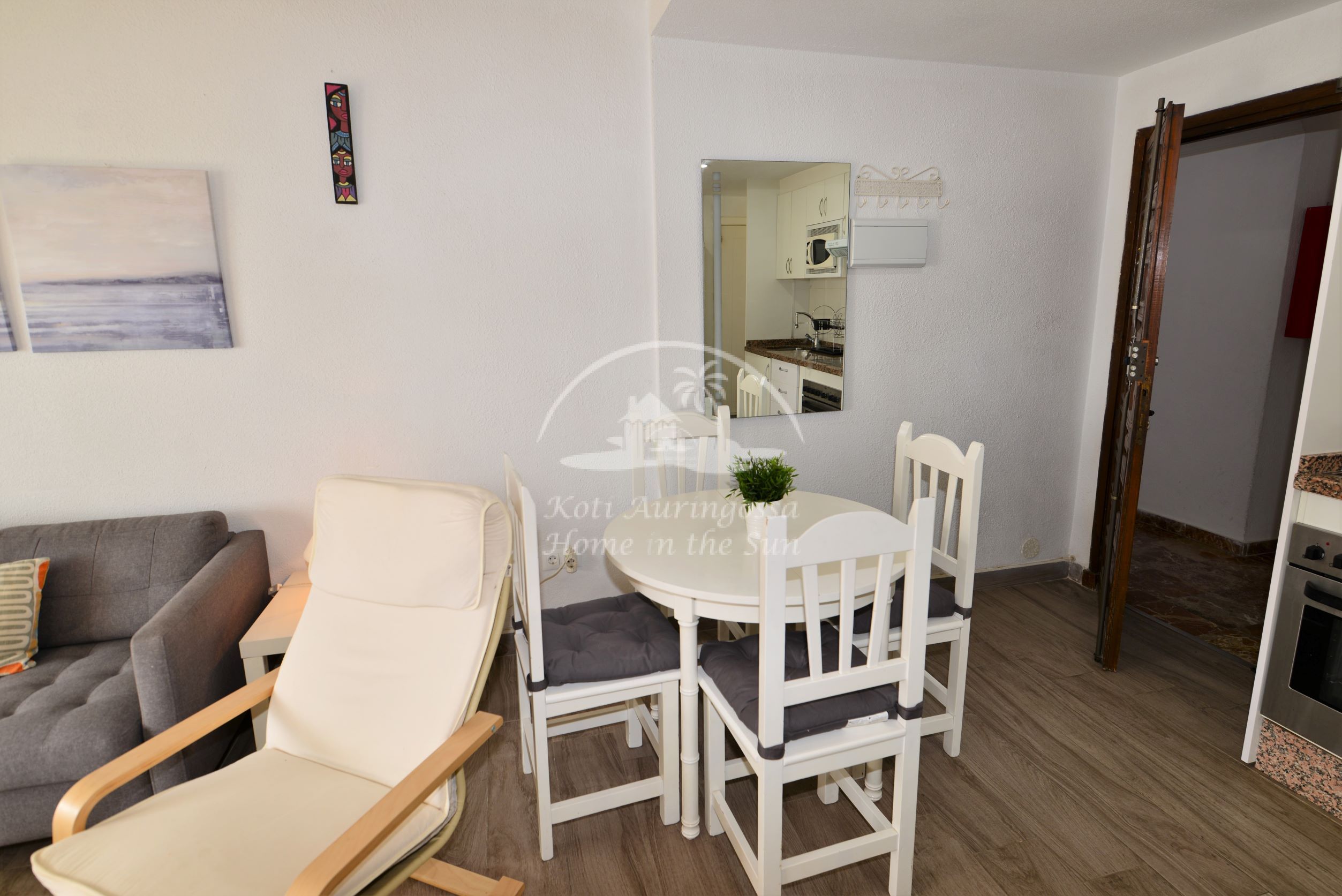 Asunto on kodikkaasti kalustettu ja sisustettu. Avara olohuone ja ruokailutila. Olohuoneesta ja päämakuuhuoneesta on käynti länteen päin olevalle aurinkoiselle terassille. Terassilta on kauniit näkymät merelle ja taloyhtiön vehreään puutarhaan. Moderni avokeittiö jossa kaikki toimii sähköllä.