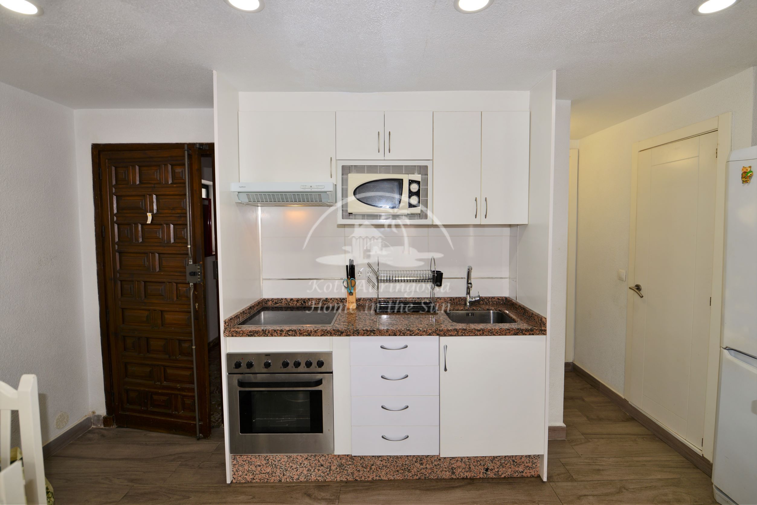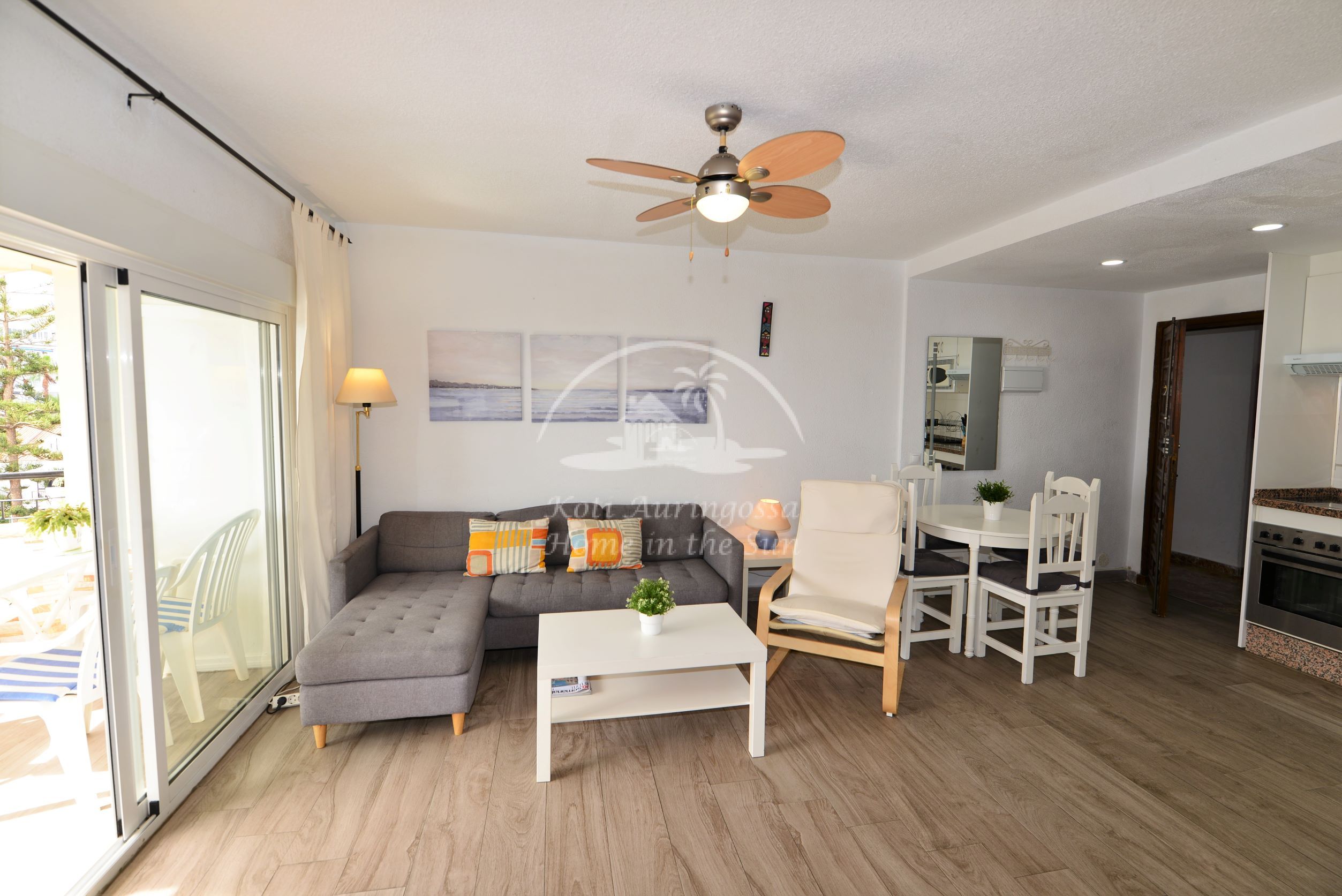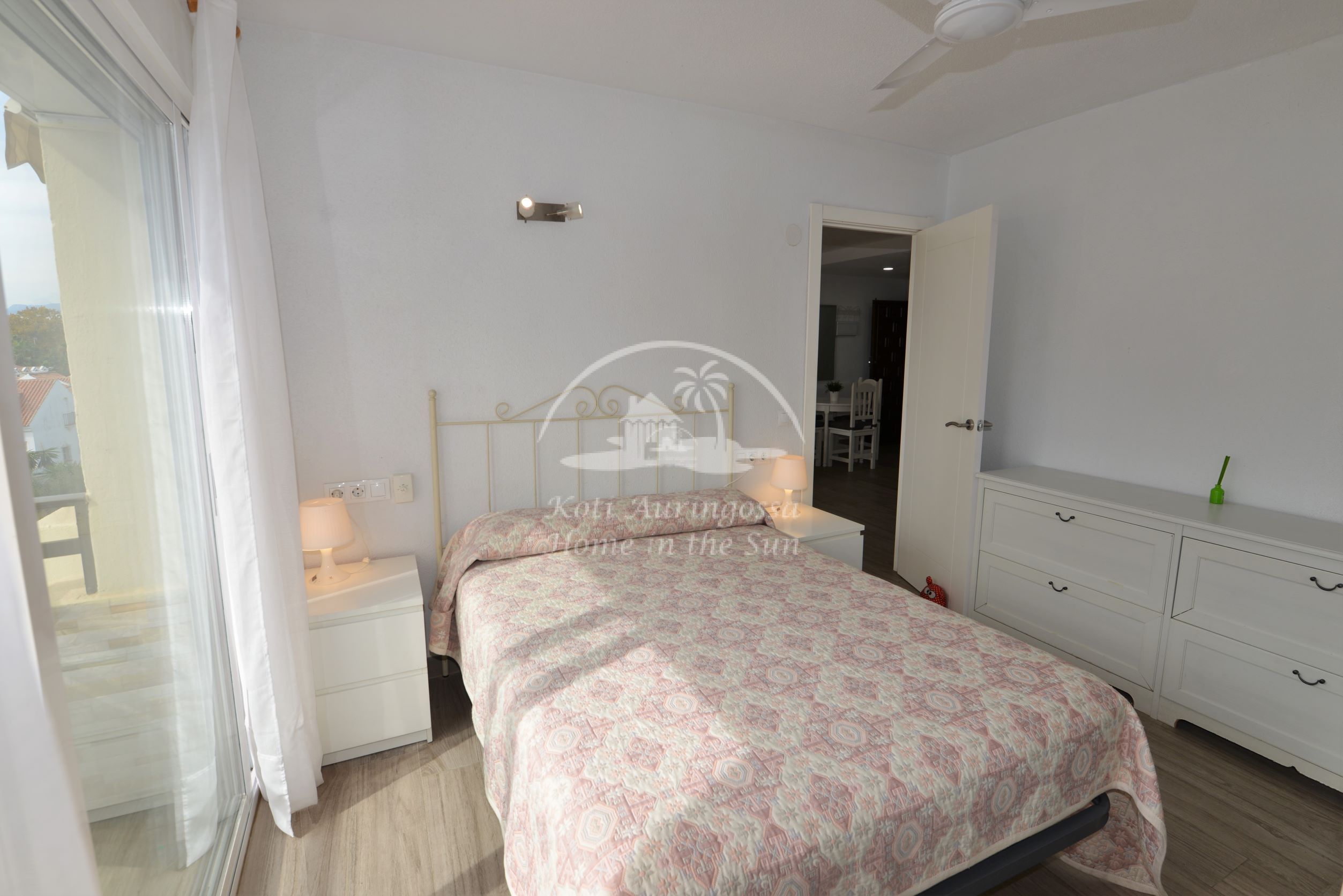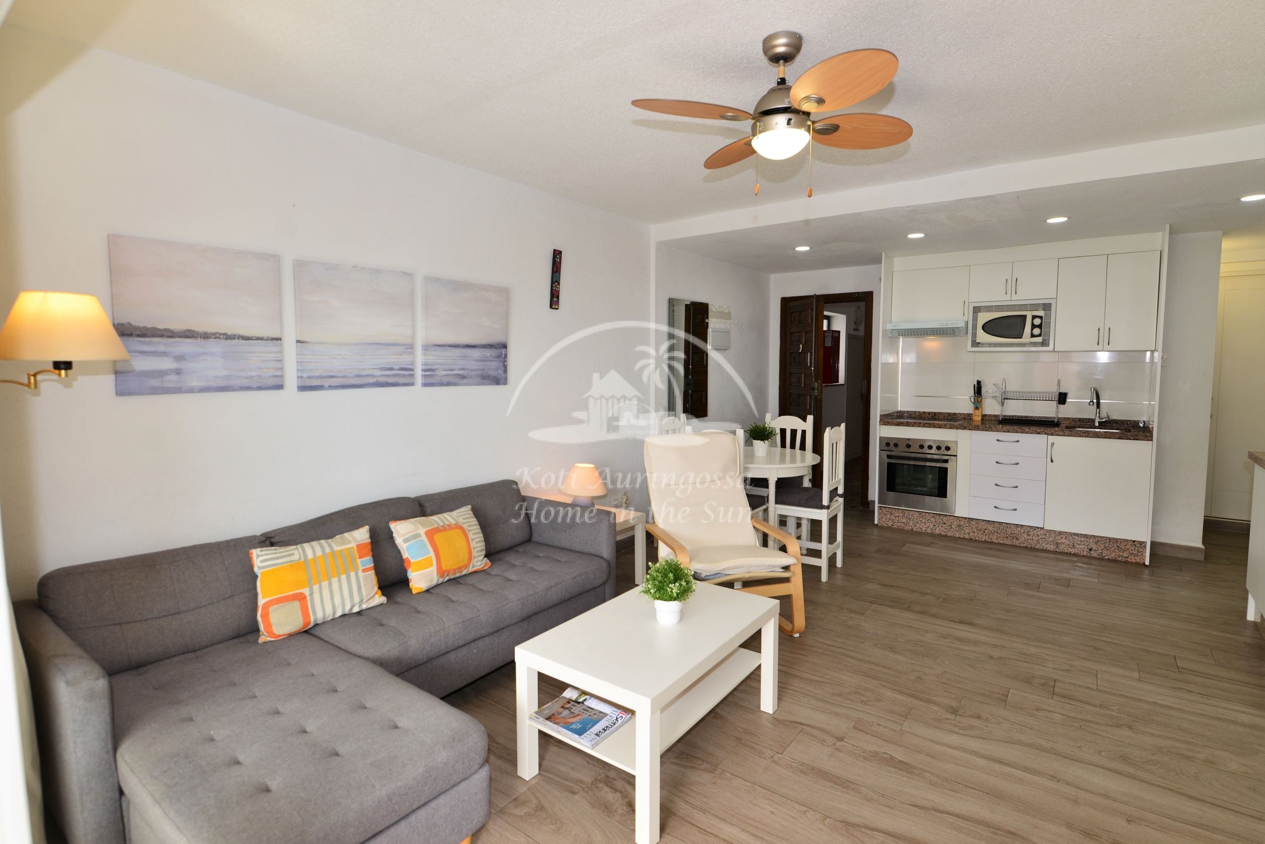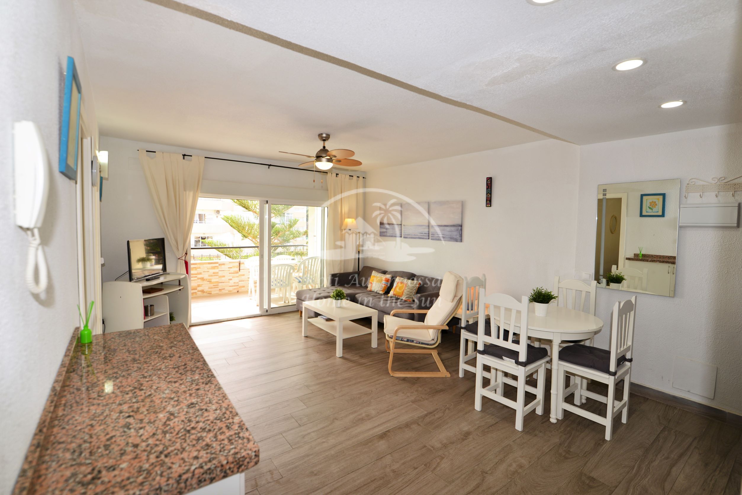Asunto on kodikkaasti kalustettu ja sisustettu. Avara olohuone ja ruokailutila. Olohuoneesta ja päämakuuhuoneesta on käynti länteen päin olevalle aurinkoiselle terassille. Terassilta on kauniit näkymät merelle ja taloyhtiön vehreään puutarhaan. Moderni avokeittiö jossa kaikki toimii sähköllä.