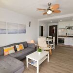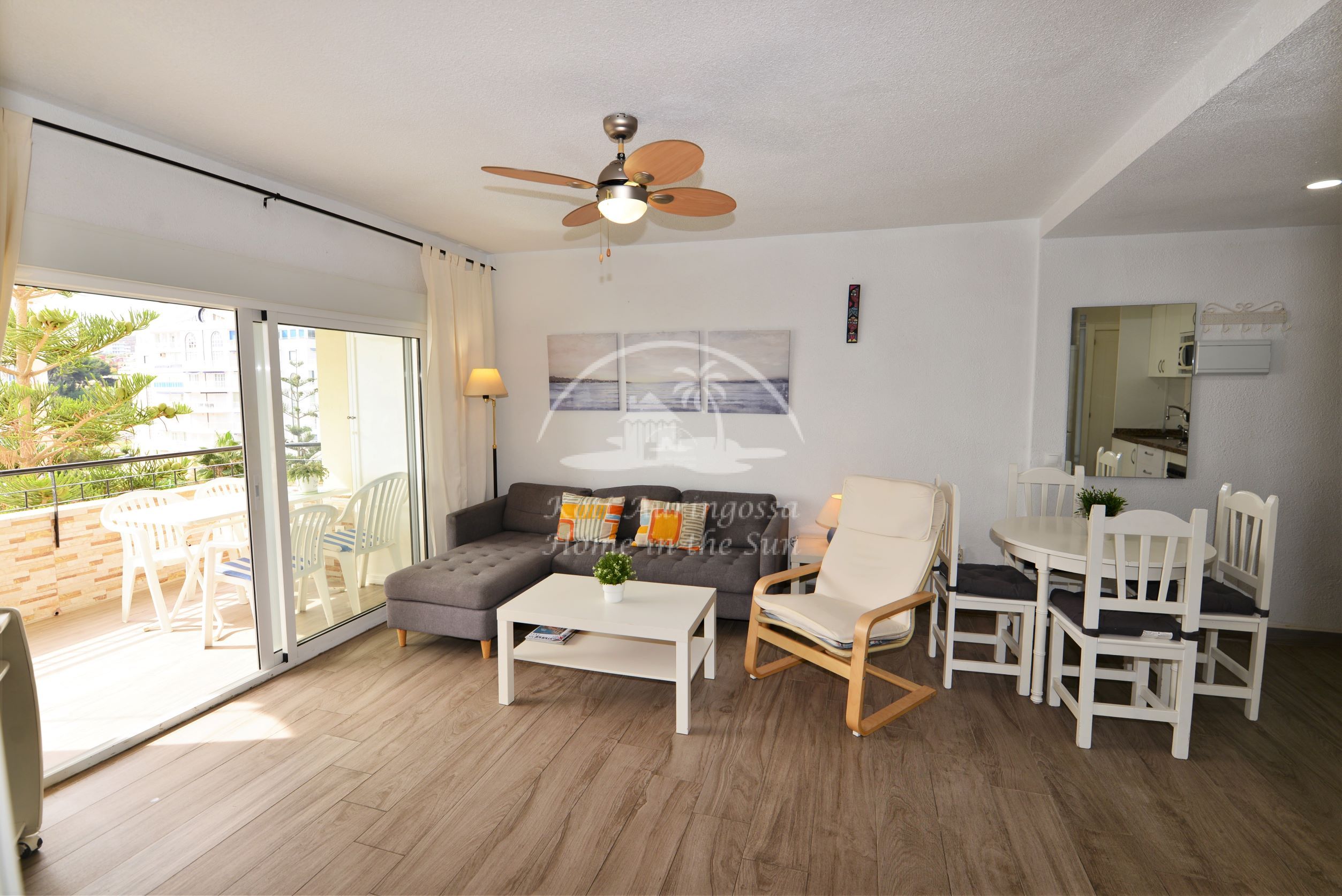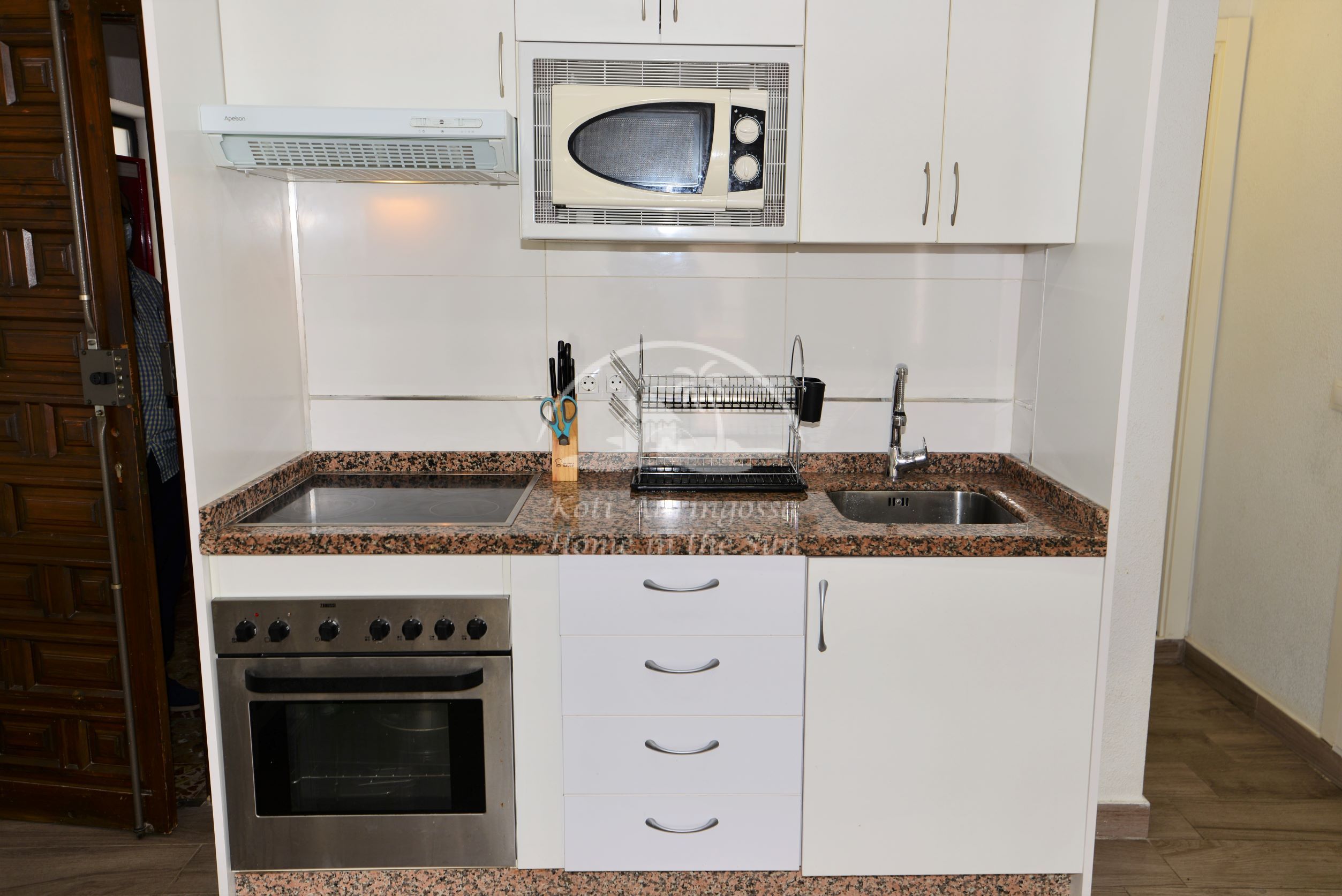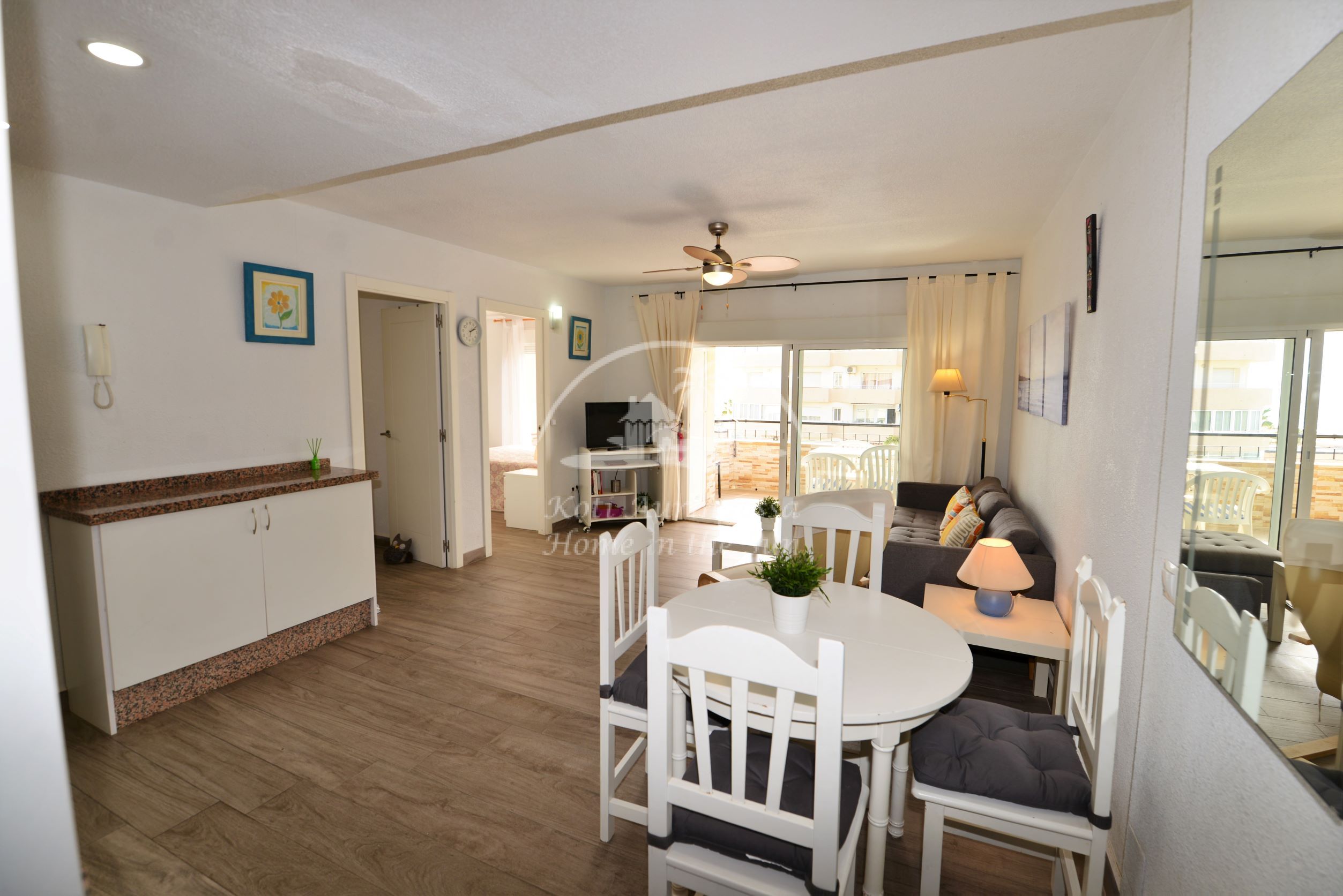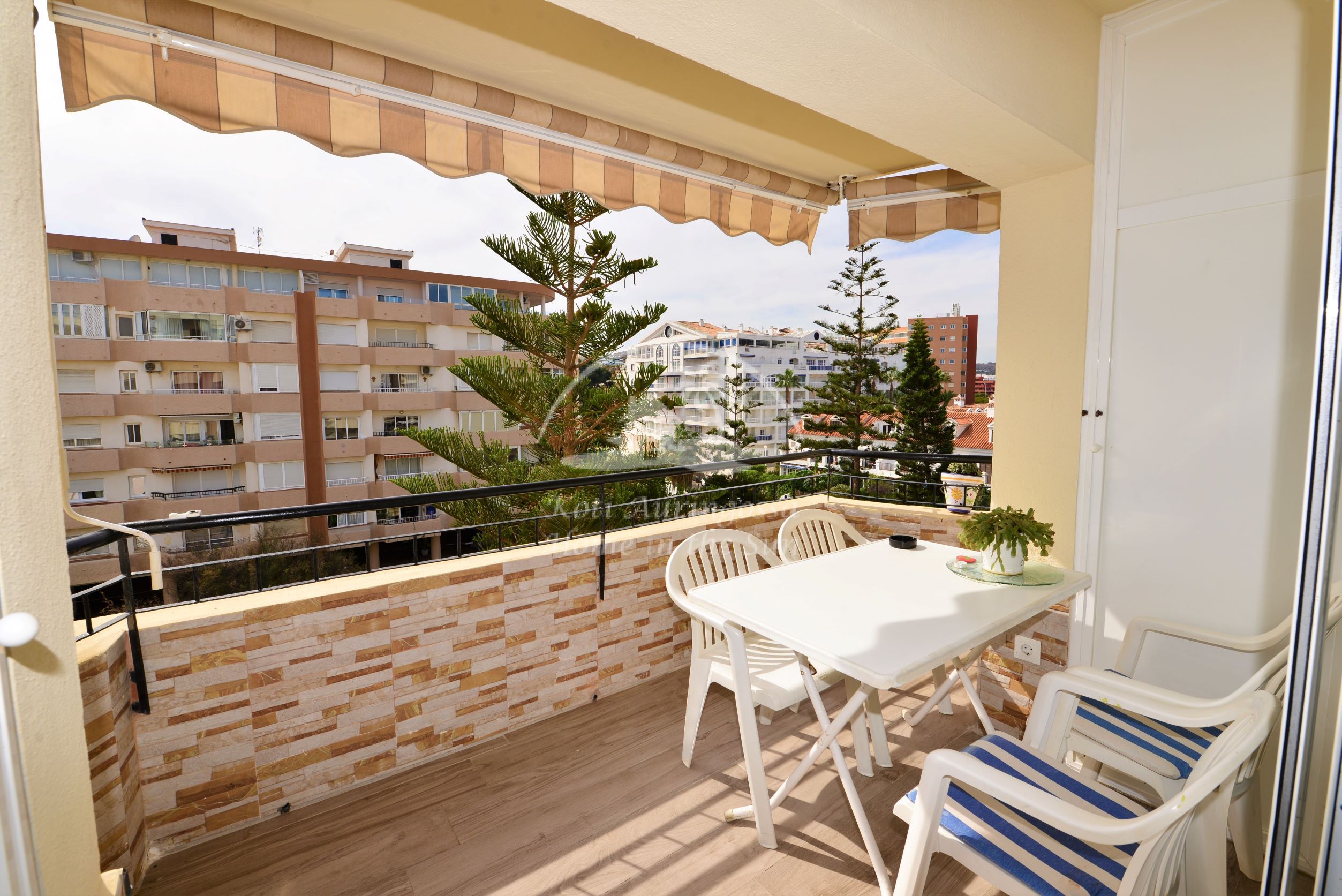 Asunto on kodikkaasti kalustettu ja sisustettu. Avara olohuone ja ruokailutila. Olohuoneesta ja päämakuuhuoneesta on käynti länteen päin olevalle aurinkoiselle terassille. Terassilta on kauniit näkymät merelle ja taloyhtiön vehreään puutarhaan. Moderni avokeittiö jossa kaikki toimii sähköllä.