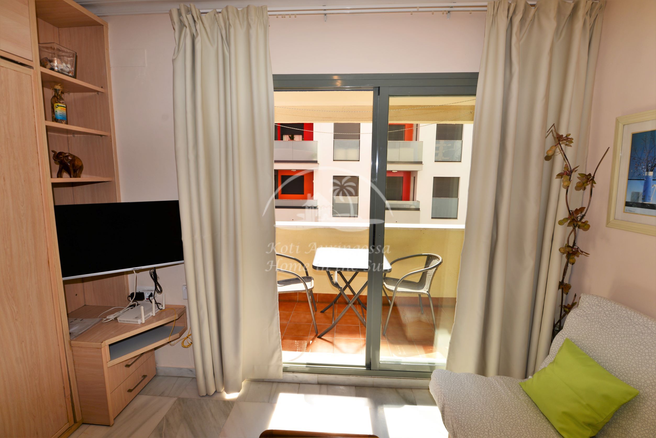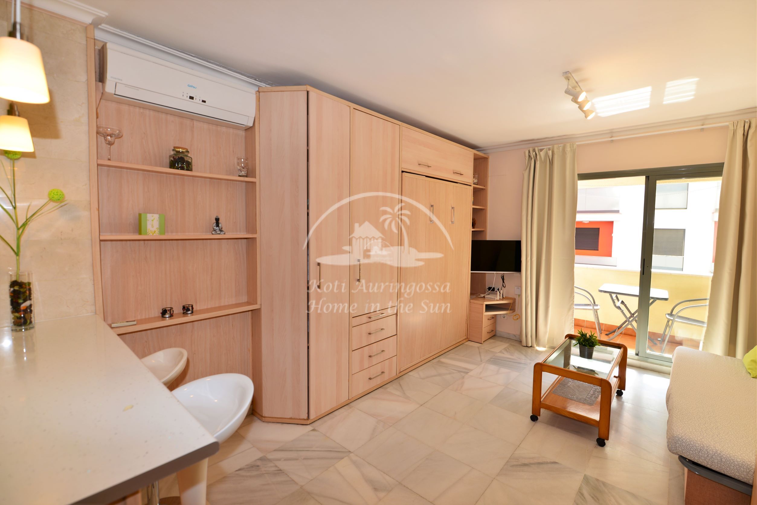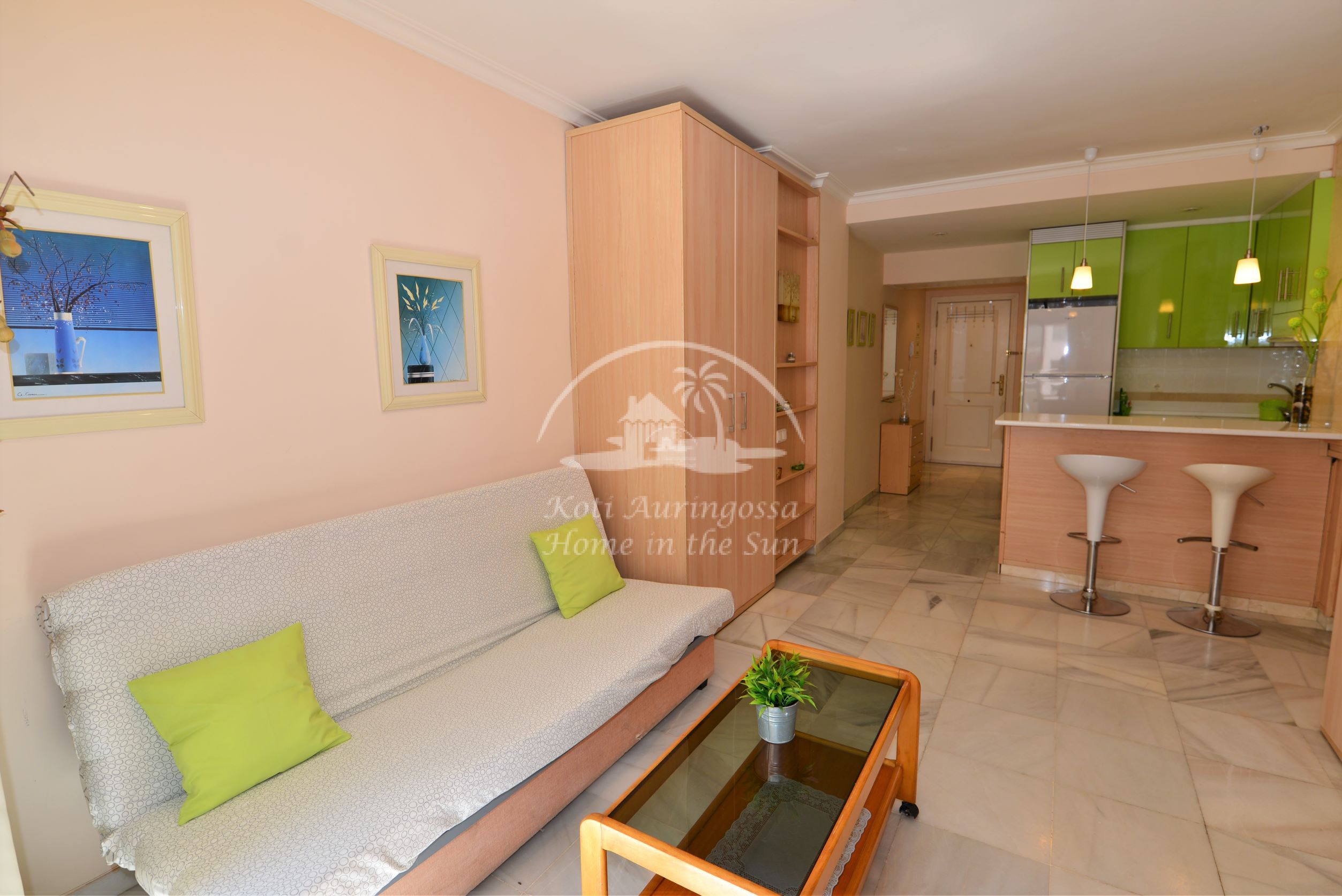 Asunto on kodikkaasti kalustettu ja sisustettu. Olohuoneessa on comerosta avautuva parivuode, ja sohva on myös kahden hengen vuodesohva, joten nukkumapaikkoja on neljälle. Olohuoneesta on käynti aurinkoiselle länteen päin olevalle terassille. Moderni amerikkalainen keittiö. 1 kylpyhuone kylpyammeella. Ilmastointi lämpöpumppu. Nopea valokuitu wifi internet yhteys valmiina. Taloyhtiössä on uima-allas. Kaikki keskustan palvelut lähellä. Merenrantaan 100 metriä.