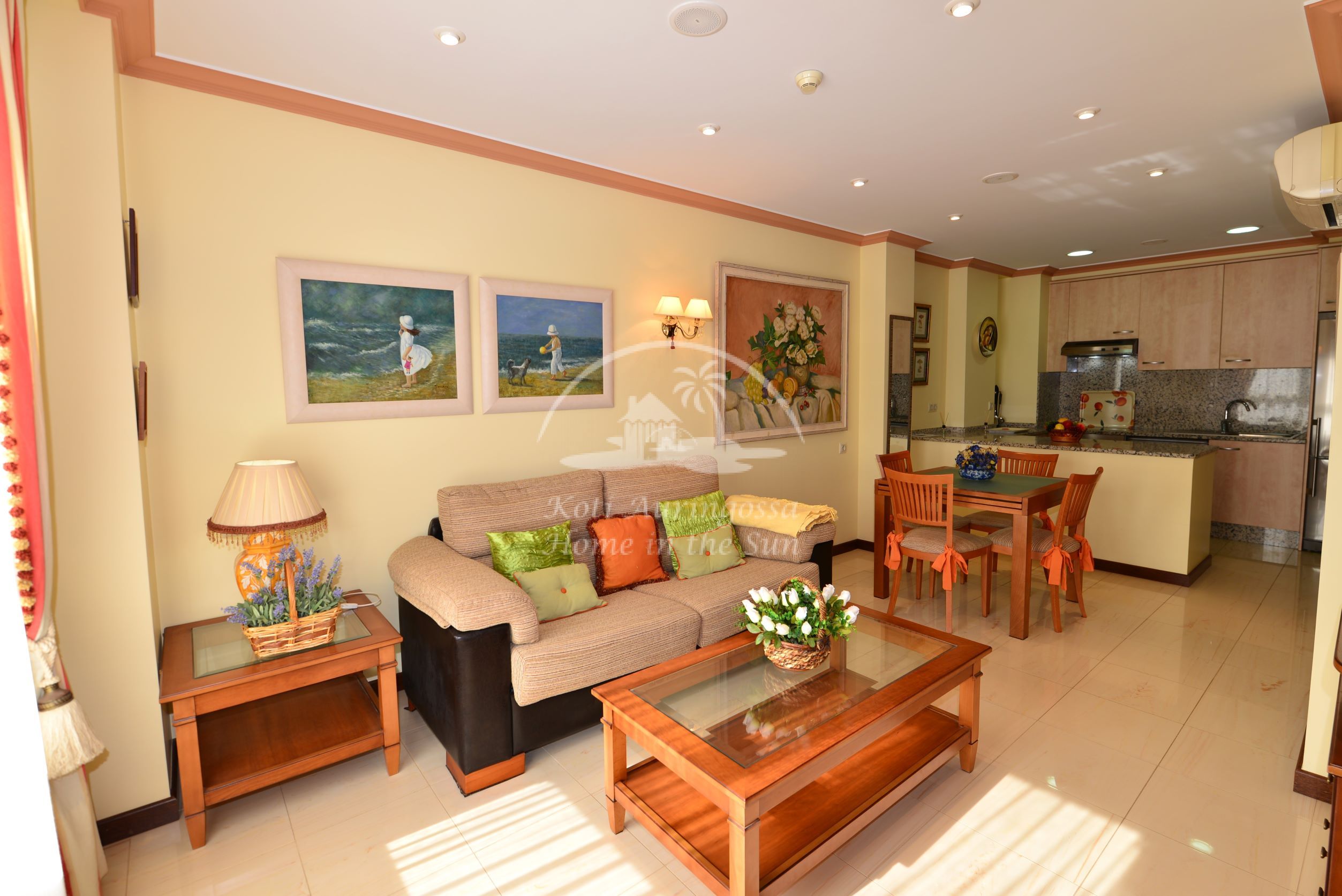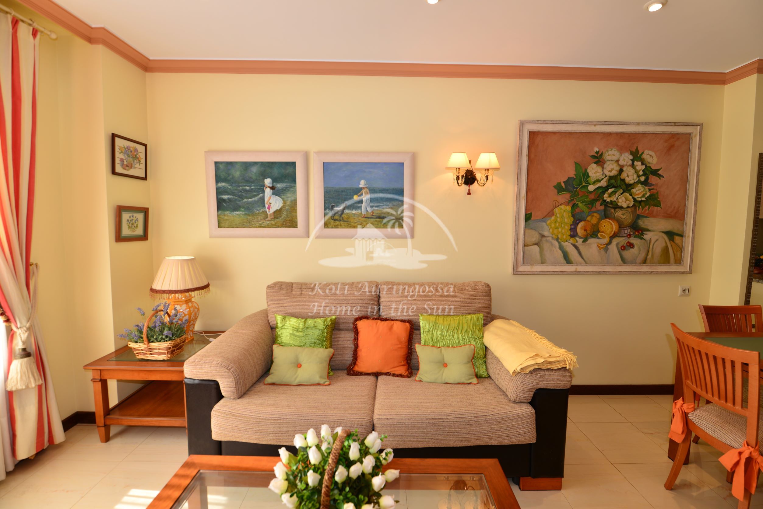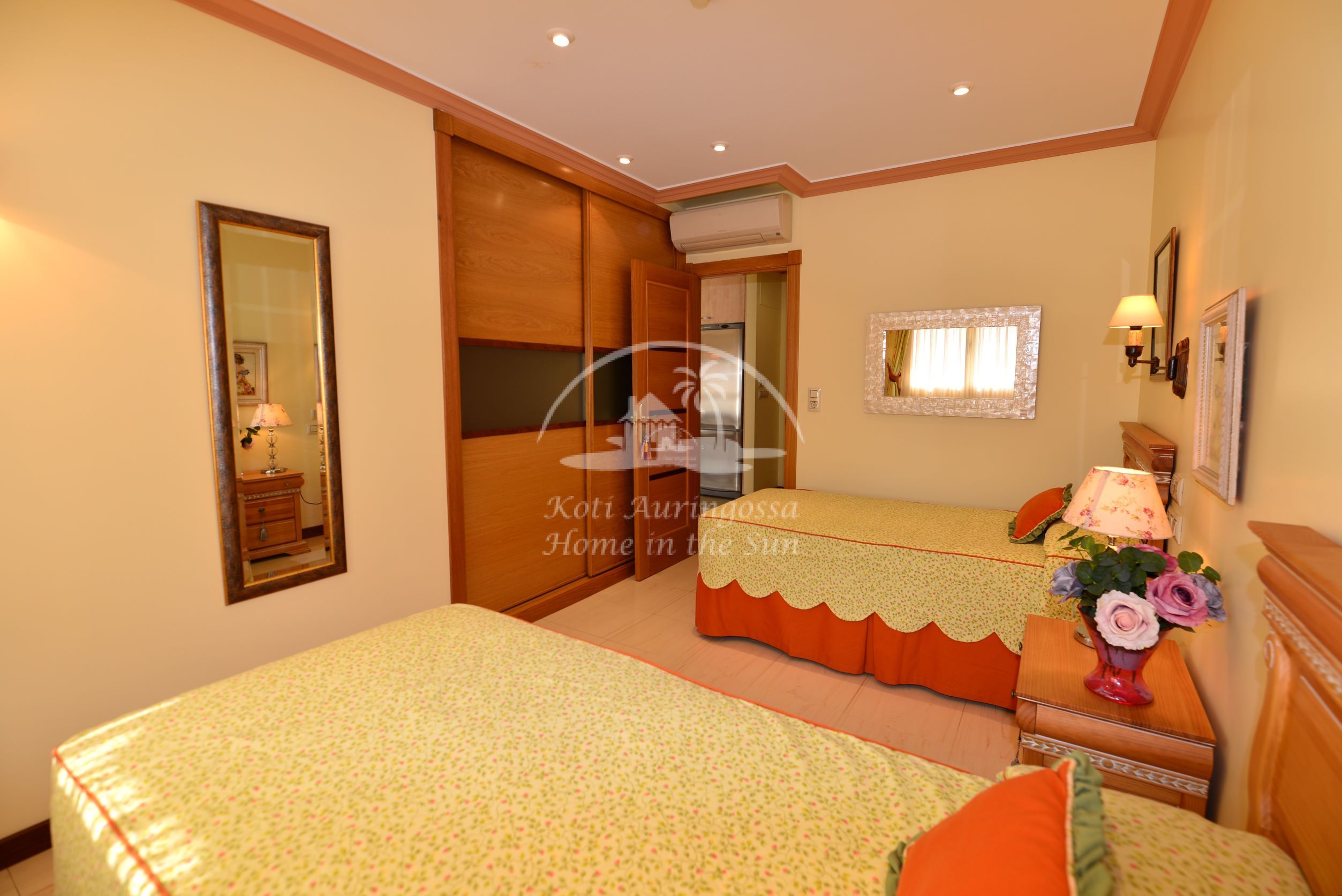 Tämä romanttinen asunto on kauniisti ja aistikkaasti sisustettu. Siinä on valoisa olohuone ja ruokailutila, täydellisesti varustettu laadukas ja moderni amerikkalainen keittiö, jossa on myös astianpesukone. 1 makuuhuone sekä 1 kylpyhuone. Olohuoneesta on käynti länteen päin olevalle aurinkoiselle terassille, josta on kivat näkymät sekä uima-altaalle että Los Bolichesin ylle. Olohuoneessa ja makuuhuoneessa on ilmastointi-lämpöpumppu, 100:n kanavan keskusradio/audio-system ja olohuoneessa taulu-TV. Nopea internet wifi yhteys valmiina. Taloyhtiössä on sauna sekä lämmitettävä uima-allas ja poreallas kauniin vehreän puutarhan ympäröimänä. Allasalue on auki ympäri vuoden. Alakerran vastaanotossa on 24.00 asti vastaanottovirkailija – osa heistä puhuu Suomea. Kaikki keskustan palvelut on lähellä, lähin ruokakauppa pääsisäänkäyntiä vastapäätä ja matkaa merenrantaankin on vain noin 600 metriä.