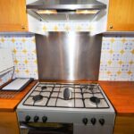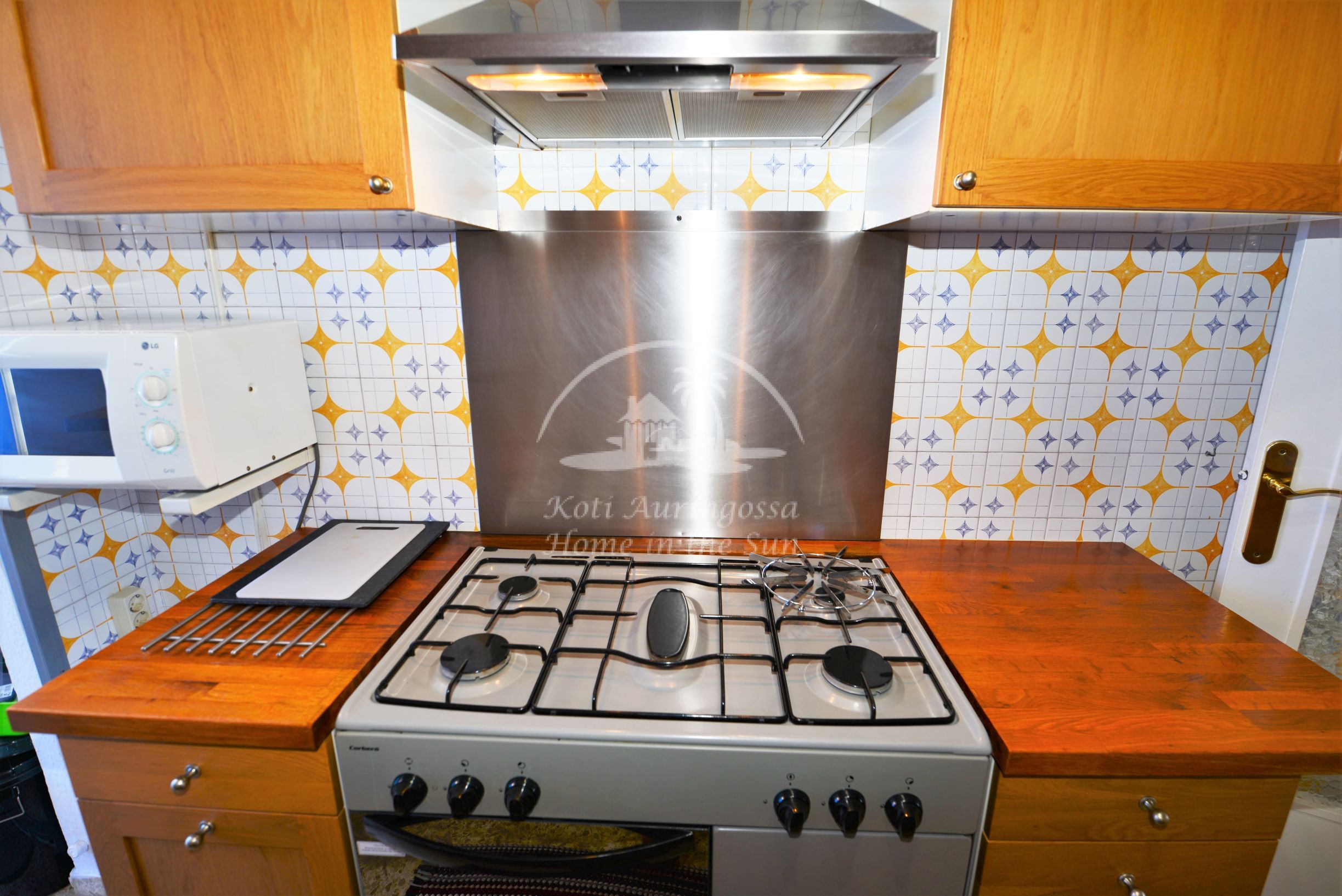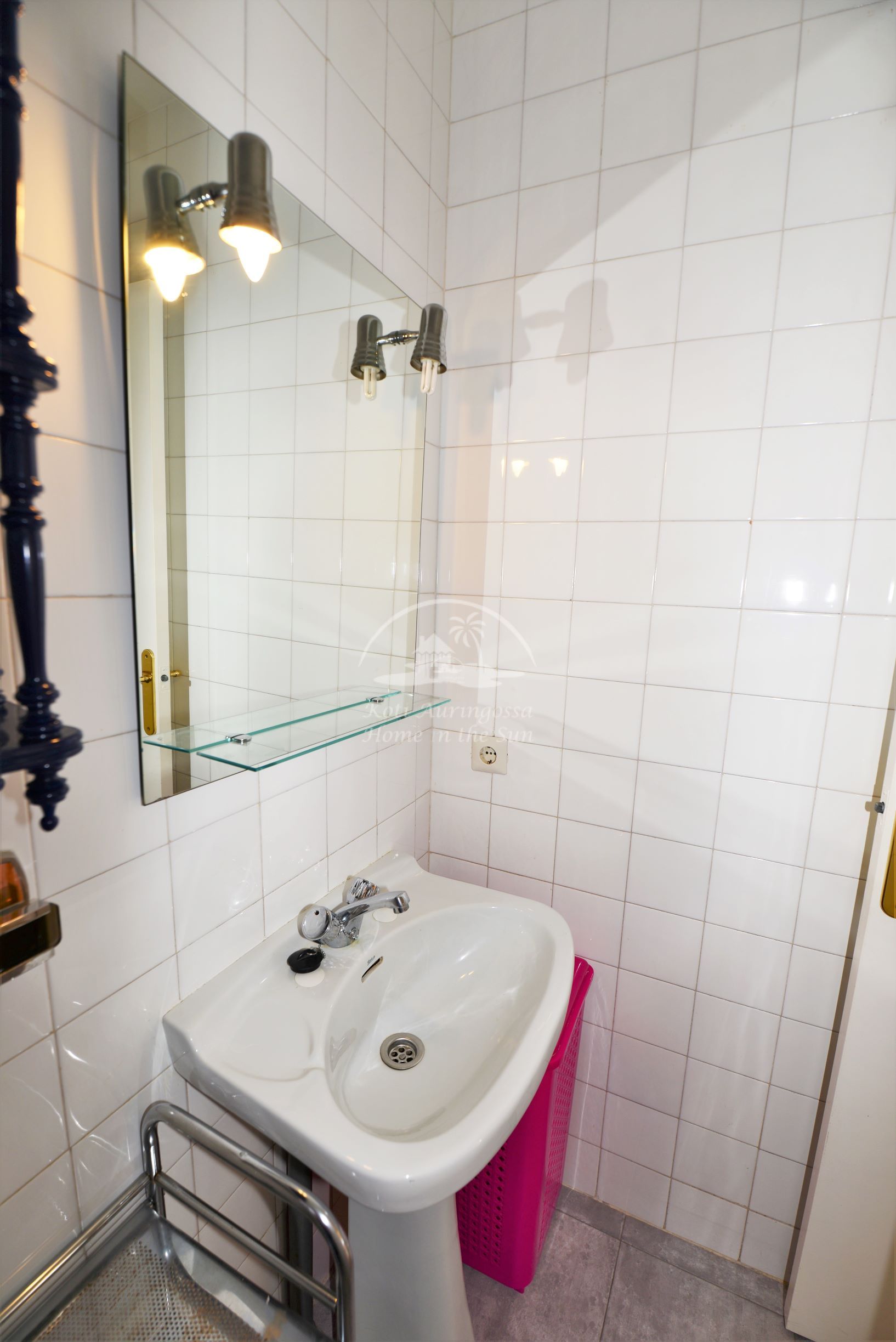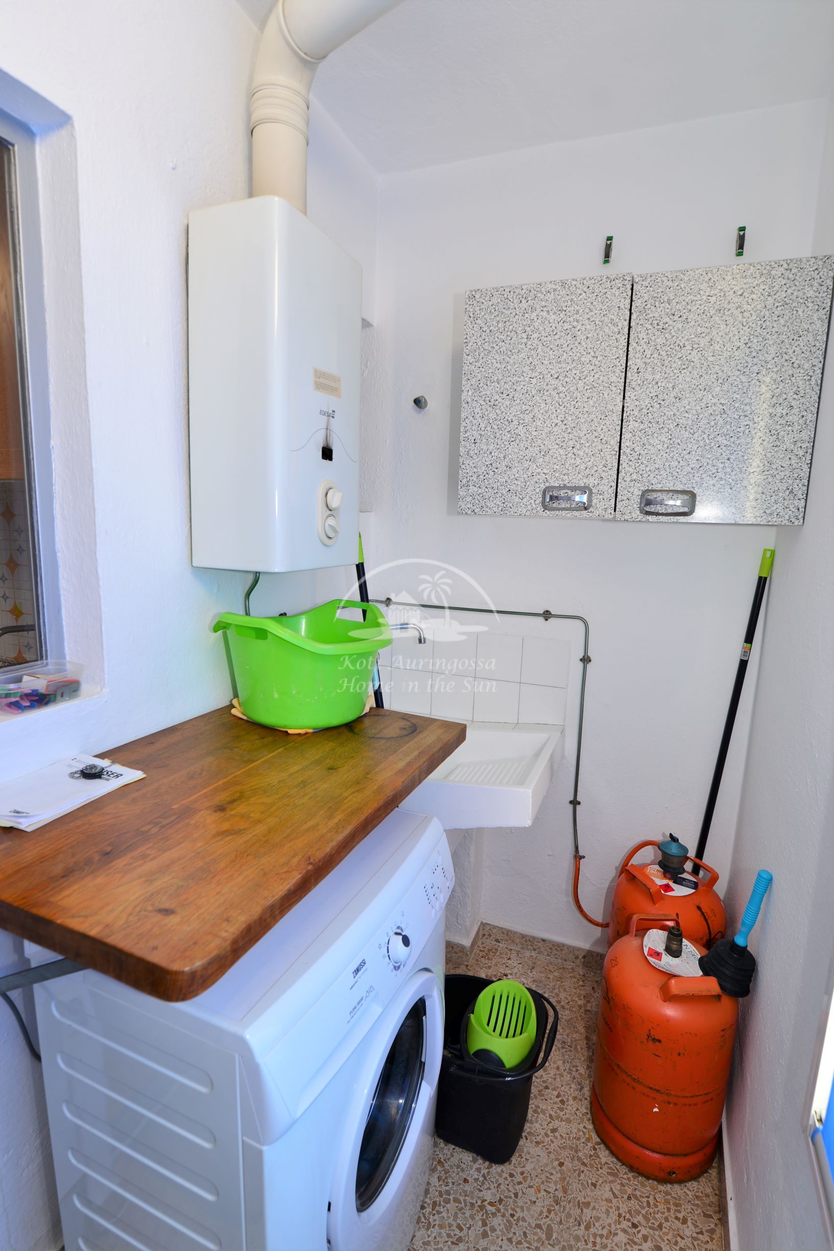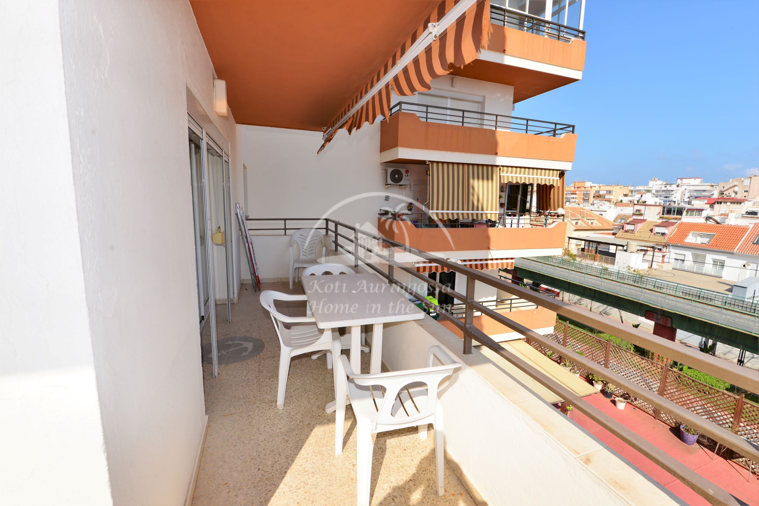 Avara valoisa olohuone ja ruokailutila. Olohuoneesta on käynti aurinkoiselle, koko asunnon kiertävälle L muotoiselle etelä – länsi suuntaiselle terassille. Terassilta on hienot näkymät kaupungin ylle. Tilava keittiö, jonka perällä kodinhoitohuone, jossa pesukone ja kaasulla toimiva vedenlämmitin.