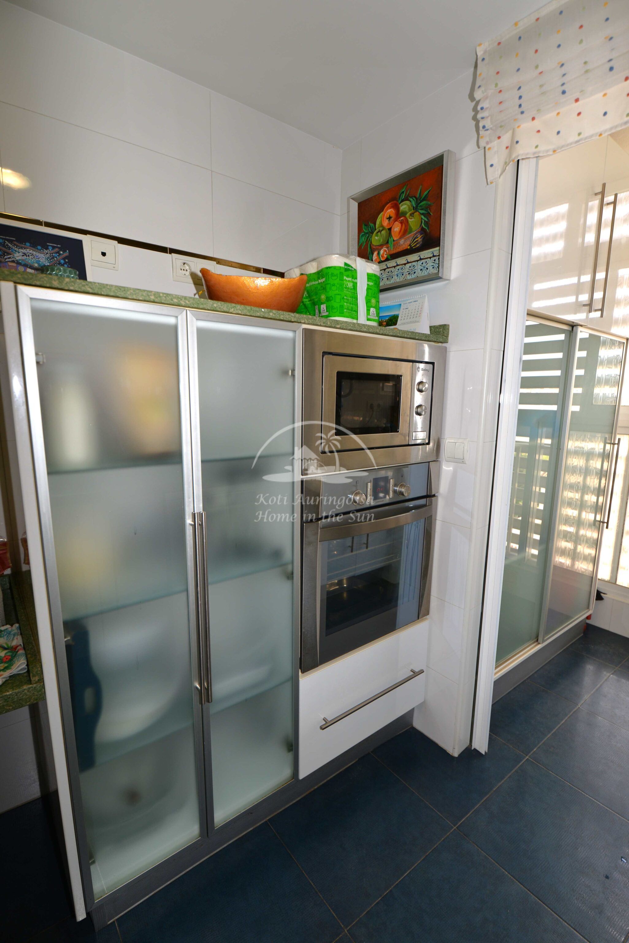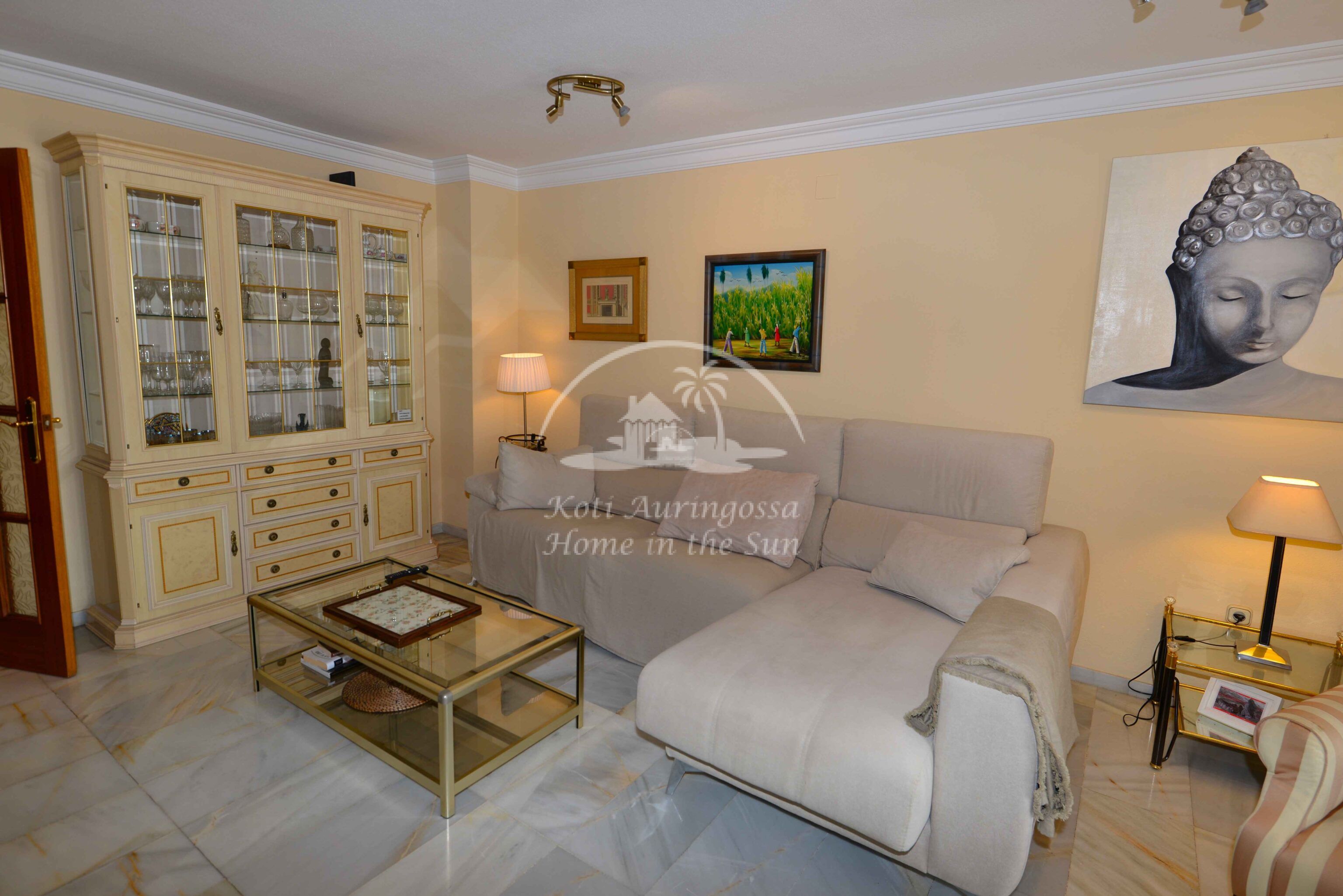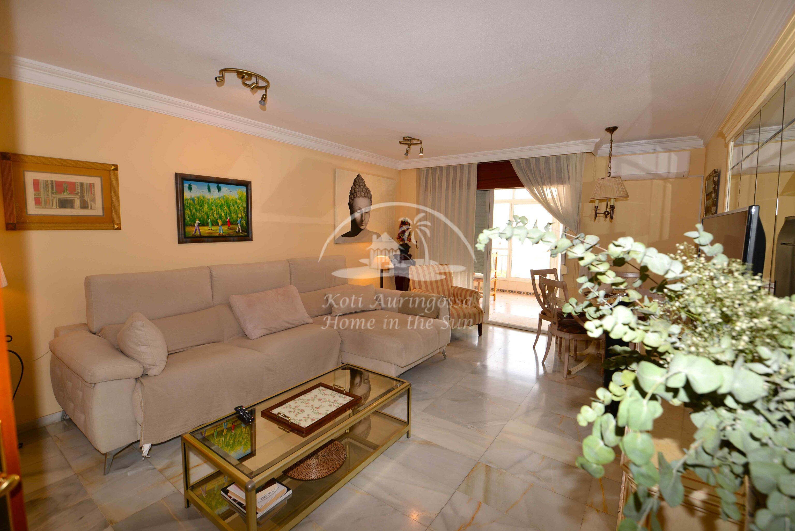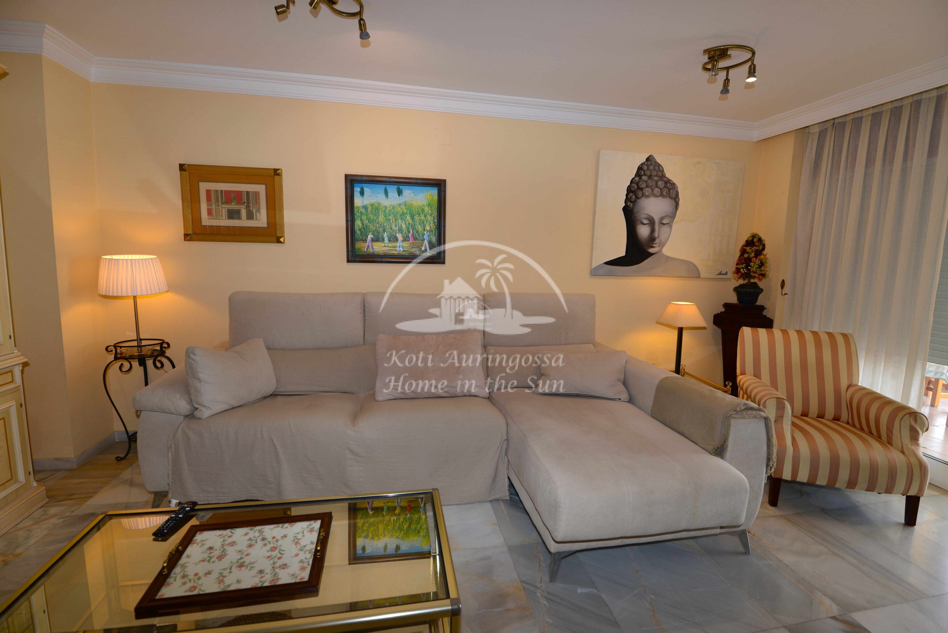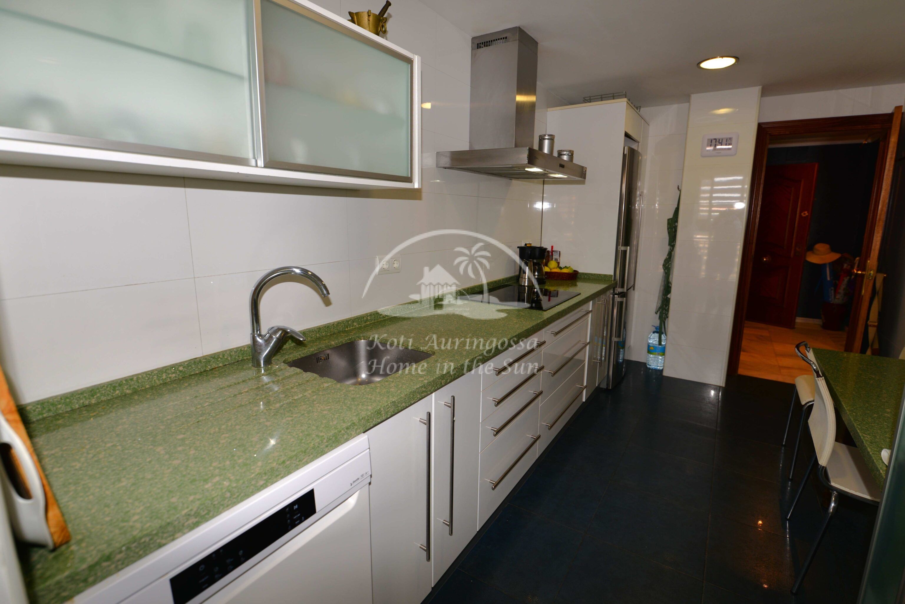 Avara olohuone ja ruokailutila, olohuoneesta on käynti suurelle koko huoneiston kiertävälle, etelä / itään päin olevalle lasitetulle terassille. Terassilta on kivat näkymät taloyhtiön uima-allas alueelle ja kaupungin ylle. Täydellisesti varustettu moderni keittiö kaikilla mukavuuksilla. 3 makuuhuonetta.