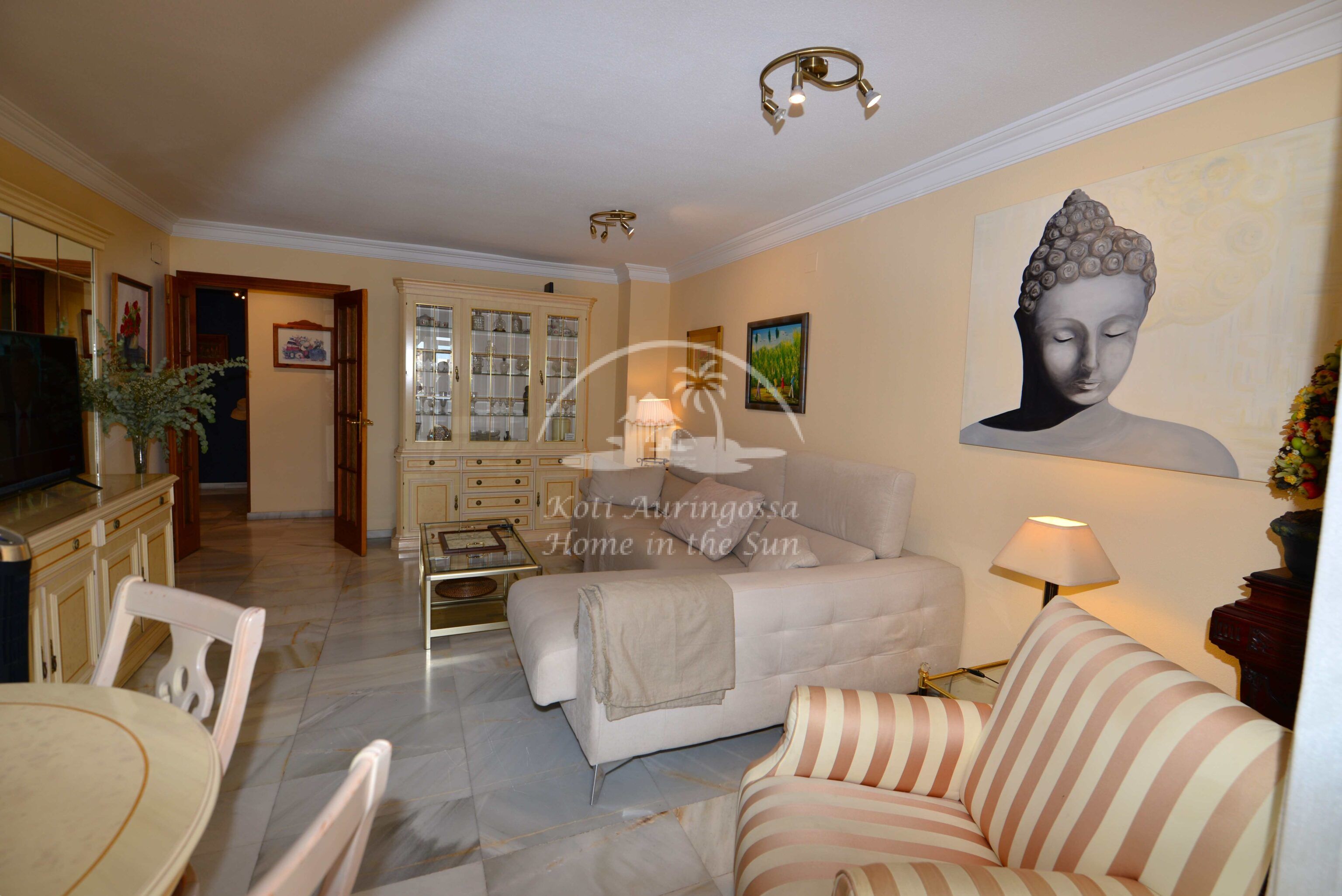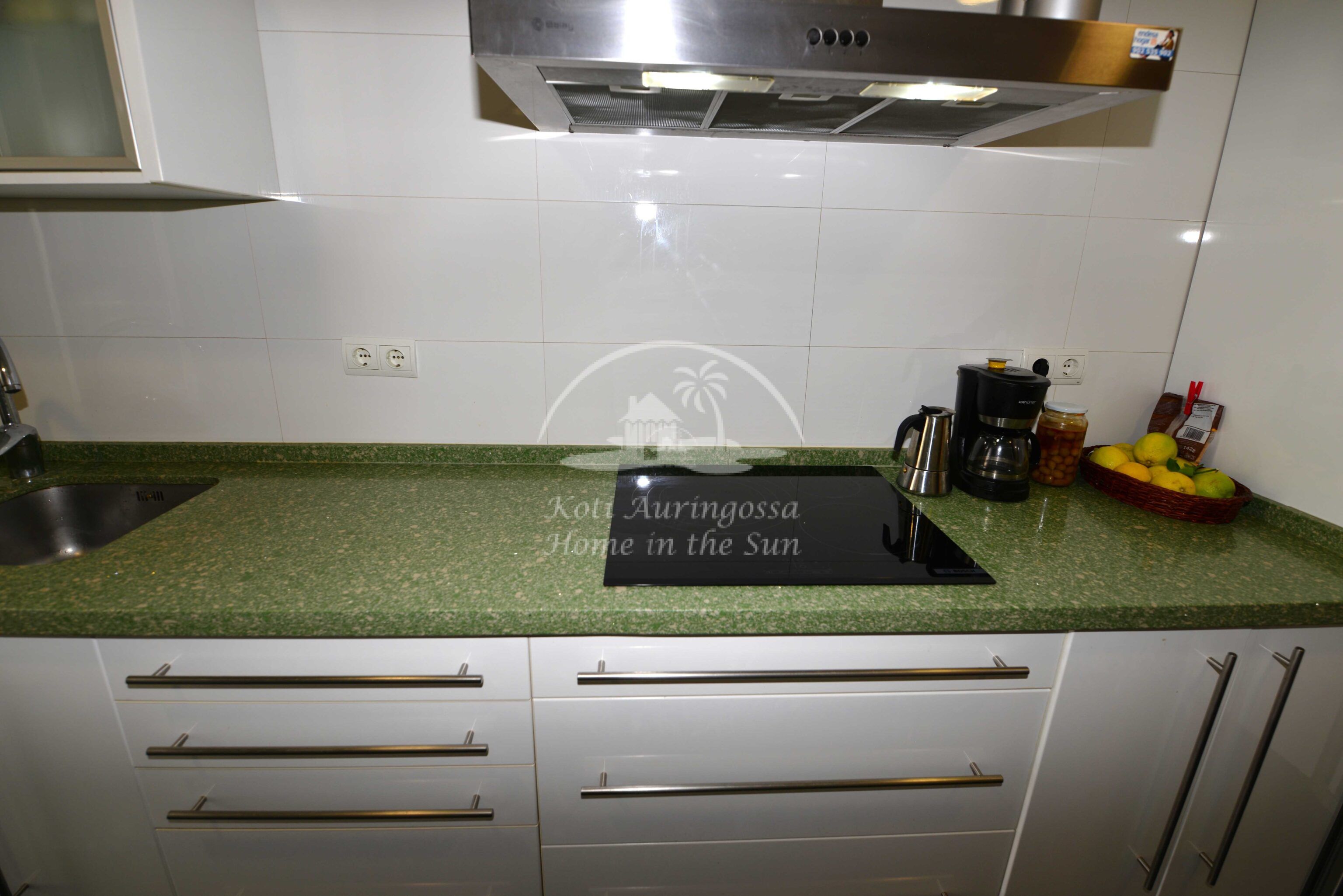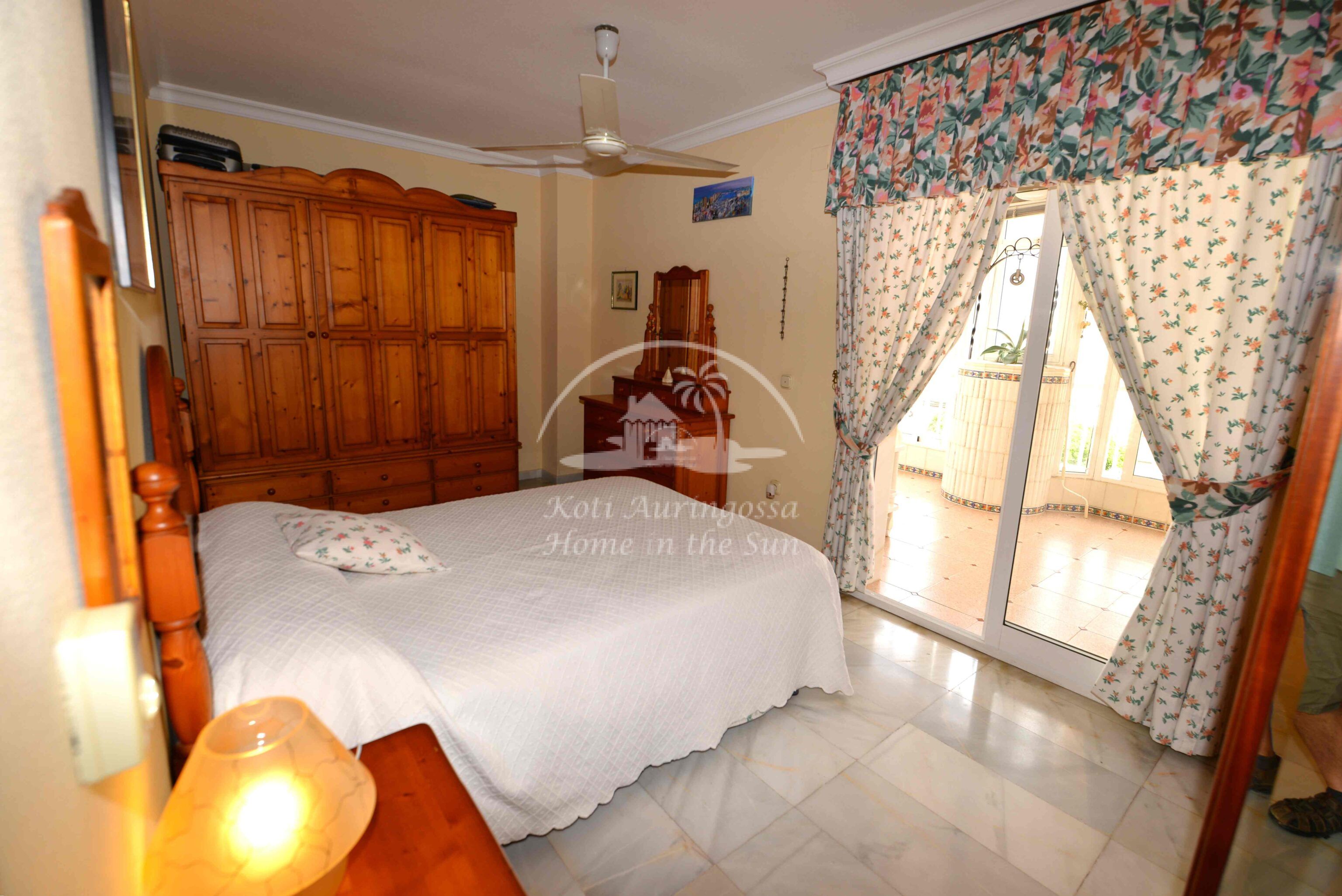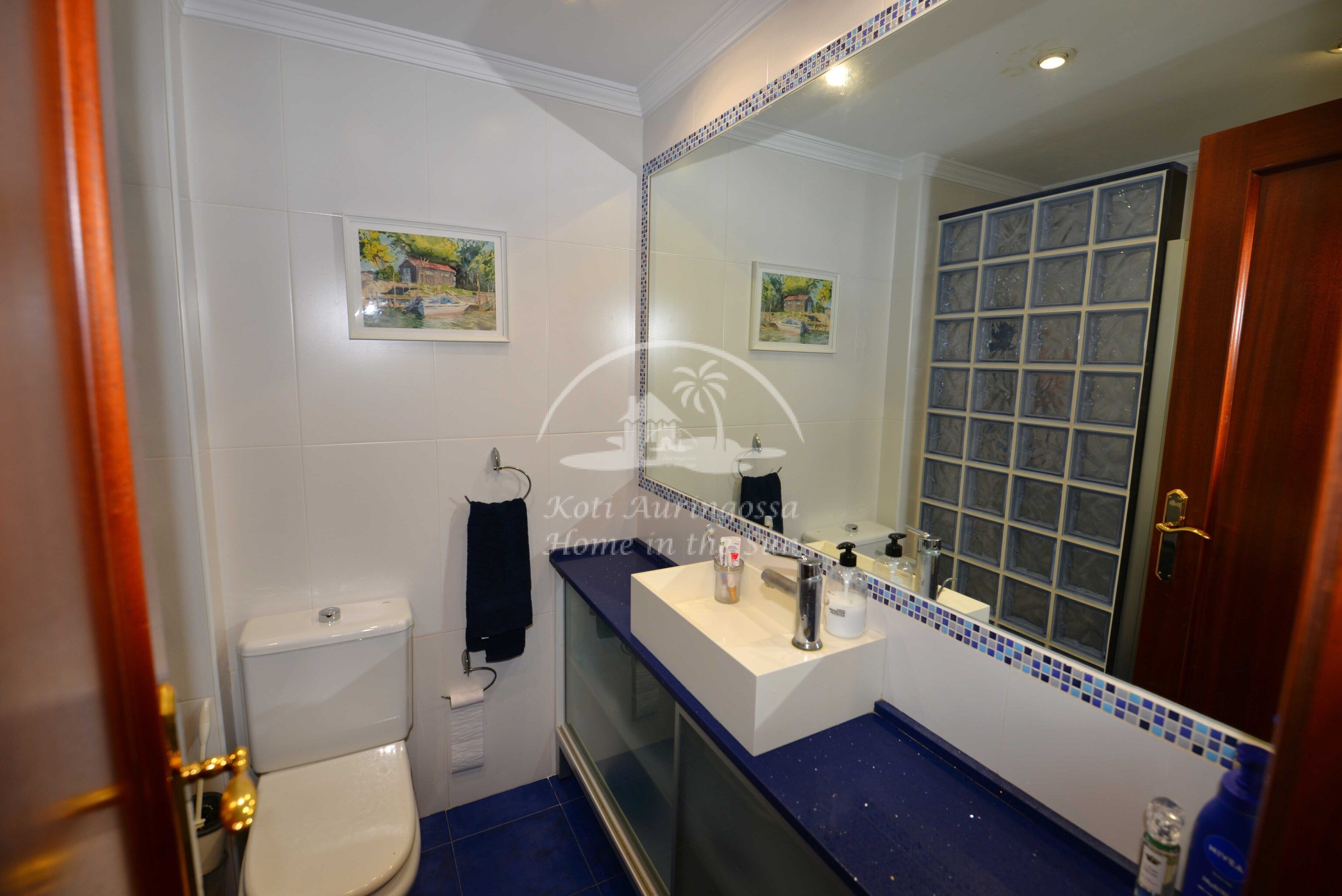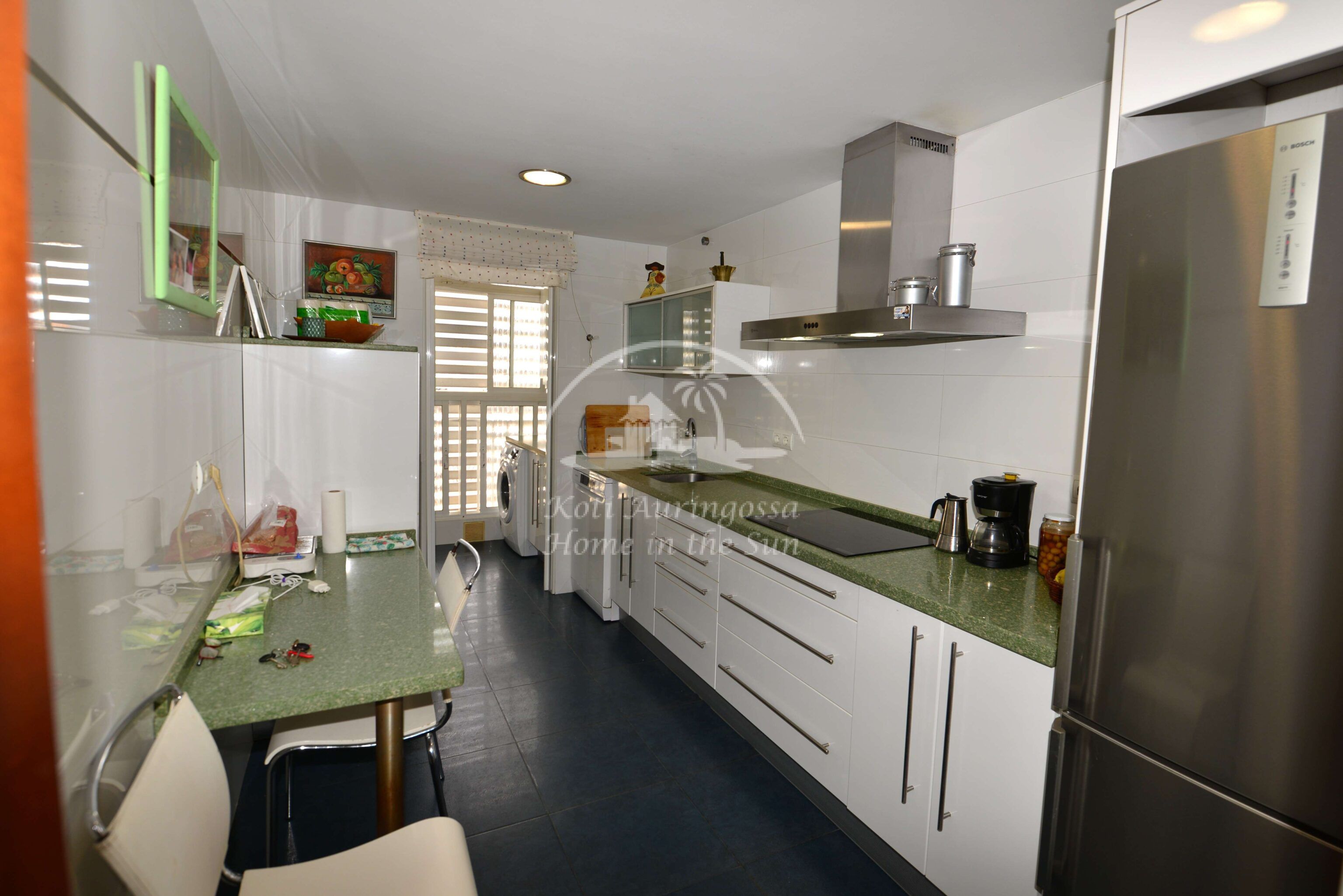 Avara olohuone ja ruokailutila, olohuoneesta on käynti suurelle koko huoneiston kiertävälle, etelä / itään päin olevalle lasitetulle terassille. Terassilta on kivat näkymät taloyhtiön uima-allas alueelle ja kaupungin ylle. Täydellisesti varustettu moderni keittiö kaikilla mukavuuksilla. 3 makuuhuonetta.