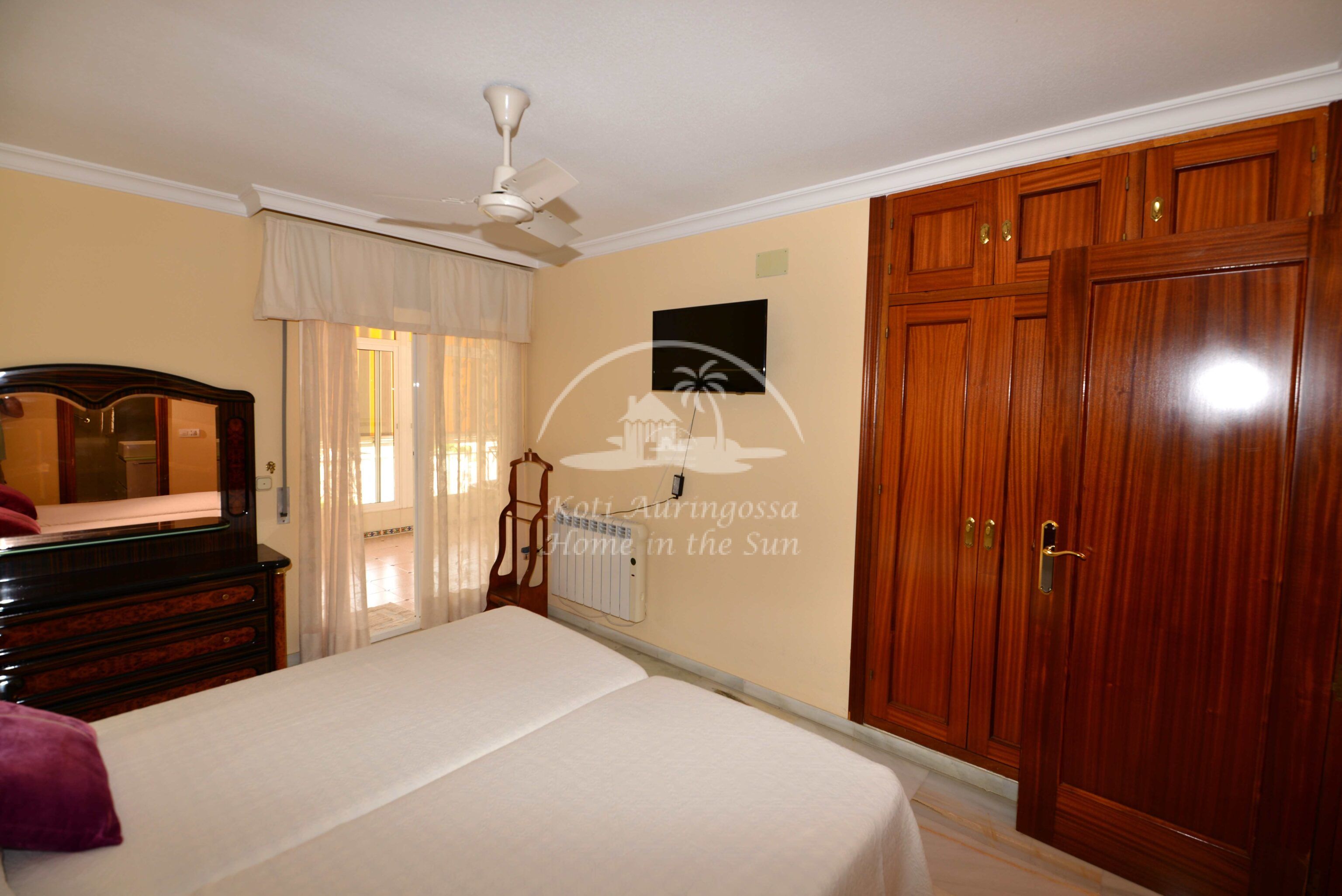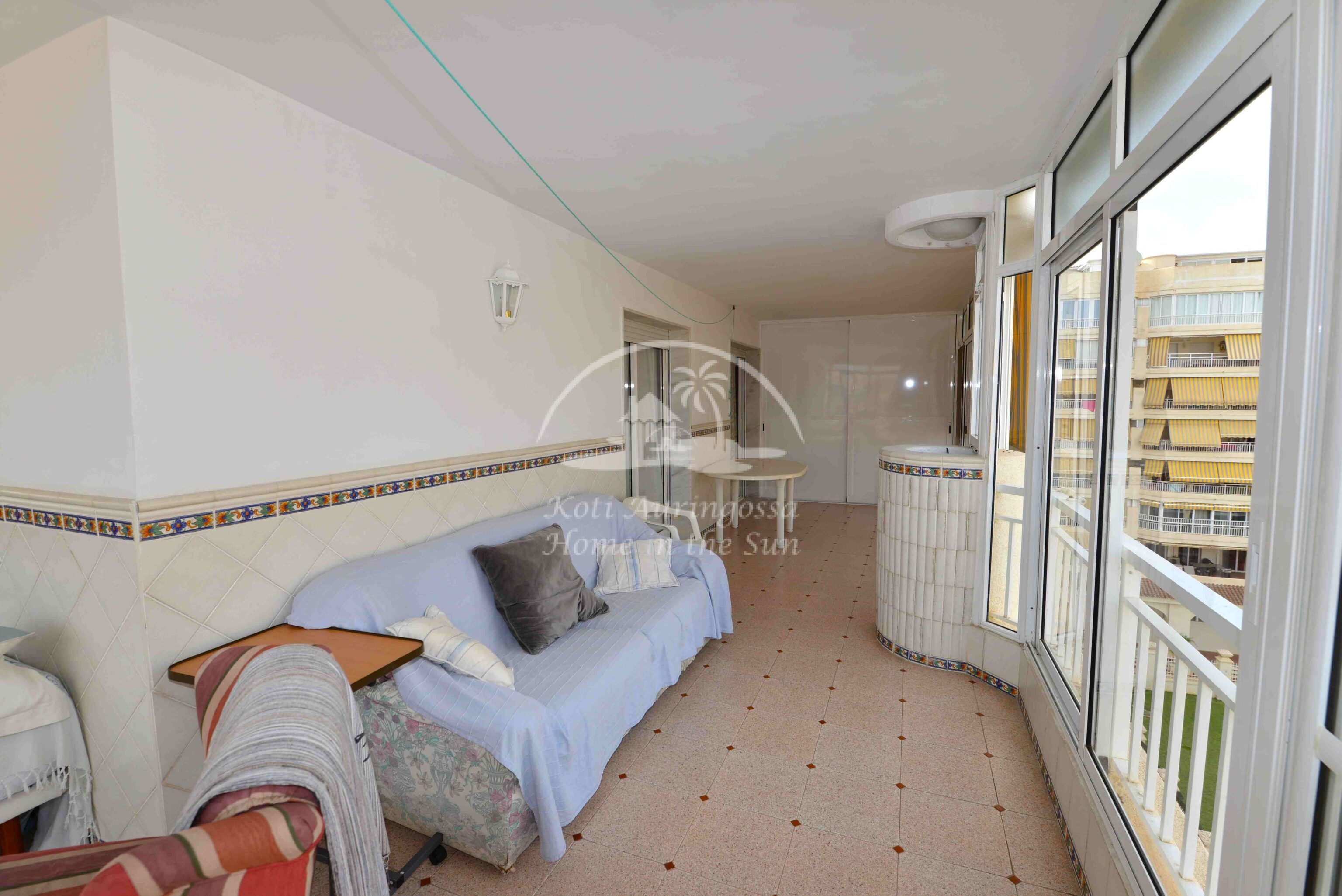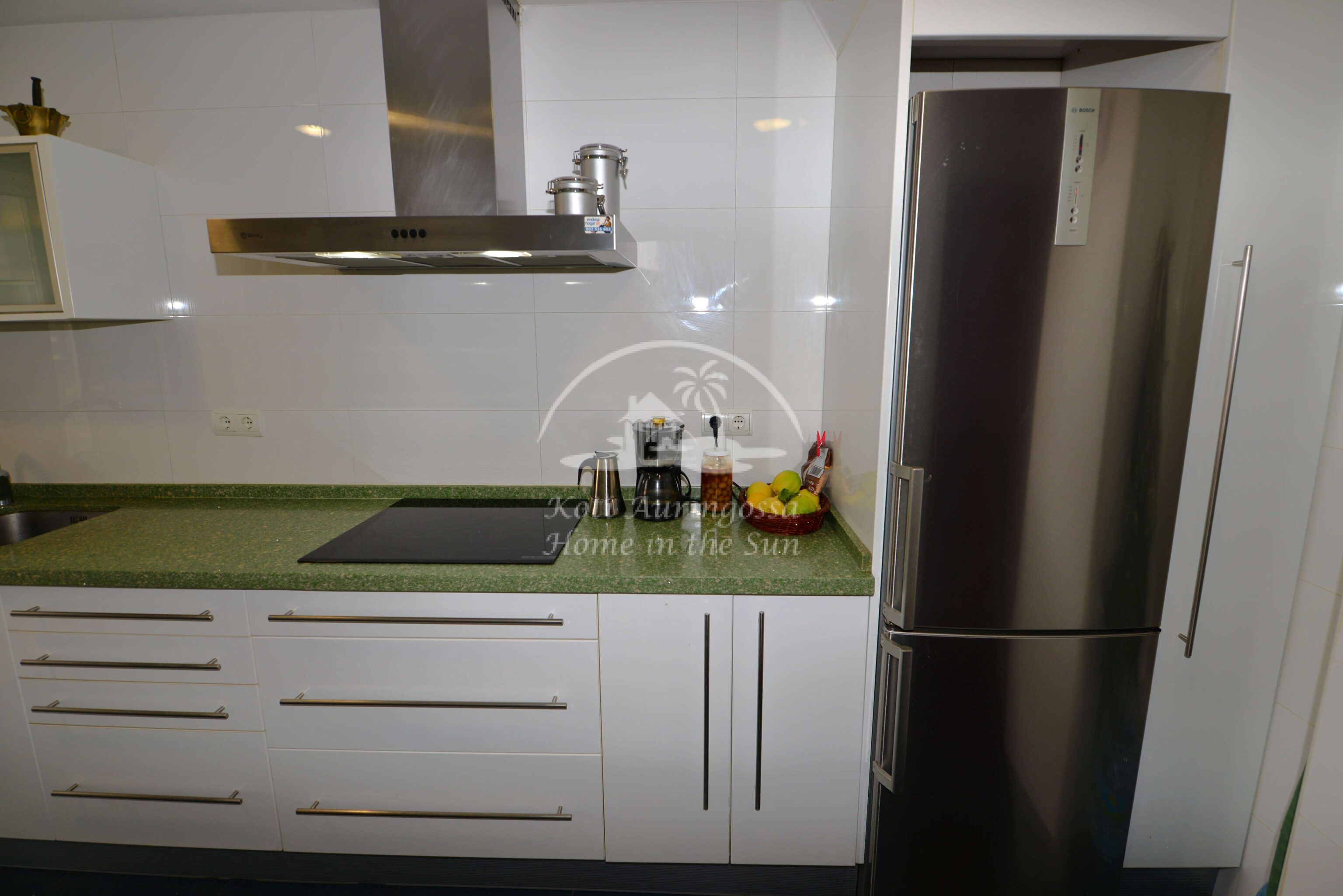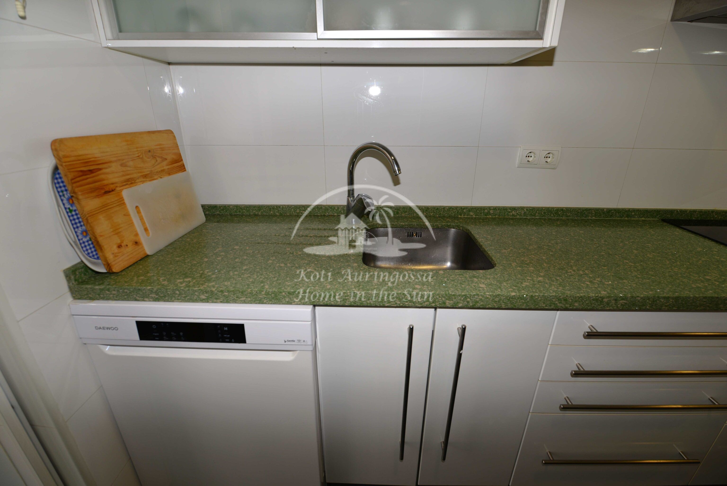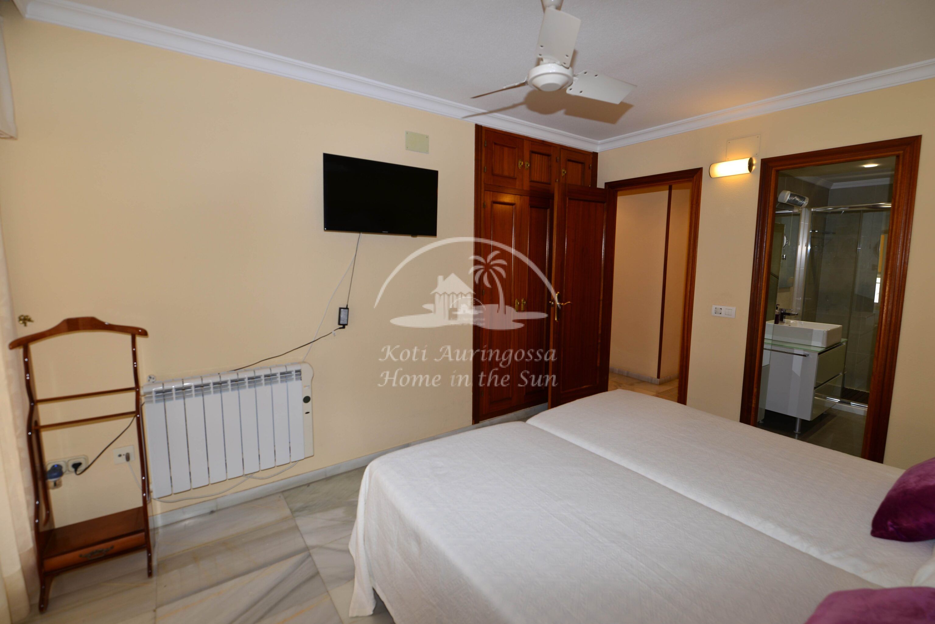 Avara olohuone ja ruokailutila, olohuoneesta on käynti suurelle koko huoneiston kiertävälle, etelä / itään päin olevalle lasitetulle terassille. Terassilta on kivat näkymät taloyhtiön uima-allas alueelle ja kaupungin ylle. Täydellisesti varustettu moderni keittiö kaikilla mukavuuksilla. 3 makuuhuonetta.