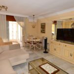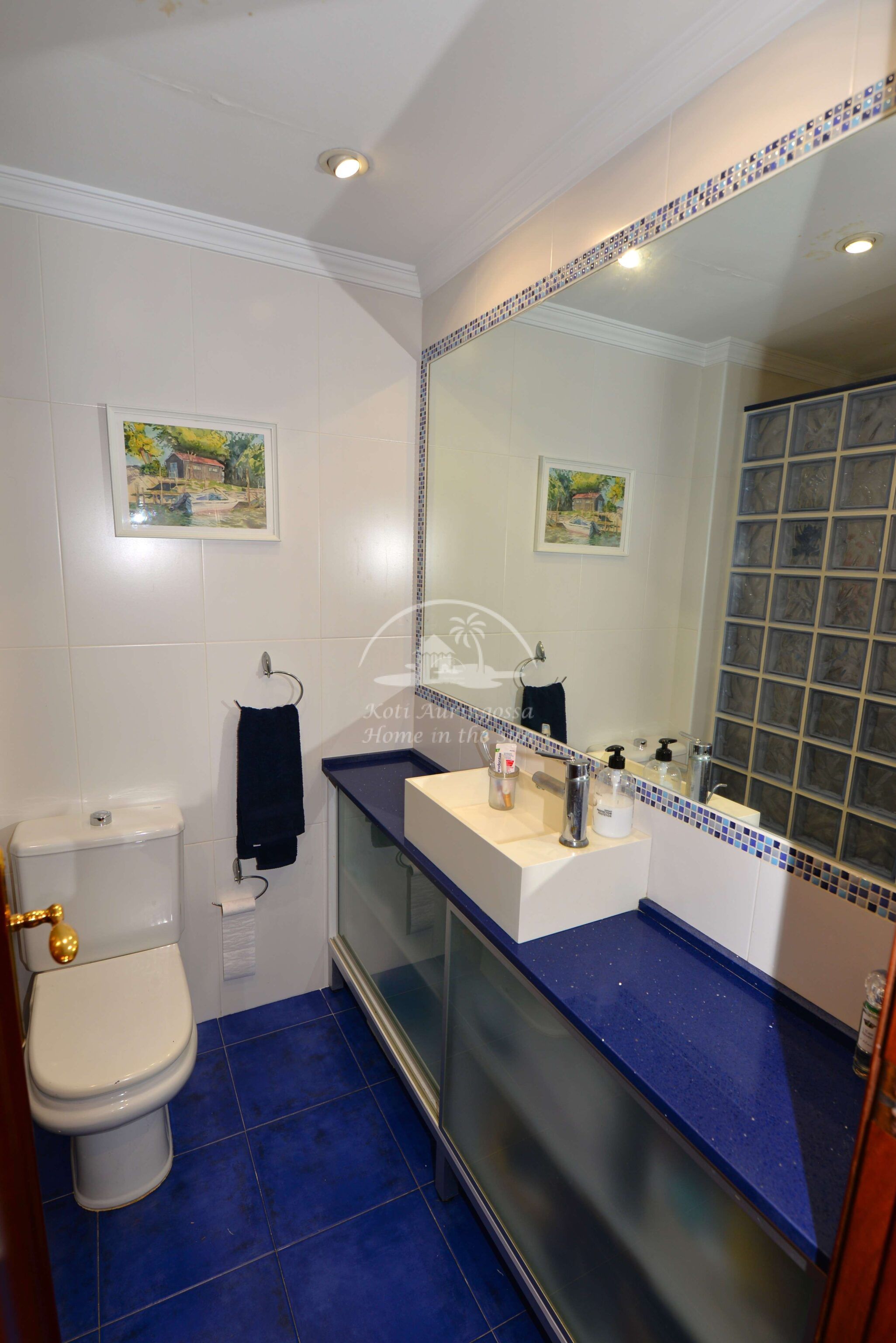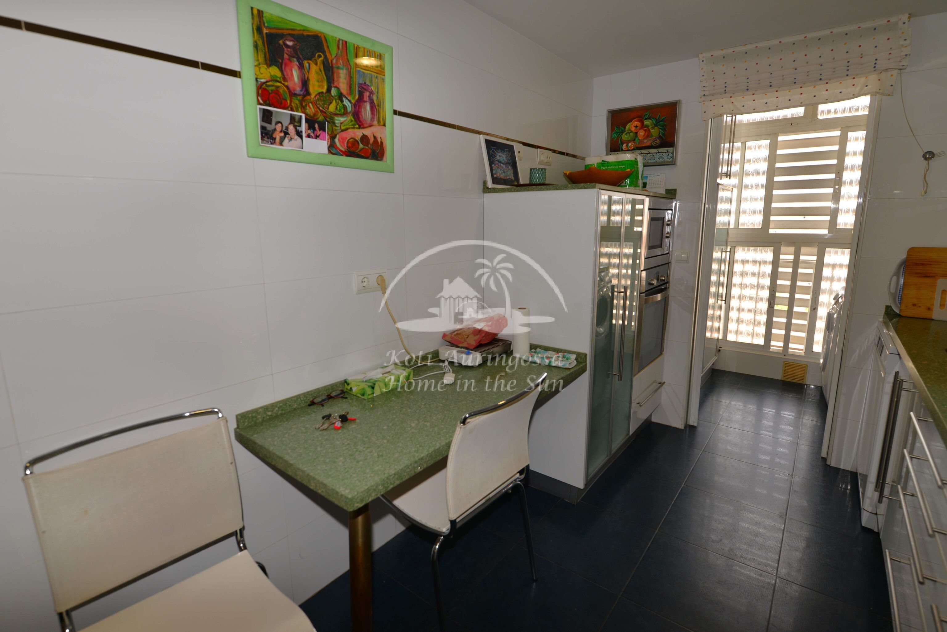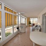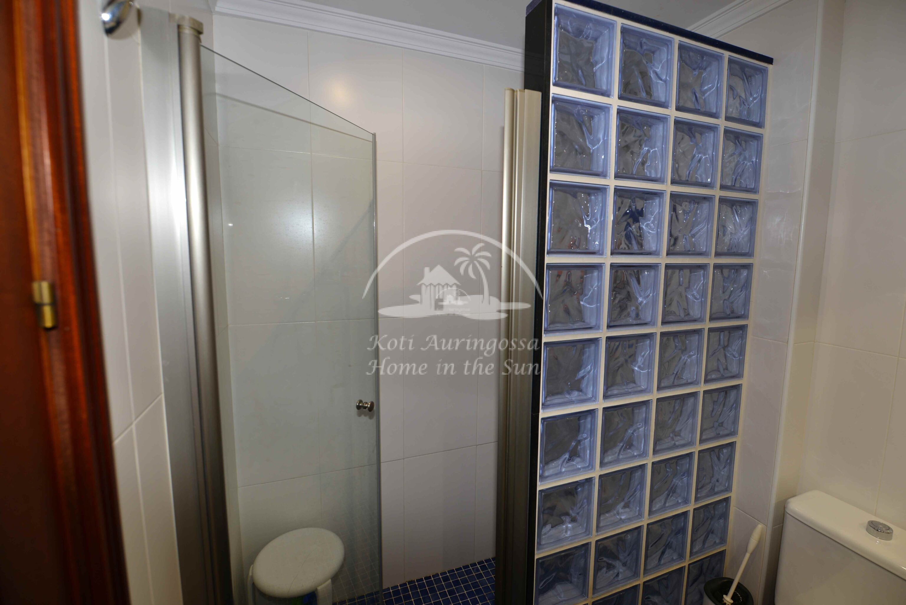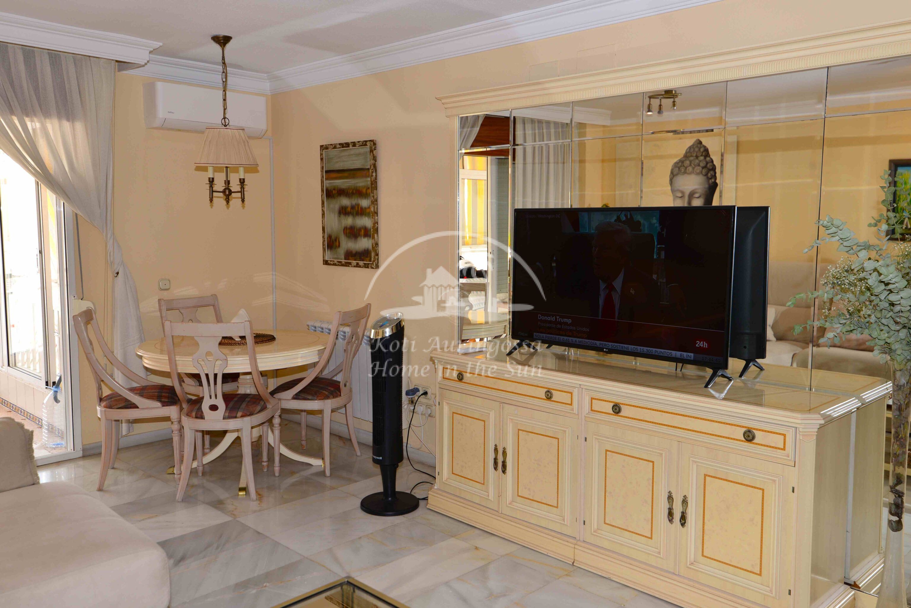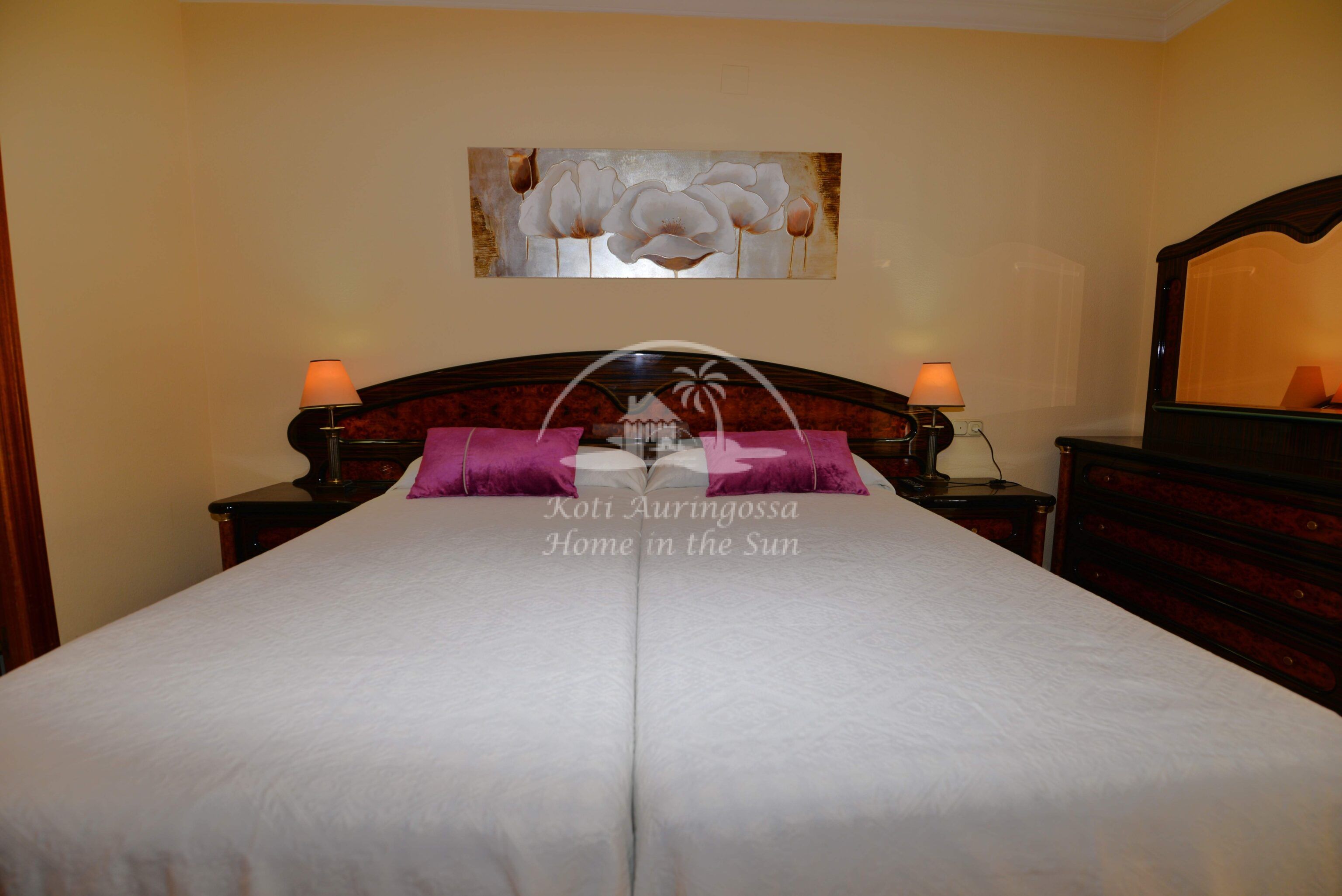 Avara olohuone ja ruokailutila, olohuoneesta on käynti suurelle koko huoneiston kiertävälle, etelä / itään päin olevalle lasitetulle terassille. Terassilta on kivat näkymät taloyhtiön uima-allas alueelle ja kaupungin ylle. Täydellisesti varustettu moderni keittiö kaikilla mukavuuksilla. 3 makuuhuonetta.