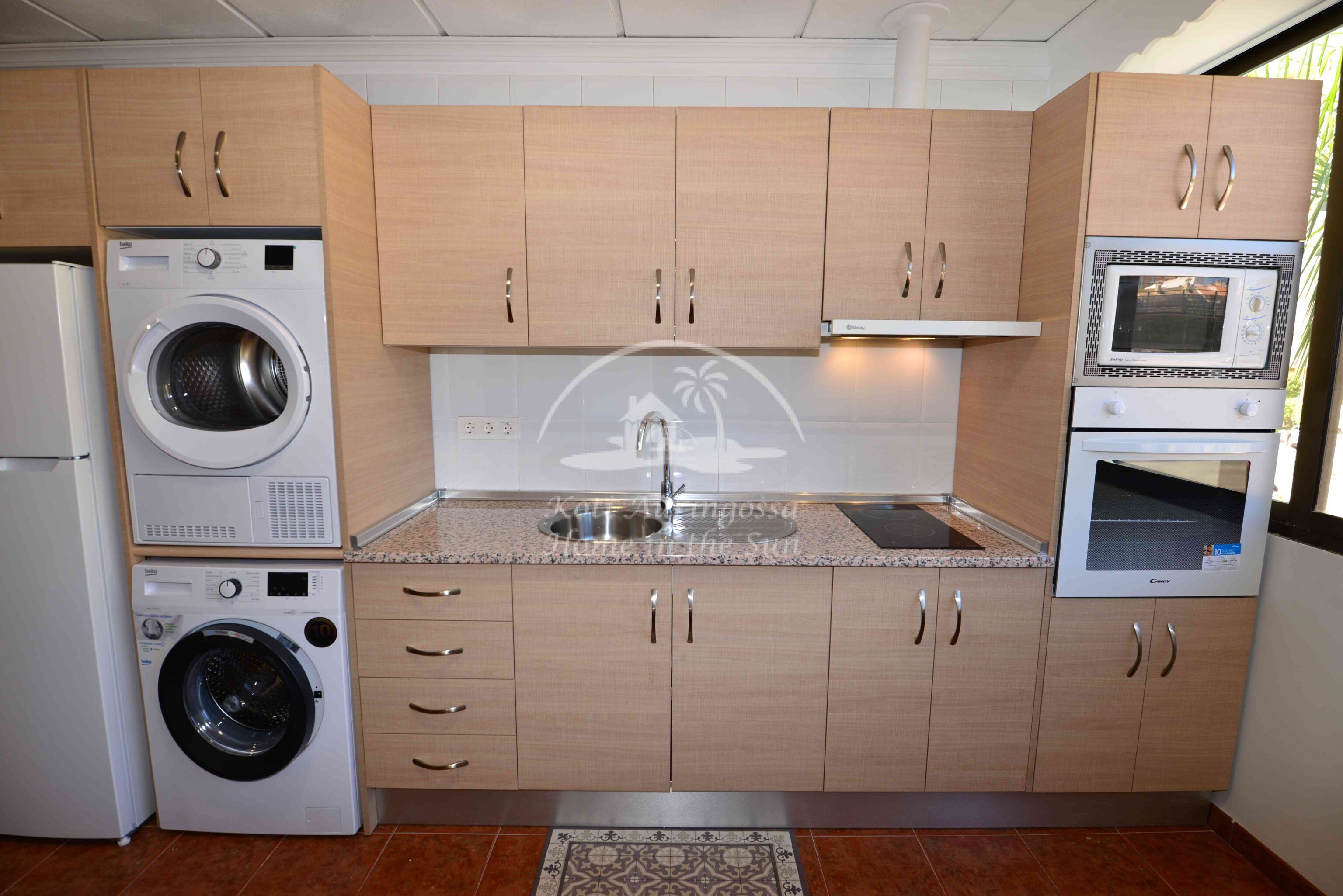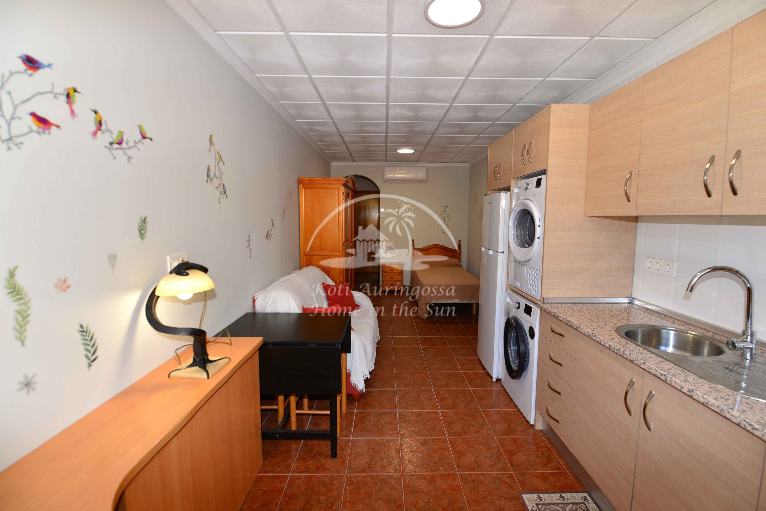 Kiva ja kohtalaisen tilava yksiö. Olohuone-ruokailutila-yhdistelmä ja sen yhteydessä oleva avara valoisa avokeittiö. Keittiössä kaikki toimii sähköllä ja sieltä löytyy sekä pesukone että kuivausrumpu. Asunnossa on 1 kylpyhuone suihkukaapilla sekä ilmastointi/lämpöpumppu olohuoneessa. Nopea valokuitu wifi nettiyhteys sisältyy vuokraan. Sijainti on hyvä; kaikki keskustan palvelut lähellä ja merenrantaan on matkaa noin 300 metriä. Tässä asunnossa ei ole parveketta.