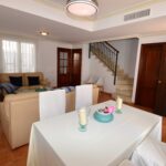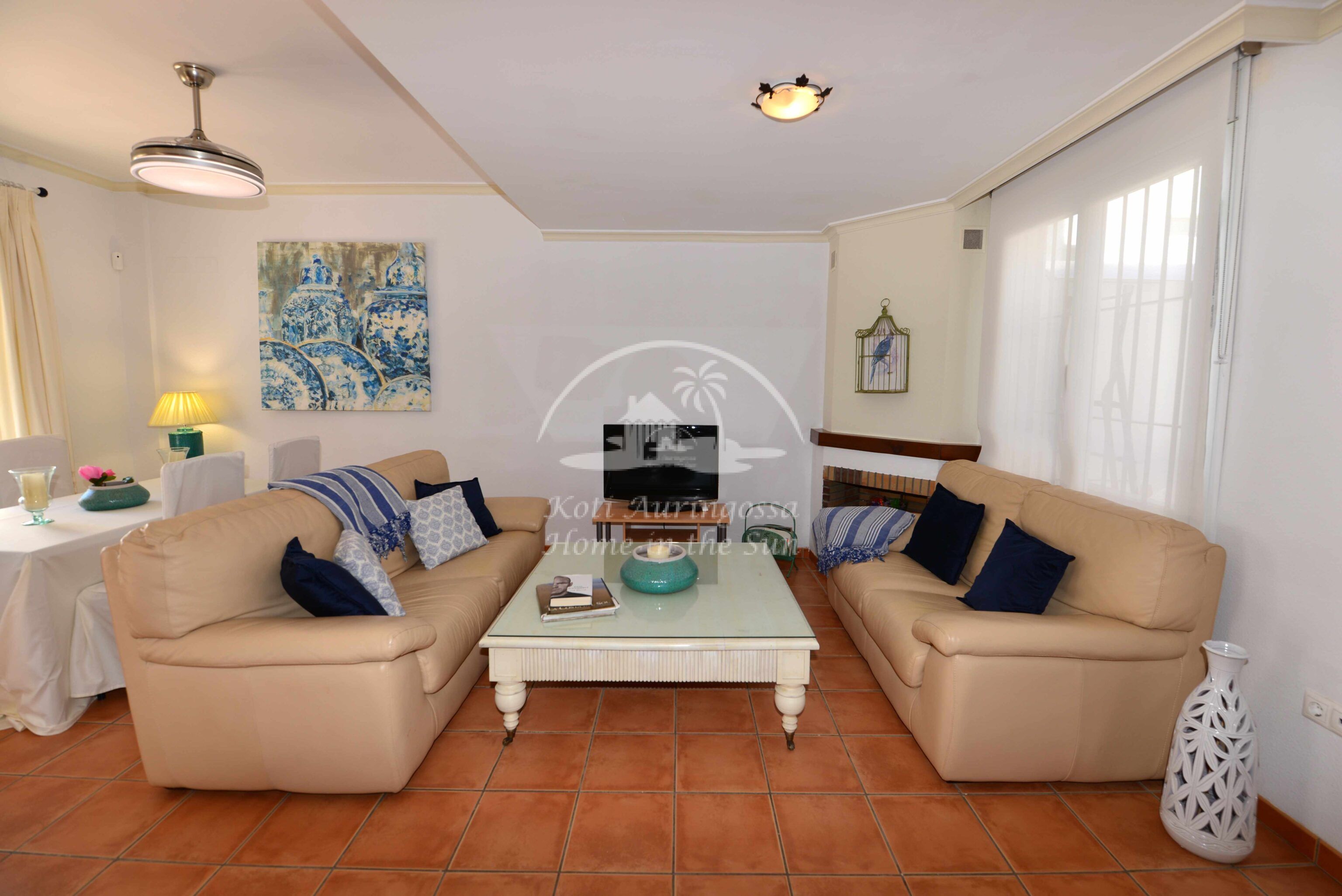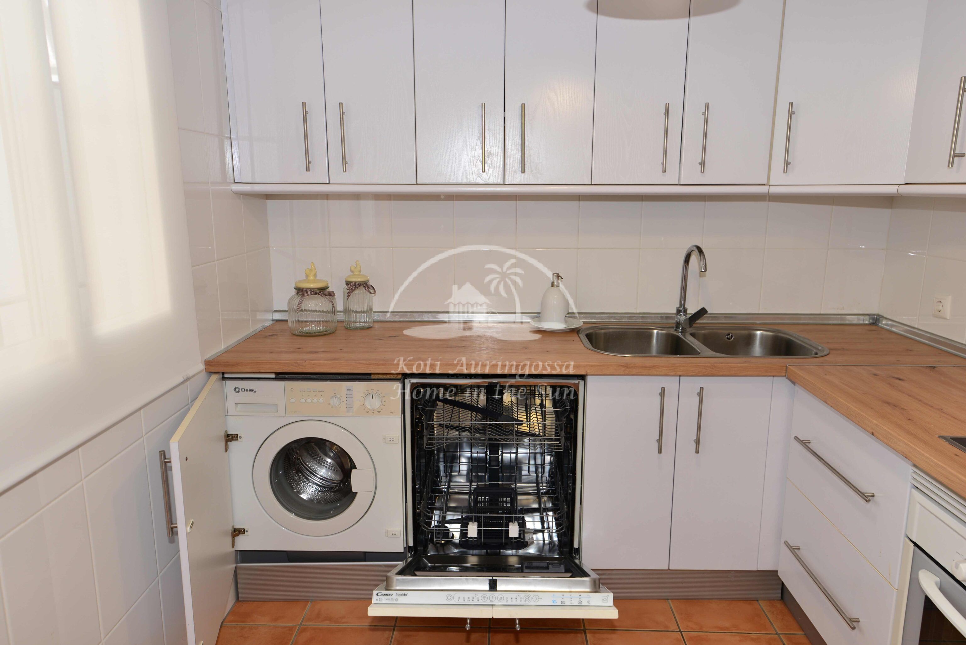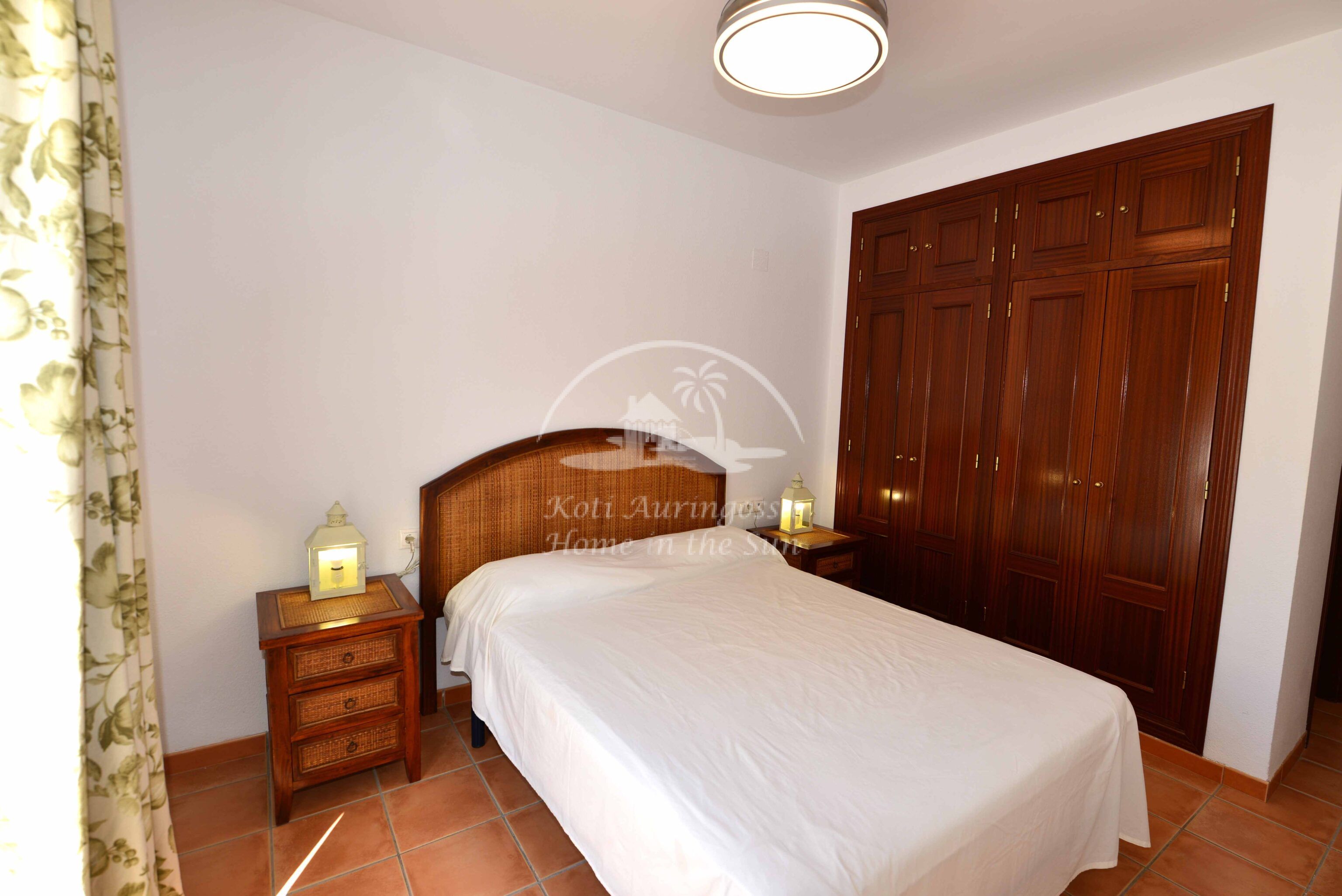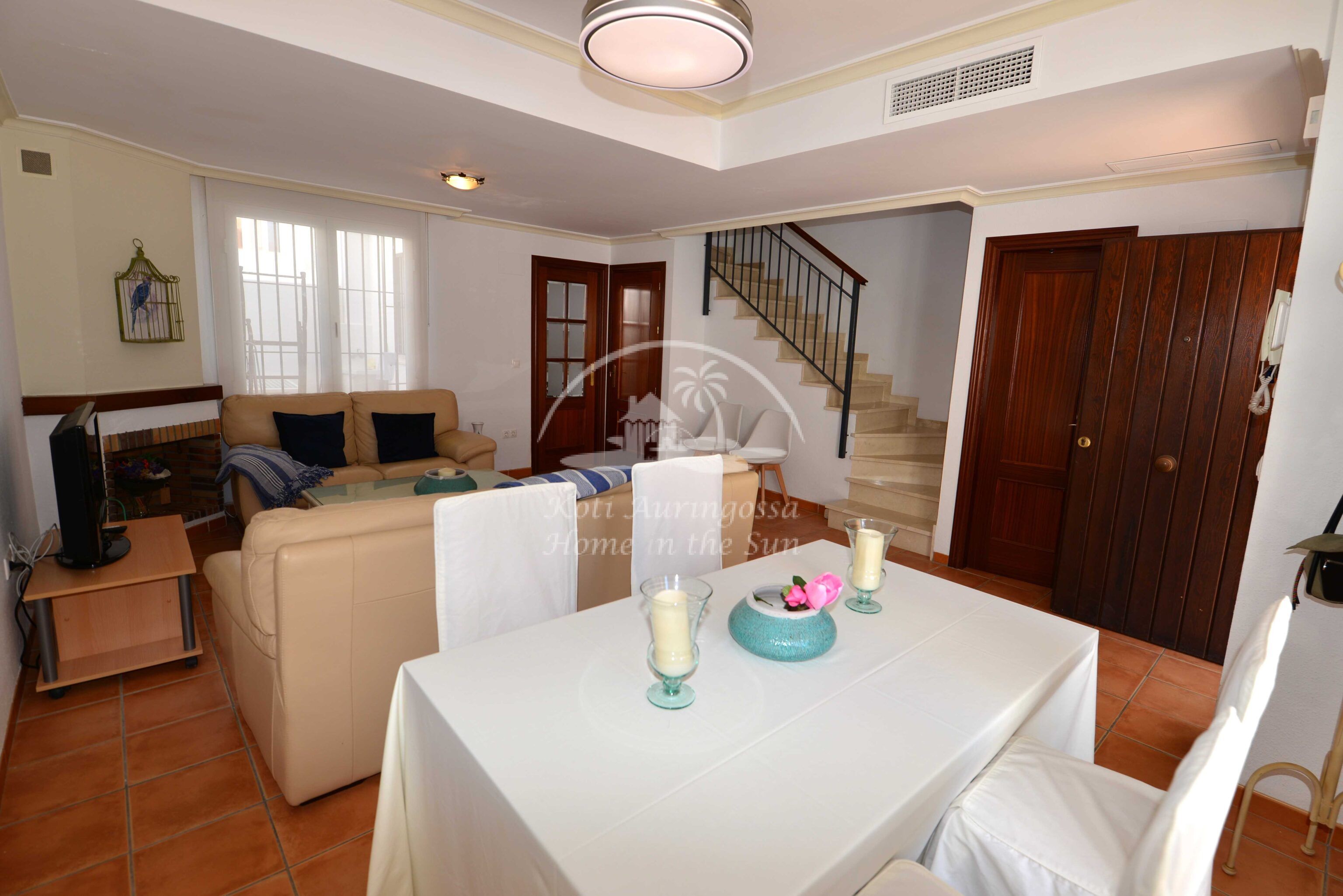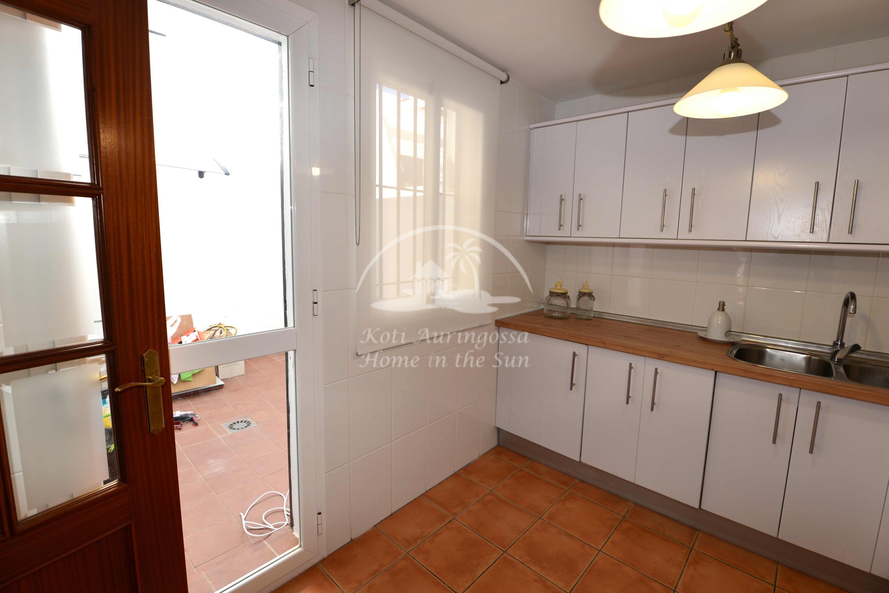 Asunto on kodikkaasti kalustettu ja sisustettu. Alakerrassa pää sisäänkäynnin yhteydessä on talon edessä reilun kokoinen länteen päin oleva aurinkoinen terassi. Valoisa olohuone ja ruokailutila. Tilava keittiö, jossa on myös astianpesukone, keittiöstä on käynti sisäpatiolle. 1 wc. Toisessa kerroksessa on