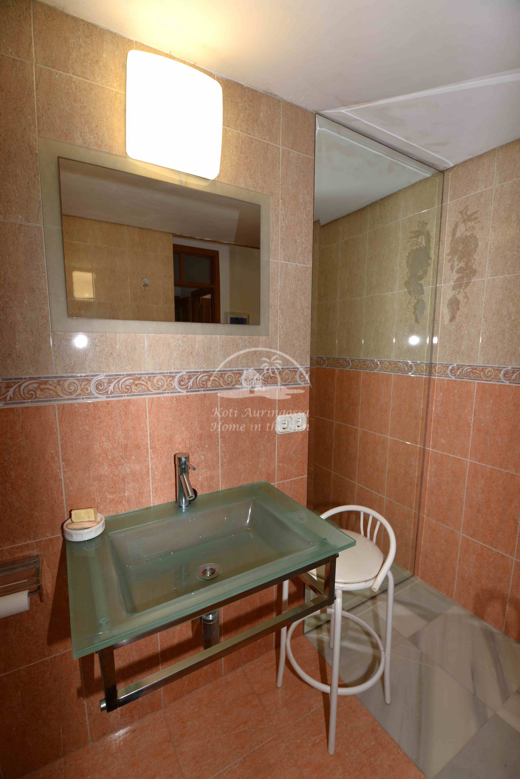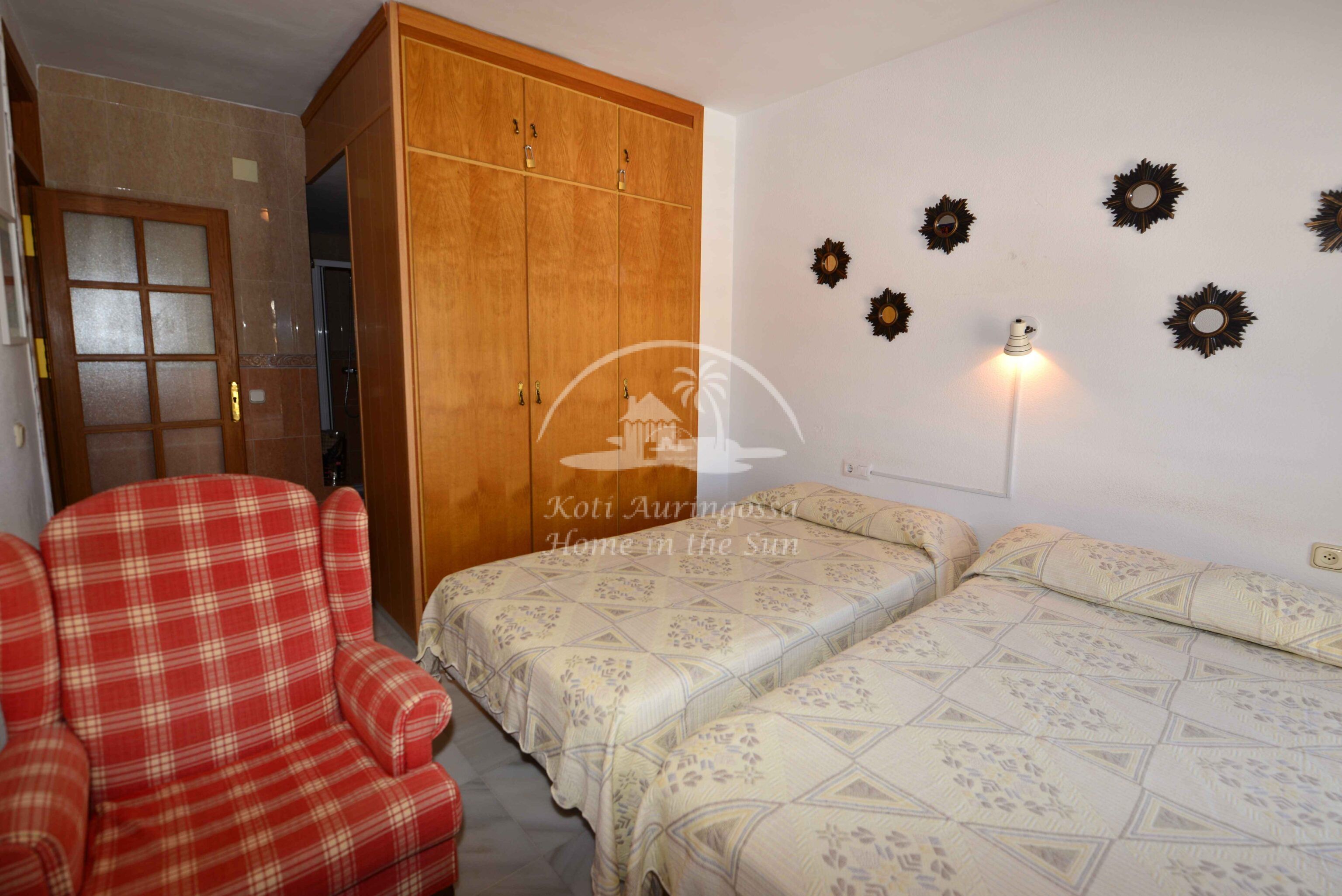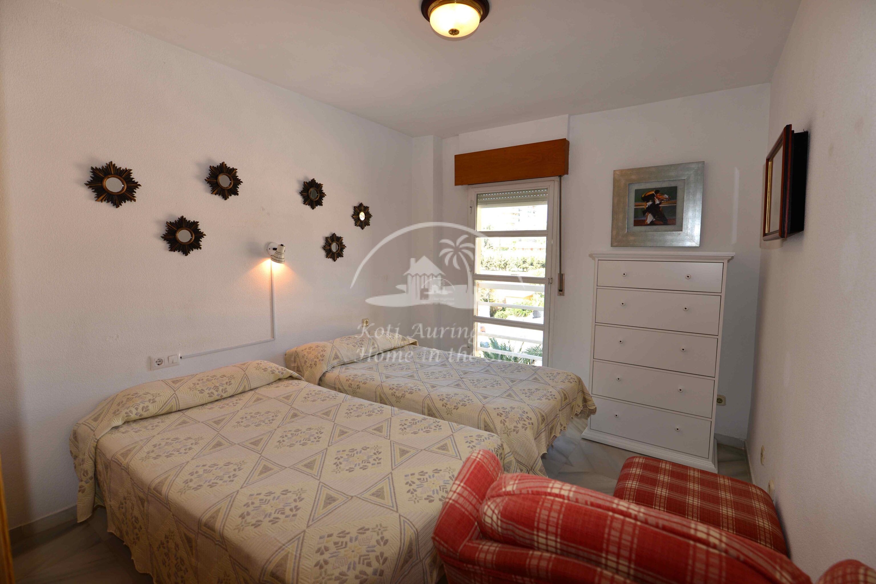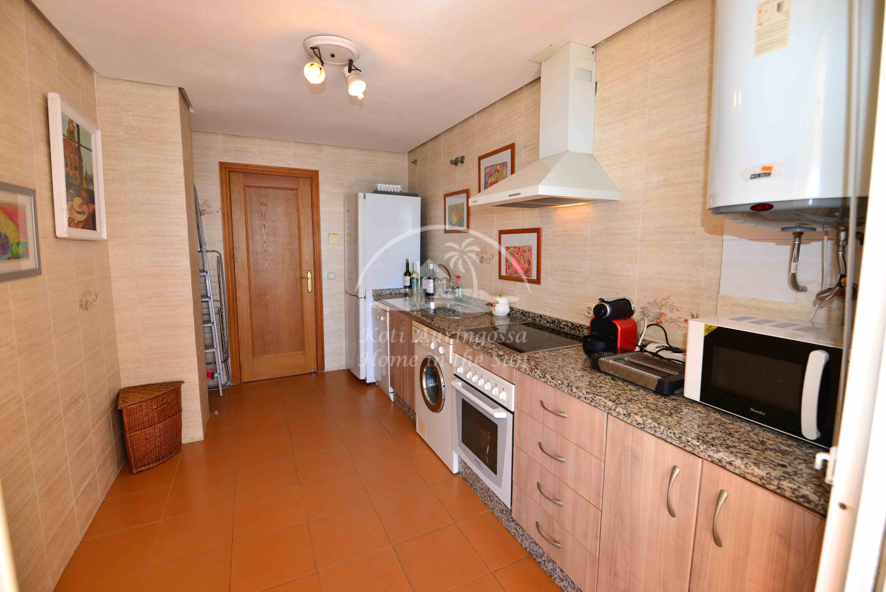 Asunto on kodikkaasti kalustettu ja sisustettu. Valoisa olohuone ja ruokailutila takalla. Olohuoneesta ja keittiöstä, on käynti etelä -länteen päin olevalle aurinkoiselle terassille, terassilta on kauniit näkymät merelle ja koko rannikolle. Erillinen tilava keittiö, jossa on myös astianpesukone. 2 makuuhuonetta.