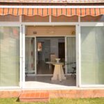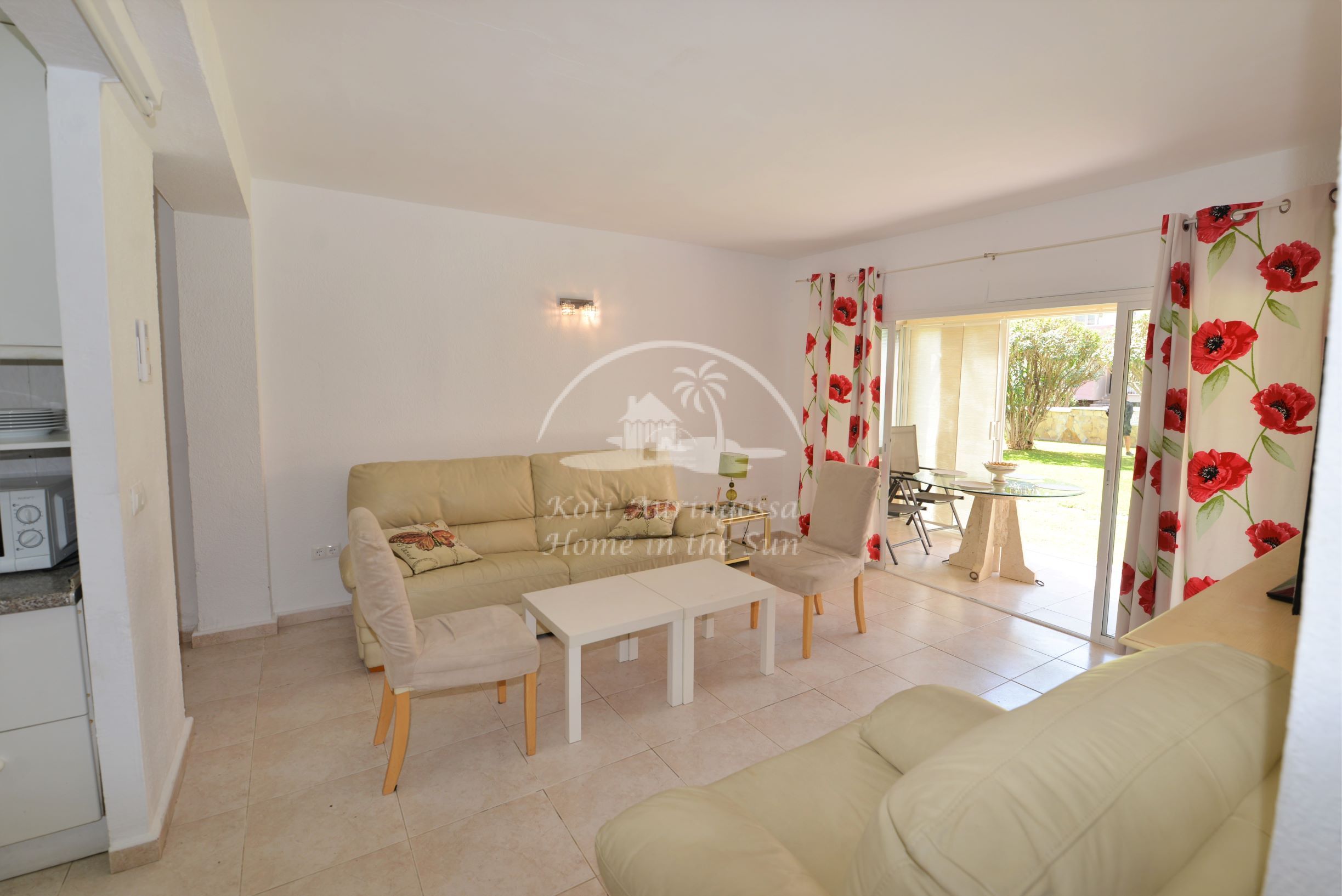 Valoisa olohuone ja ruokailutila. Koska asunto on katutasossa on olohuoneesta on käynti taloyhtiön kauniiseen vehreään puutarhaan ja uima-altaalle. Erillinen keittiö jossa sähköliesi ja uuni.