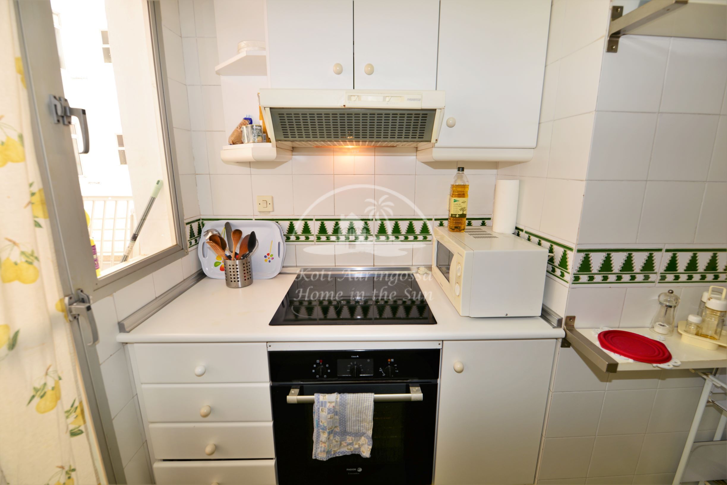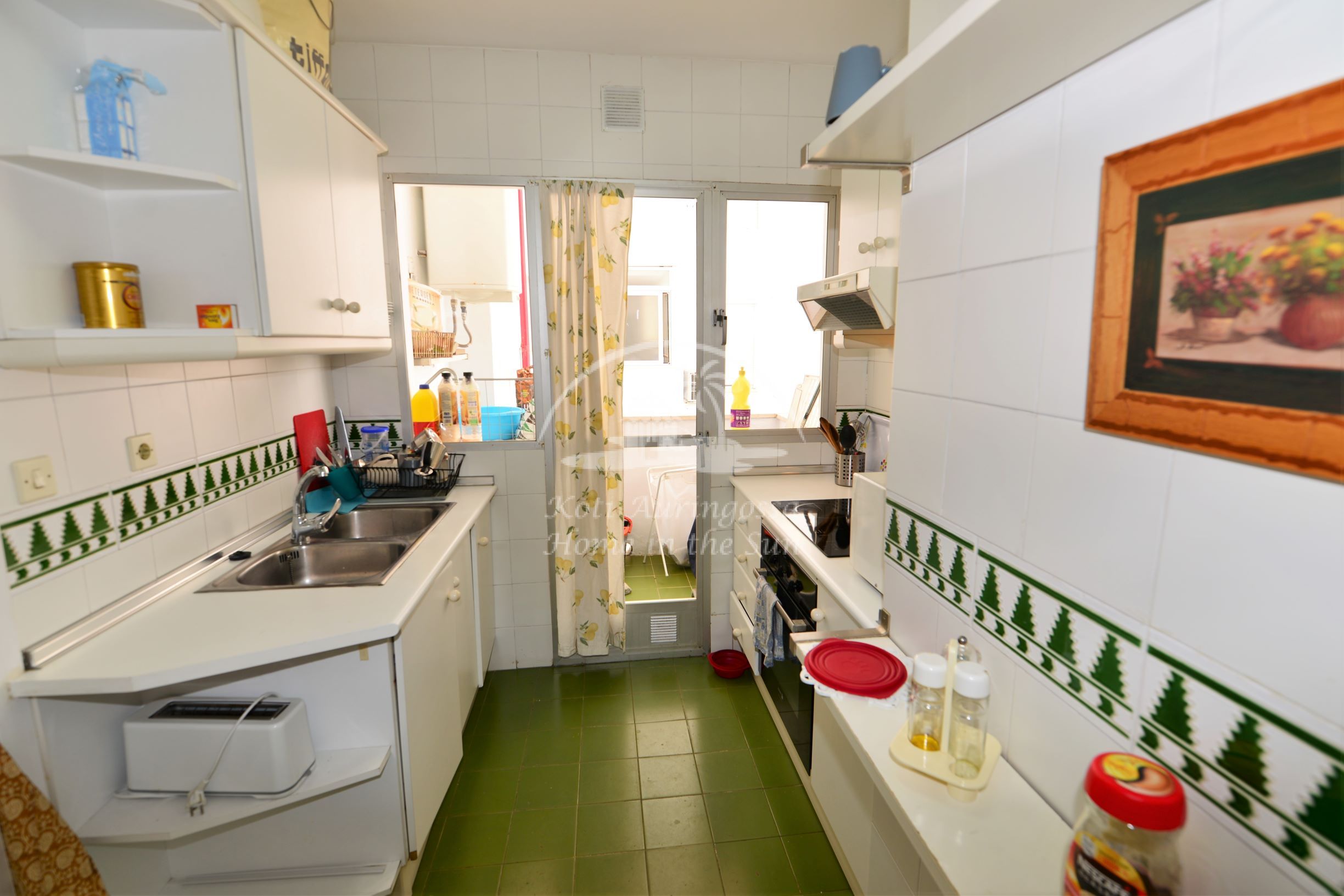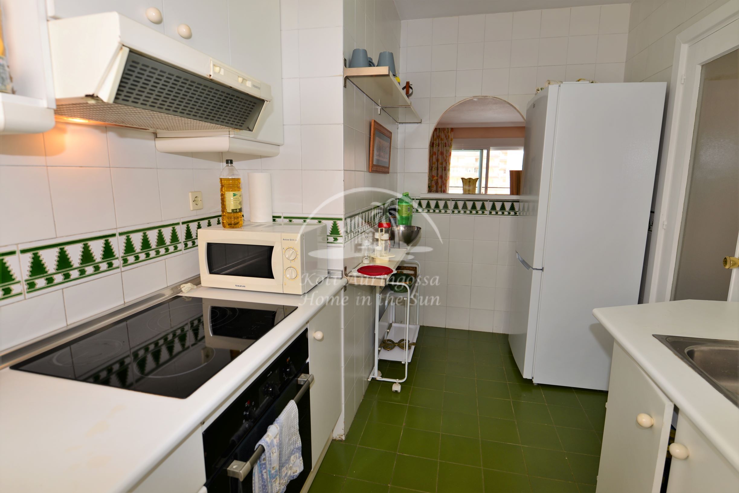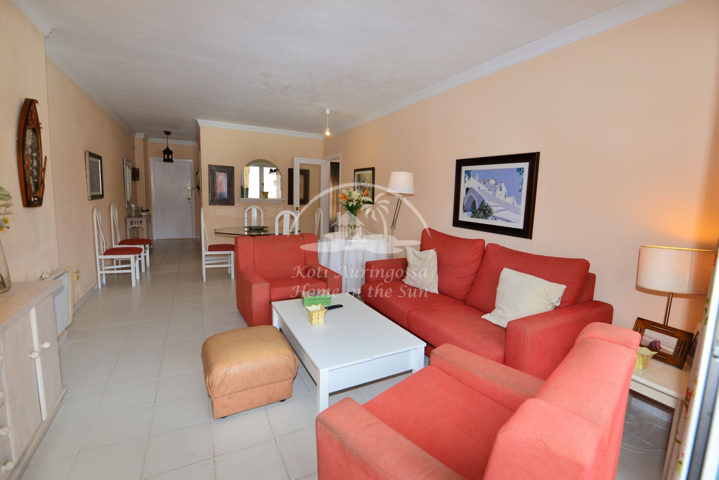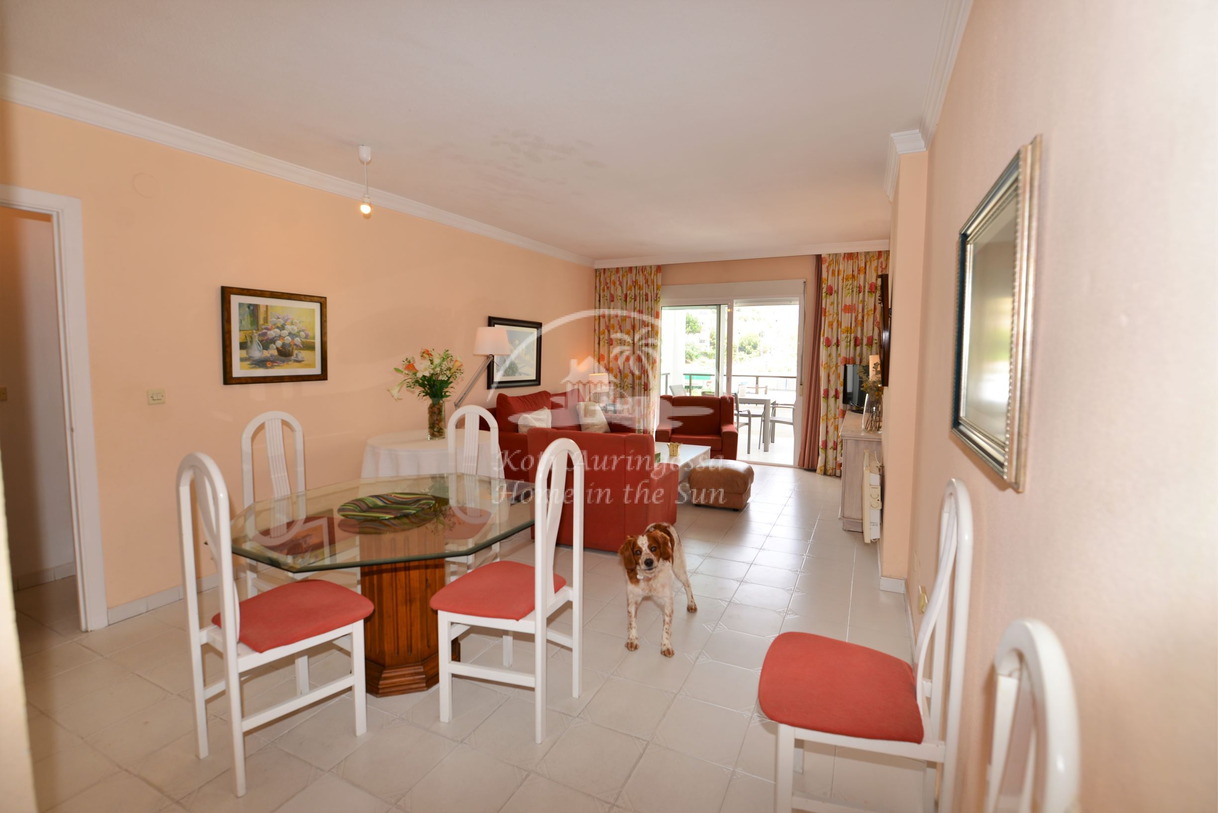 Avara valoisa olohuone ja ruokailutila. Olohuoneesta käynti itään päin olevalle reilun kokoiselle terassille, josta kivat näkymät taloyhtiön uima-altaalle. Erillinen keittiö, jossa kaikki toimii sähköllä.