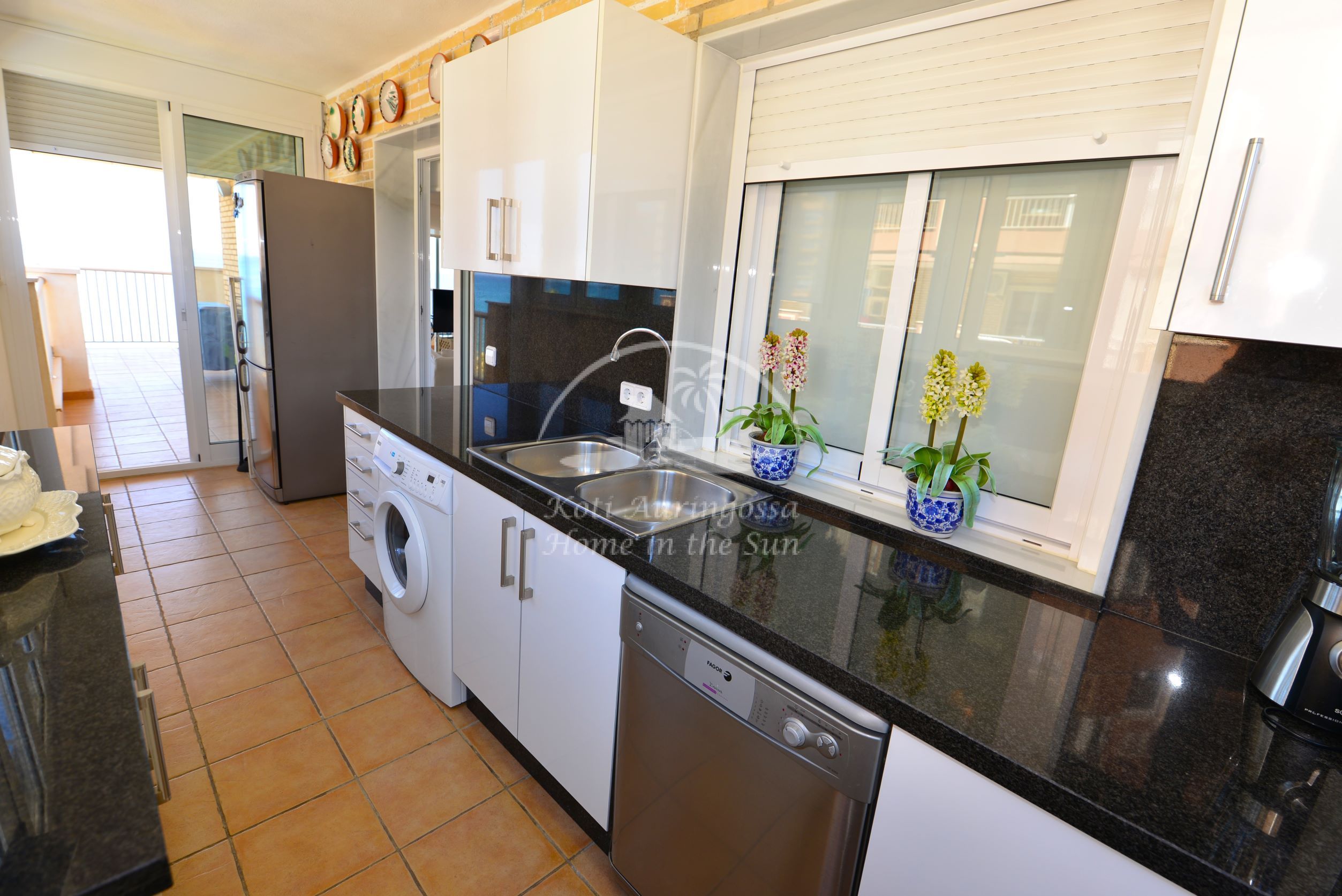 Asunto on kauniisti kalustettu ja sisustettu. Aavara valoisa olohuone ja ruokailutila, olohuoneesta käynti etelä / itään päin olevalle suurelle L muotoiselle aamu aurinkoiselle terassille, josta upeat näkymät merelle ja rantakadulle. Täydellisesti varustettu moderni valoisa keittiö jossa on myös astianpesukone. 3 makuuhuonetta, pää makuuhuoneella on oma itään päin oleva reilun kokoinen terassi, josta kivat näkymät merelle ja vuorille. 3 kylpyhuonetta. Olohuoneessa on ilmastointi lämpöpumppu. Nopea valokuitu wifi internet yhteys valmiina. Kaikki palvelut lähellä, merenrantaan 50 metriä.
